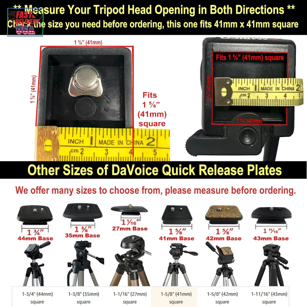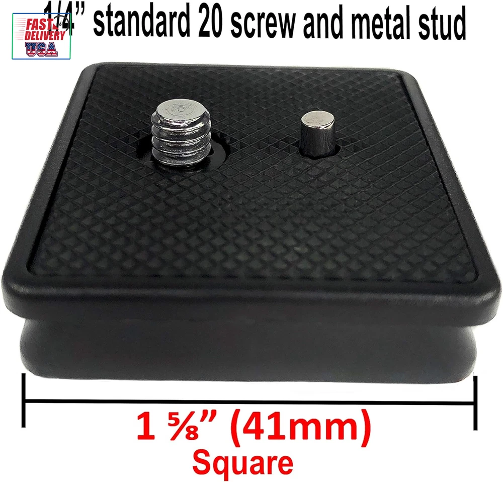 Store New Arrivals Add to Favorite View Feedback Contact 41Mm Tripod Quick Release Plate Camera Mounting Parts Replacement for Ambico V-0552 V-0554, Sunpak 7500 Pro 7500Tm 7575, Kalimar Pro-Tech V-40, Samsonite 1100 2601 Quantaray Tripod Mount 1 5/8 Description Color Black Product Dimensions 1.77 x 1.63 x 0.63 inches Country of Origin China Compatible Devices function(f) {var _np=(window.P._namespace("DetailPageProductOverviewTemplatesJava"));if(_np.guardFatal){_np.guardFatal(f)(_np);}else{f(_np);}}(function(P) { P.when('A').execute(function(A){ A.on('a:truncate:po-attribute-truncate-2:updated', function(data) { var isTruncated = !data.truncateInstance.getIfTextFits(); var seeMoreElement = document.getElementById('po-attribute-see-more-id-2'); if(seeMoreElement) { seeMoreElement.style.display = isTruncated ? '' : 'none'; } }) }); })); NOT Universal, fits certain tripods only. Bottom Base: 41mm x 41mm (1.63" x 1.63") for use with Ambico V-0550 V-0551 V-0552 V-0553 V-0554 Fluid Head Tripods (see notes, may require modification), Kalimar Pro-Tech V-40 Tripod with V40 Photo/Video Fluid Type Head, Pro-Tech V-60 & V-80 Tripod with Fluid Type Head, Sakar TR-64 Tripod, Samsonite 1100, 2600, 2601, 8801 and 8802 Tripods, Solidex Nextech VT200 Compact Tripod, Quantaray QSX 9500, QSX 9502, QSX9500, QSX9502 Tripods, Sunpak 7500 Pro, Platinum Plus 7500PG, Platinum Plus 7500 Pro, Sunpak 7500tm, Ultra 7500TM, Ultra 7575, Ultra 757, Ultra 757TM, Platinum Plus 757, Ultra 757B, Platinum Plus Ultra 757B, 9500, 9502TM, QSX 9500, QSX 9502 Tripods (Replaces Part Number 620-733 / QRP1) and only certain other models of Sunpak Tripods ** Please read the full compatible tripod list in the product description. ** See more Maximum Weight Recommendation 16 Grams Item Weight 0.04 Pounds **IMPORTANT** Base Size - 1 5/8" (41mm x 41mm square) - The tapered square base that fits into the tripod measures 1 5/8” (41mm) across in both directions – this is what fits into the opening mount of the tripod head For use with SOME Ambico V-0550 V-0551 V-0552 V-0553 V-0554 Fluid Type Head Only (SEE NOTES) Sunpak 7500 Pro 7500tm 7575, Kalimar Pro-Tech V-40, Samsonite 1100 2601, ONLY CERTAIN Quantaray tripods, see compatible tripod list in description. If you have an Ambico Fluid Head tripod V-055* READ THE NOTES UNDER THE PRODUCT PICTURE. A quick sanding adjustment may be reqired to get it to fit. 5% of the tripod heads are slightly out of spec, 20 seconds of light sanding on both beveled sides of the plate will make it fit. QR release plate mounts to the tripod mount allowing you to attach a camera, or cell phone tripod adapter, to a compatible tripod head quickly and easily. Extra QR plates allow you to conveniently swap out more than one camera or device without having to use the same tripod quick release base plate The DaVoice quick release plate features a metal pin and a high-quality metal thumb screw, unlike other brands. No tools required to tighten the screw Product Description ** IMPORTANT ** . Please measure your tripod shoe for compatibility . It should measure 1-5/8" x 1-5/8" (41mm x 41mm) to be compatible with this quick release plate. Extra QR plates allow you to conveniently swap out more than one camera or device with the same tripod DaVoice Tripod Quick Release Plate Camera Mounting Adapter Parts Replacement for use with Certain Ambico V-0552 V-0554, Sunpak 7500 Pro 7500tm 7575, Kalimar Pro-Tech V-40, Samsonite 1100 2601 Quantaray Tripod Mount 1 5/8 . ** SEE FULL COMPATIBLE TRIPOD LIST BELOW & NOTES ** The tapered square base that fits into the tripod base is 1-5/8" x 1-5/8" (41mm x 41mm) dimensions on the bottom (that fits inside the opening in the mount head of the tripod). Has 1/4 inch Camera Mounting Screw that fits most cameras and camcorders and cell phone tripod adapters. QR plates attach to the tripod mount on your camera and allow you to quickly and easily attach and detach your camera or device from a compatible tripod head. COMPATIBLE TRIPOD LIST ** Please measure the tripod head to ensure compatibility even if your tripod is listed here ** 1-5/8" (41mm x 41mm) may fit: MAY REQUIRE MODIFICATION TO FIT ** SEE NOTE BELOW. ** Ambico V-0550 V-0551 V-0552 V-0553 V-0554 Fluid Head Tripods ONLY ( Has bubble level on tripod head, see pictures for reference ) PLEASE MEASURE your Ambico tripod head, see pictures for example of correct tripod and the measurements. This is for the FLUID TYPE HEAD ONLY ( Does not fit the Non-Fluid Head ) ** AMBICO TRIPODS - PLEASE NOTE ** There is about a 5% possibility you will find the plate is BARELY too big and does not fit the Ambico Tripods listed here, but do not worry. By "barely too big" I mean just a "hair" too tight to fit. The problem is due to a "bad" batch of Ambico tripods with a manufacturing specification that was off slightly. The easy fix is to to file off / sand off a tiny bit of the base of the plate (on the 2 beveled sides, not the straight sides), or alternately do this to the tripod opening where the plate goes. By removing just the slightest amount of plastic, it will fit into the tripod head and work great. Kalimar Pro-Tech V-40 Tripod with V40 Photo/Video Fluid Type Head, Pro-Tech V-60 & V-80 Tripod with Fluid Type Head Kodak older tripods that measure 41mm x 41mm tripod head opening ONLY Sakar TR-64 Tripod Samsonite 1100, 2600, 2601, 8801 and 8802 Tripods Stitz Video CV550Q Tripod Solidex Nextech VT200 Compact Tripod Quantaray QSX 9500, QSX 9502, QSX9500, QSX9502 Tripods OLDER Sunpak 5200D & 5200DLX Tripod ( 1st Generation ONLY - See reference picture at top of page, PLEASE MEASURE carefully as there were DIFFERENT models labeled 5200D and 5200DLX and this quick release plate ONLY FITS THE OLDER VERSION ) Please be sure your tripod head looks like the photo and measures in the receptacle 41mm / 1.6" wide (Replaces Part Number 620-762 / 620-733) OLDER Sunpak Platinum Plus 5858D Tripods ( 1st Generation ONLY - See reference picture at top of page, PLEASE 