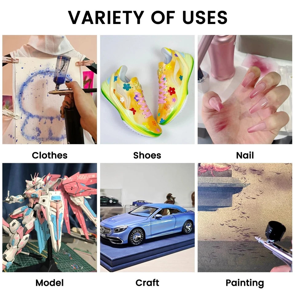 About this item AIRBRUSH PAINT SET: ARTME airbrush paint kit has 42 vivid colors: 29 classic opaque colors, 5 Neon Colors, 8 Metallic colors and 3 Thinner. Perfect as a rich color airbrush paint set, totally meets most of your painting needs with brilliant visual color results. Each bottle is 20 ml/0.7 fl oz. HIGH-QUALITY PAINT: Our airbrush paints are made with high-quality pigment, it's non-toxic, waterproof, quick-drying, no fade, and with excellent flow, won't block your precious airbrush. Our acrylic airbrush paint is water-based, it’s easy to clean up your airbrush with water and soap. READY TO SPRAY: ARTME airbrush paint uses a better formula with proper ratio. Every color has wonderful airbrush flow characteristics. You can use the paints directly, they can match well with your airbrush with a smooth consistency and won’t clog it up. Airbrush thinner can improve color flow through small airbrushes. MULTI-USAGE: ARTME acrylic airbrush paints are designed for permanent results on most mixed-media & textile surfaces. Achieve beautiful results on paper, canvas, model, wood, fabric, leather, plastics, metals, ceramic, and so on. It’s perfect for artists, hobbyist, and DIY enthusiasts. USING TIPS: It's normal for the paint to have slight sedimentation. Remember to shake the paint well before use to ensure a consistent texture. Recommended to add 1-2 drops of the included thinner to 10 drops of paint if the air flow of the compressor is below 20 L/min. (When the air flow above 20 L/min no need thinning)