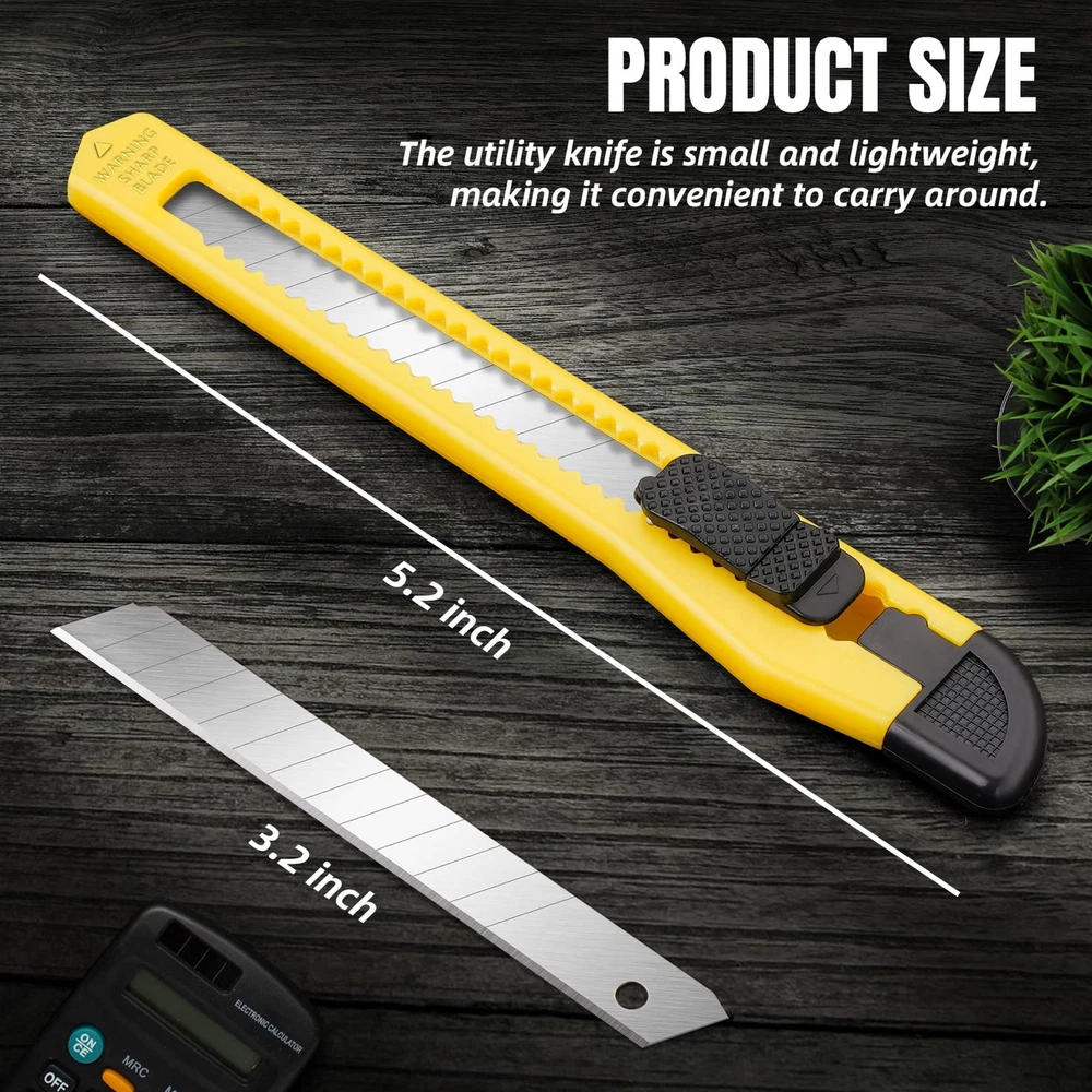 ▶【BOX CUTTER RETRACTABLE】 You could press the slider of the box opener tool to control the extension and retraction of the blade. And you could even operate it with one hand, which is very convenient and quick to use. ▶【HIGH CARBON STEEL BLADE】 The utility knife blade is made of high quality steel so it has absolute sharpness. And the blade can be broken by 12 sections, which means that the service life of a box cutter is 12 times that of an ordinary boxcutter. ▶【AUTO-LOCK DESIGN】 The slider of the box cutter knife has a locking function, so the blade will not retract when cutting hard objects, making your work easier. ▶【WORKS GREAT】 The box opener can be used not only for unpacking, but also for cutting cardboard, plastic, wallpaper, car film, rope, rubber, tape. In addition, it also can be used for crafting. ▶【GREAT VALUE SET】 You will receive 42 Pack multicolor 9mm wide box knives that you can use in your home, kitchen, garage, warehouse, office, school, studio, sewing room or in your car.