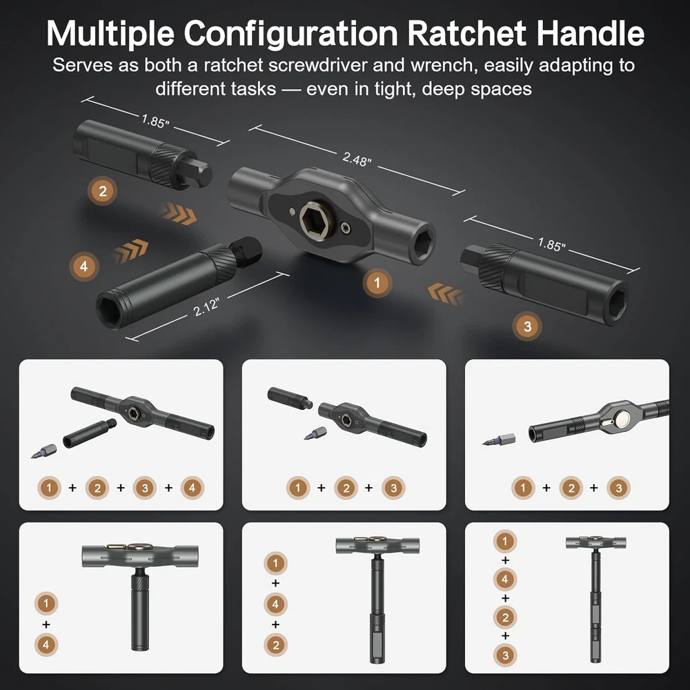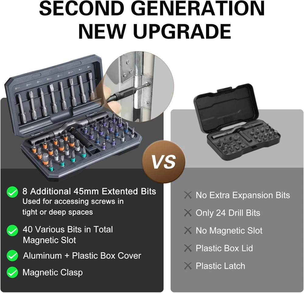 Flexible Ratchet Handle Design - The handle features a detachable structure, allowing for various combinations and multifunctional adjustments to fit different situations, like using in narrow spaces. The ergonomic aluminum handle design is lightweight yet rugged, crafted from hot-forged aluminum alloy with high-precision CNC molding for durability and oxidation resistance. Its lightweight construction ensures ease of handling, making it perfect for extended use without fatigue. Effortless Ratcheting Mechanism - Equipped with a 6.2-degree ratchet and 58-tooth forward-reverse ratchet mechanism, offering 80% effort savings. With a 50N.m torque, Bomivoi ratcheting screwdriver set tool makes it simple to tighten or loosen screws without wrist adjustments, saving time and effort in every repair job. 42-in-1 Screwdriver Set - Bomivoi handy screwdriver set includes 40PCS S2 magnetic chromium-molybdenum alloy steel bits, featuring a 6.35mm (1/4") diameter, one handle, and a magnetic slot. the bit driver set comprises 32 short bits (25mm) and 8 long bits (45mm), including various types like PH, SL, Torx, Hex, PZ, and U-shape. Ideal for home, work, DIY projects, professional task, and repairs, providing the right tool for any task. Strong Magnetic & Easy Identification - Features a magnetic handle for secure bit placement and a convenient magnetic slot within the case to recharge the bits’ magnetism as needed. Color-coded bit rings ensure quick and easy identification, improving work efficiency and simplifying organization. This magnetic screwdriver set effectively tackles various tasks, including home appliance repairs, home furniture repairs, and automotive maintenance. Compact Case, Perfect Gift Choice - Housed in a sturdy, compact storage case (6.6 x 3.7 x 1.6 inches, 15.6 oz), this mini screwdriver set is an excellent gift for professionals and DIY enthusiasts alike. Whether for furniture, electronics, appliance, computers, motorcycle or bike repairs, it's a practical present for Christmas, holidays, birthdays, Father's Day or any special occasion. Product Description Bomivoi compact 42-piece ratchet screwdriver set designed for versatility, durability, and efficiency, ideal for a wide range of repair and DIY tasks. Crafted from super-hard hot-forged aluminum alloy and precision CNC molded for durability and oxidation resistance, the handle offers a comfortable grip, ensuring you won't tire during extended use. This magnetic screwdriver set includes 40PCS S2 steel bits, featuring a 6.35mm (1/4") diameter, designed to meet professional needs as well as everyday tasks at home, work, DIY projects, and maintenance, allowing for effortless use in any situation. This tool effectively handles a variety of tasks, including home appliance repairs, furniture assembly, computer, motorcycle, bicycle, and automotive repairs. The compact storage case is designed for easy transport, making it a practical choice for on-the-go use.