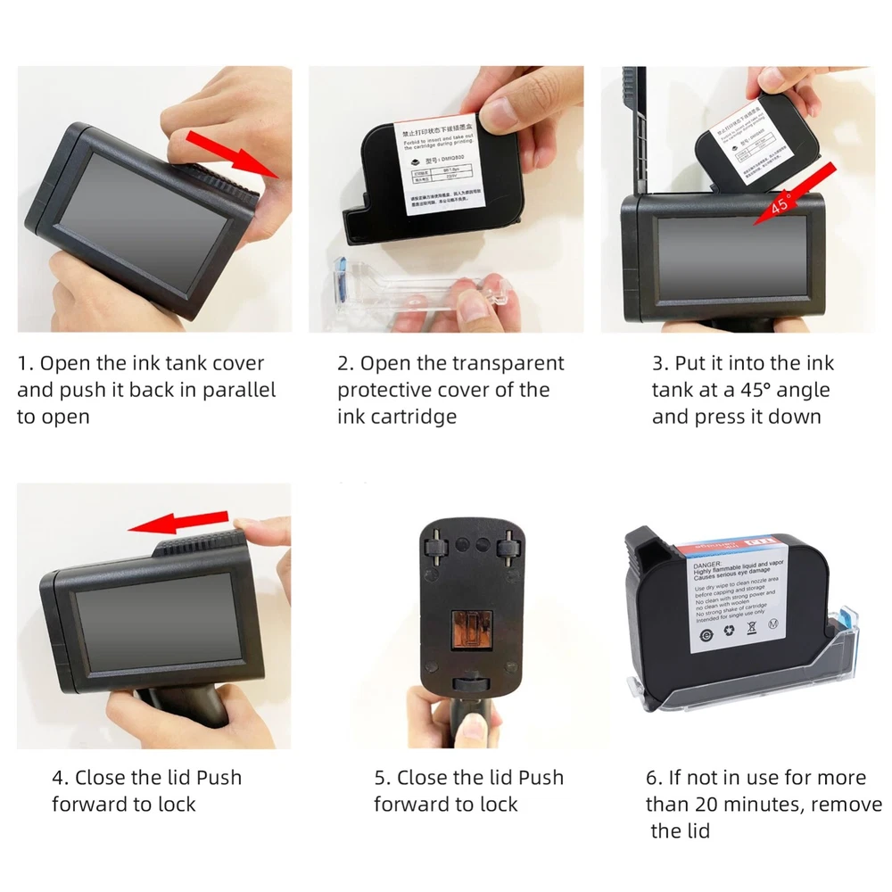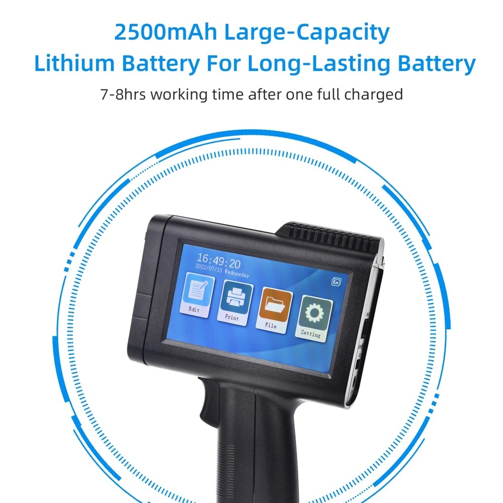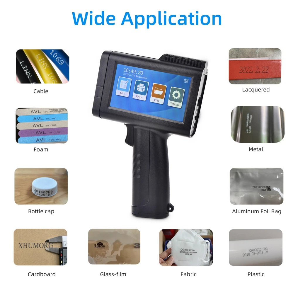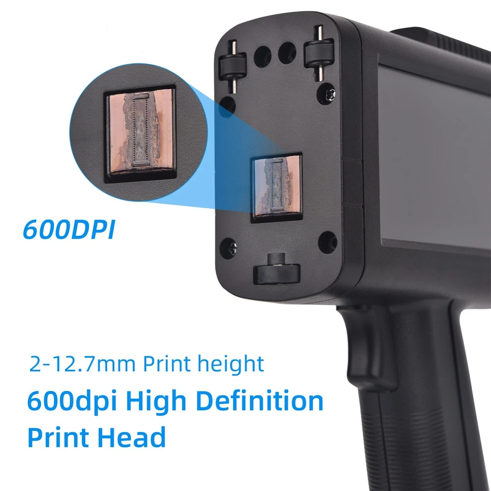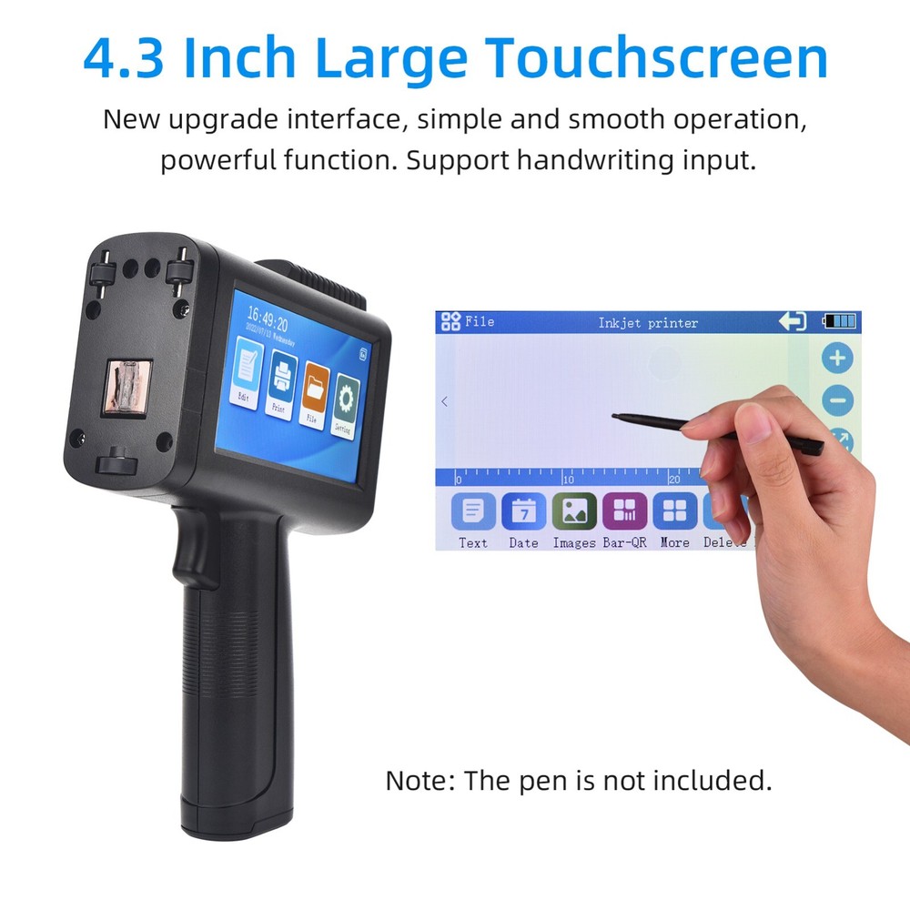 Portable HD Handheld Inkjet Printer with 4.3 Inch Touchscreen Intelligent Barcode Printer Support Logo Date QR Code Symbols Batch Number USB Interface for Variable Data With Quick-Drying Ink Cartridge Features 1、Intelligent Inkjet Printer: 600DPI high definition printing, 2-12.7cm font height, real restore image effect. Built-in RtOS embedded intelligent operating system, operator localization, system stability. 2、Professional Configuration: 4.3-inch touchscreen, image display clearly, touch-sensitive. Upgraded interface, simple and smooth operation. Available in 24 languages (Support simplified Chinese, traditional Chinese, English, French, Russian, Japanese, Spanish, Arabic, Korean, German, Italian, Polish, Dutch, Vietnamese, Czech, Swedish, Danish, Greek, Finnish, Turkish, Persian, Bengali, etc) 3、Practical Design: 360-degree printing can be printed on cylindrical objects such as mugs. The printing content can be edited or modified directly on the machine without computer connection. 4、ABS material, lightweight and comfortable to hold. With USB port to insert flash drive for more text font, picture, logo and TXT file. 5、Portable \u0026 Multifunctional: Built-in 2500mAh chargeable battery, can keep working for about 9 hours to meet daily heavy printing demands. It can print numbers, barcodes, logo, trademarks, words, dates and label to cardboard, , cable, plastic, pipe, electronic components and aluminum material, etc. 6、High Quality Ink Cartridge: imported ink cartridge is adopted, which is quick-drying, with strong adhesion, waterproof, fireproof and friction resistant. Large capacity, can print about 300,000 characters. Specification: Model: M10 Color: Black Size: 21.2 x 5 x 14cm Weight: 447g/15.7oz Battery: 7.4V 2500mAh Nozzle: TIJ2.5 hot foam nozzle Engine: print driver module Print Distance: 2-5mm Word Height: Single printing 2-12.7mm adjustable Precision: Up to 600DPI HD Quality Processor: Quad-core CPU, 1.5ghz Printing Speed: 50m/min Cartridge Capacity: 45ml Function: Chinese, English, numbers, symbols, LOGO, QR, bar code, variable data Application: Cardboard, carton, stone, pipe, cable, metal, plastic, electronic components, auto parts Languages: English, Russian, French, Arabic, Traditional Chinese, Korean, Danish, Vietnamese External Interface: USB, 3.5mm Jack Interface Package Size: 30 x 23 x 17cm/11.8 x 9 x 6.7in Package Weight: 1623g/57oz Notes: 1. If the inkjet printer is not used for more than 20 minutes, the ink cartridge must be removed from the machine, and the ink cartridge must be covered to protect the clip 2. ① If there is wire drawing or printing defects during the printing process, please use a paper towel or a soft cloth with water with a concentration of more than 95% to wipe the nozzle. ② Or use a paper towel against the nozzle and shake it up and down. ③There is a nozzle setting in the settings, find the nozzle selection, switch the left nozzle or the right nozzle. 3. Please keep the product and ink away from children. If ink accidentally gets into your eyes, please wash with plenty of water immediately. Packing List: 1 x Storage Box 1 x Inkjet Printer with Battery 1 x Ink Cartridge 1 x Charger 1 x U-Disk 1 x Positioner Plate 1 x User Manual