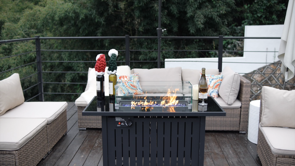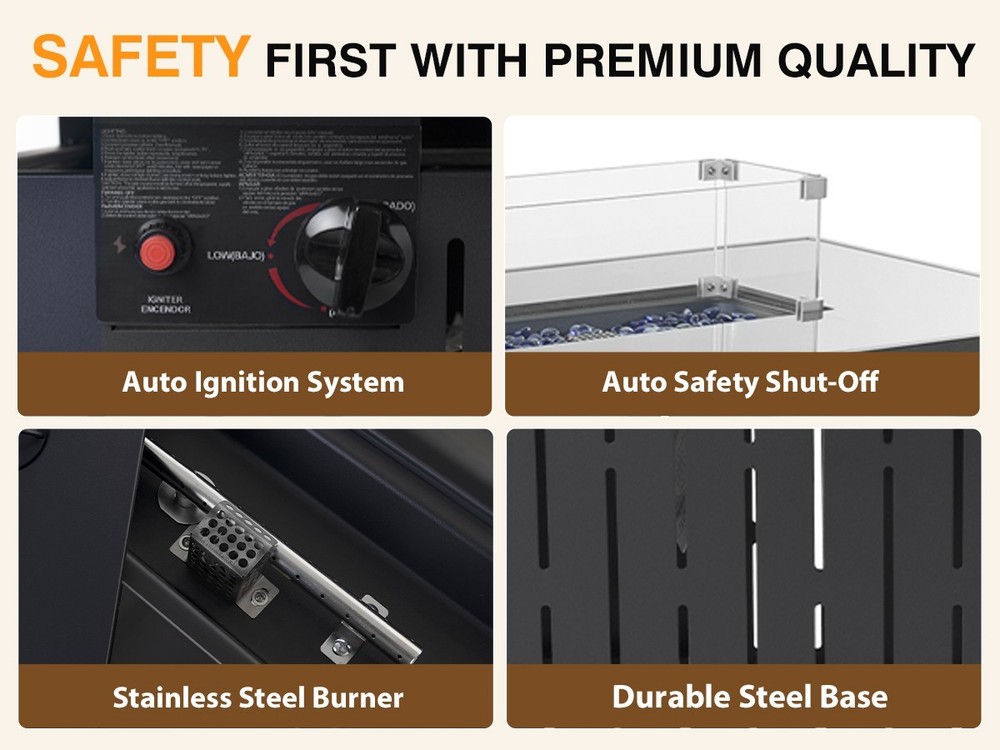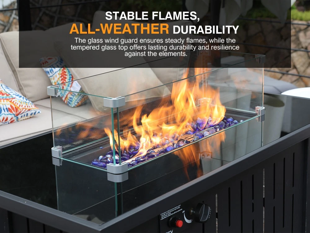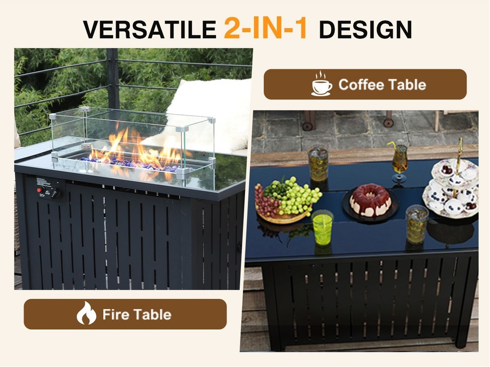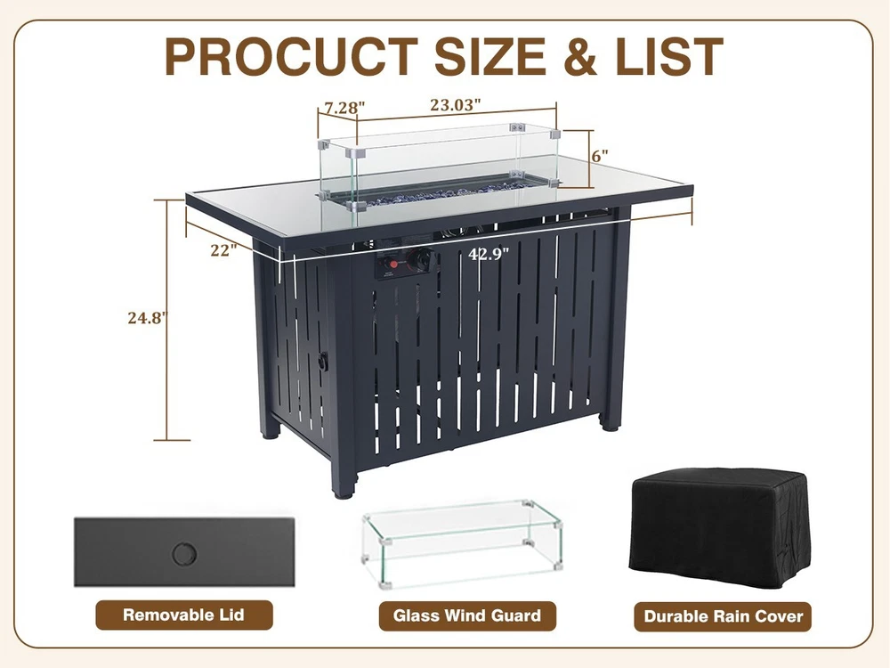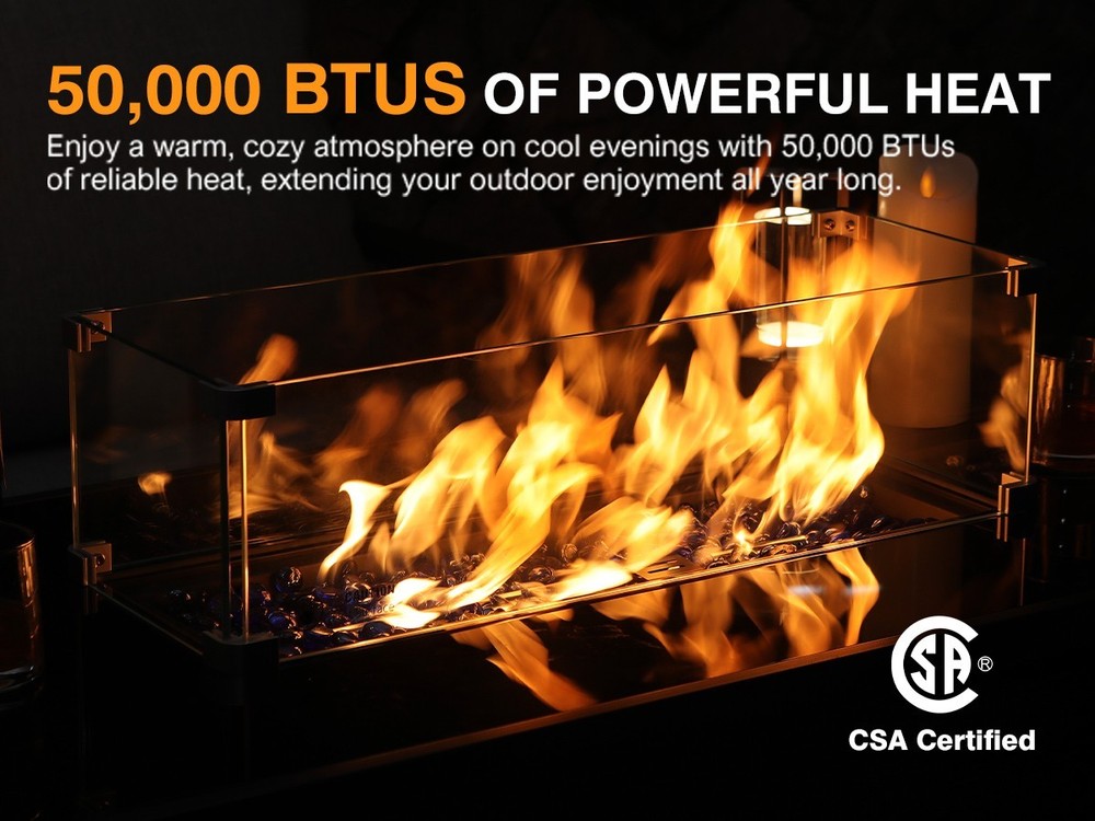 【Sleek Fire Pit Table Design with Versatile Use】Elevate your patio or backyard with our rectangle propane fire pit table, designed with a tempered glass top for a modern touch. This stylish outdoor firepit table for patio doubles as a coffee or side table with its removable lid, blending elegance and functionality for gatherings or quiet nights 【50,000 BTU Heat Output & Reliable Safety】Stay cozy with a gas firepit for outside patio that delivers 50,000 BTUs of steady heat. The advanced electronic ignition and emergency shutoff keep this CSA-certified fire pit propane safe to use in any season, ensuring a comfortable, worry-free outdoor experience 【Durable Build for All-Season Use】Crafted with a tough glass top and sturdy metal base, this outdoor gas fire pit table combines durability with refined style. Engineered to resist sun, rain, and heat, it’s a long-lasting choice for those seeking patio fire pit tables that stay beautiful year-round 【Complete Fire Table Set with Accessories】Everything you need is included: glass fire beads, a rain cover, and a glass wind guard to steady the flames. The removable lid transforms the propane firepit table into a usable tabletop, offering convenience and versatility among outdoor fire tables for backyard entertaining 【Effortless Assembly & Perfect Fit】Designed for easy setup, this fire pit propane for outside patio comes with clear instructions and all necessary hardware. Once assembled, its dimensions (22"D x 42.9"W x 24.8"H) fit seamlessly on patios, decks, or gardens. A dependable gas fire pit table made to enhance any outdoor space