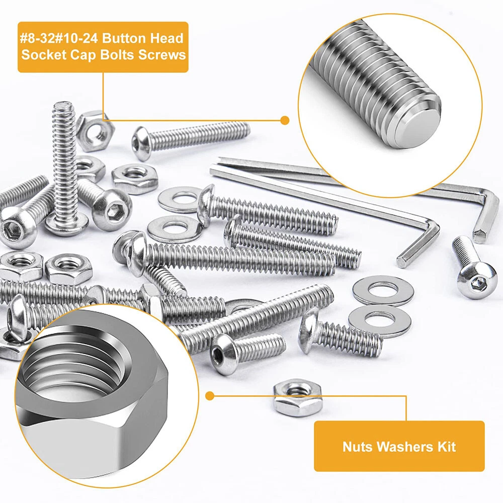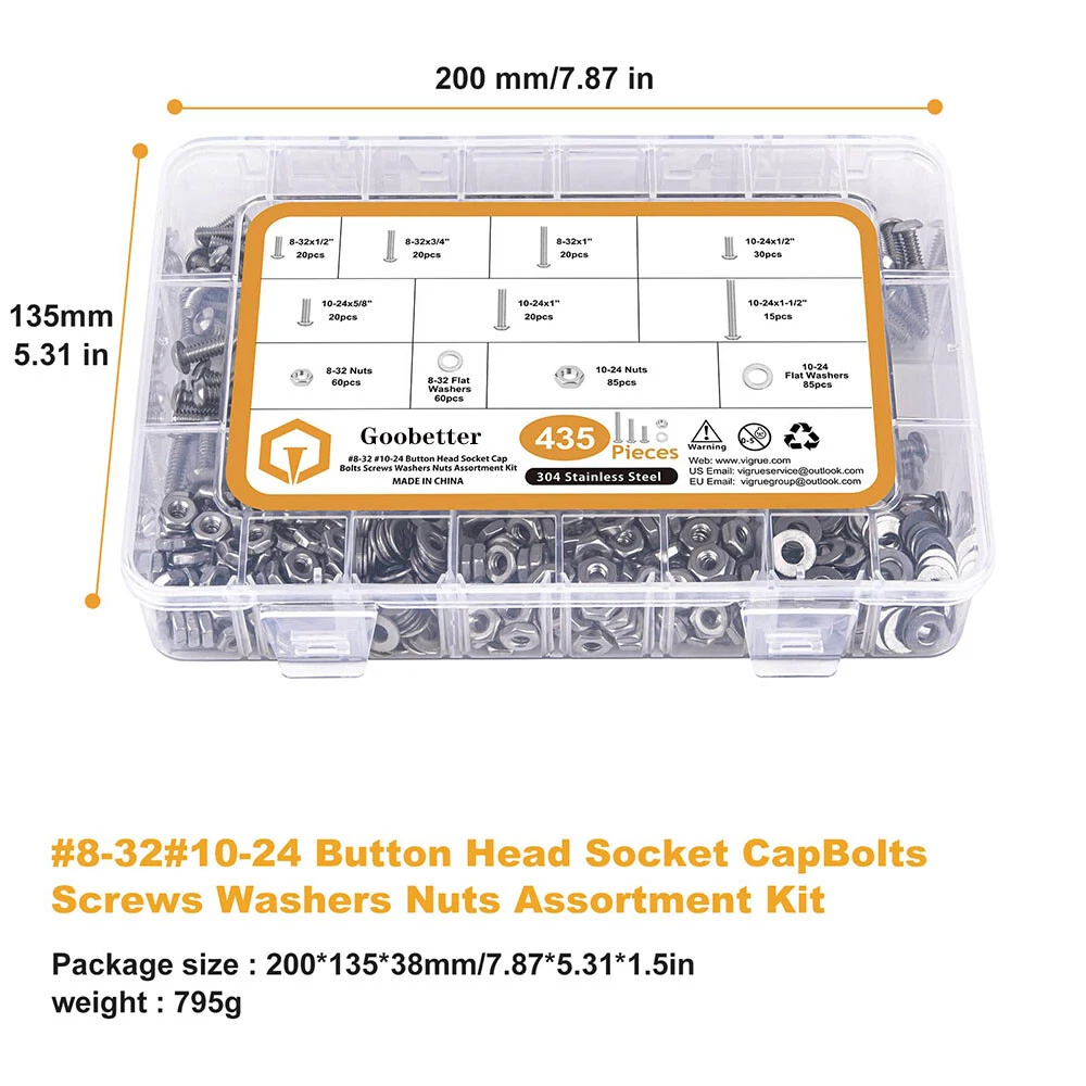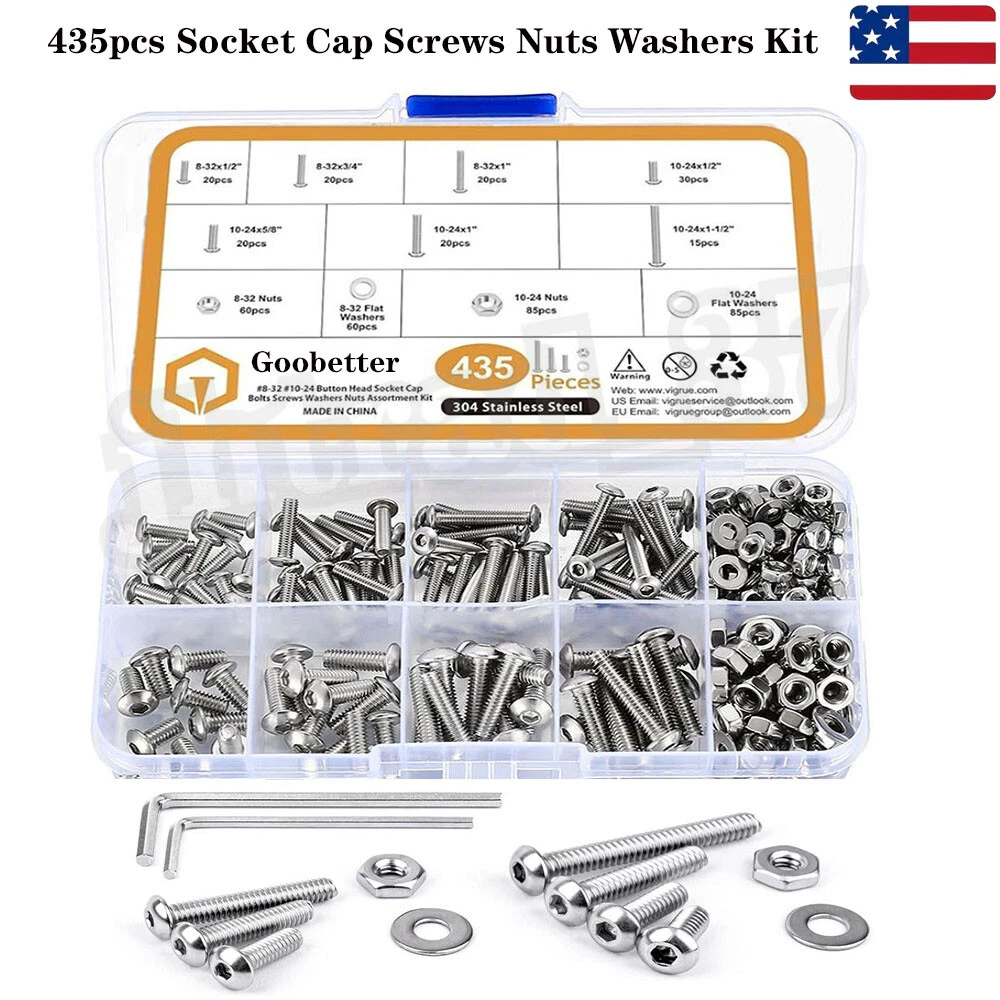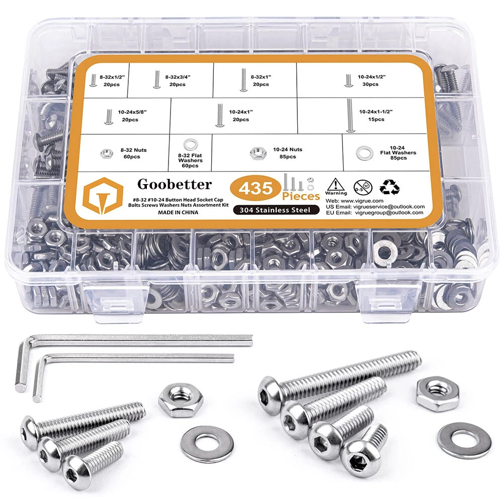 435pcs Button Head Screws Hex Nuts And Washers Kits Stainless Steel Socket Bolts Features : -All hardware nuts bolts and washers are made of high-quality stainless steel, which is high-strength, corrosion-resistant, rust-proof, sturdy, and can maintain good performance in harsh environments and is durable. -Assorted bolts and nuts are compact in design and uniform in force, with precise deep threads, not easy to deform and slip during work; nuts and washers can increase surface contact area, reduce wear, protect screw bolts and other fasteners. -All stainless steel socket head cap bolts, nuts and washers are placed in a transparent plastic box with size labels, neatly arranged so that you can quickly pick the size you need, easy to use, find and carry, not easily confused. - Our assortment of hexagon socket screws can be widely used in home and office equipment, communication equipment, ship assembly, machinery industry, furniture, automobile and motorcycle maintenance, DIY, etc. Ideal for professionals, repairmen, hobbyists, landlords, carpenters, construction workers. Specification: -Material: 304 stainless steel -Drive Type: allen hex socket Size:#8-32,#10-24 -Quantity: 435pcs Package Includes: 20pcs #8-32 x 1/2 Button Head Screws 20pcs #8-32 x 3/4 Button Head Screws 20pcs #8-32 x 1" Button Head Screws 30pcs #10-24 x 1/2" Button Head Screws 20pcs #10-24 x 5/8" Button Head Screws 20pcs #10-24 x 1" Button Head Screws 15pcs #10-24 x 1-1/2" Button Head Screws 60pcs #8-32 Hex Nuts 60pcs #8-32 Flat Washers 85pcs #10-24 Hex Nuts 85pcs #10-24 Flat Washers About us Payment Delivery details Terms of sales Contact us About us 1.Hello Dear Customer and Welcome to GooBetter !: we have been engaged in online sales of hardware fasteners for more than 10 years, if you need a large number of or customized hardware products, please contact us, we can provide good prices and better service. 2.If you are satisfied with the products, I expect you can leave us positive feedback. 3.If you have any problems or be not satisfied with them, please feel free to contact us, we will reply to you within 24 hours. Payment 1.We accept multiple payment methods supported by the Ebay platform. 2.Items will go to post within 1-2 business days after payment confirmed. 3.Please leave note when making the payment if you have any special request (colors/size). Delivery details 1.We use USPS , and we are committed to providing our customers with a better shipping service. 2.We want every customer to receive their purchased products as soon as possible.If you do not receive your shipment in time( because transit time is highly depended and provided by Postal Service (except weekends and holidays)).Please contact us at the first time, we will give you a satisfactory answer. Terms of sales 1.If you are not satisfied with the item, please contact us. 2.We will offer a Full Refund to you when we receive your returned item. 3.Any problem, please feel free to contact us. 4.We are committed to providing better products and services to our customers. Contact us 1.Normally, we leave positive feedback for you once payment received. We are also hope that you can do me the same. Your support will keep us moving forward forever. 2.If you are not satisfied when you receive your item, please return it within 30 days for a replacement or money back. Please contact me before you return it. 3.If the shipping delay happened, we’re willing to pay refund or resend new item(s).