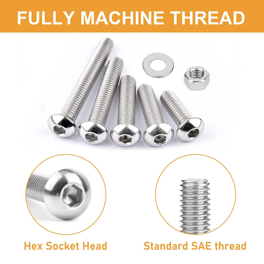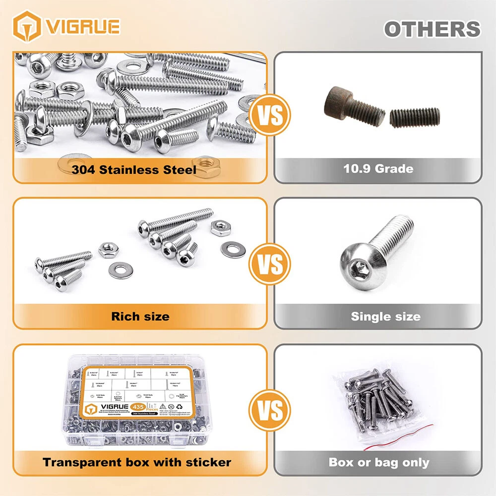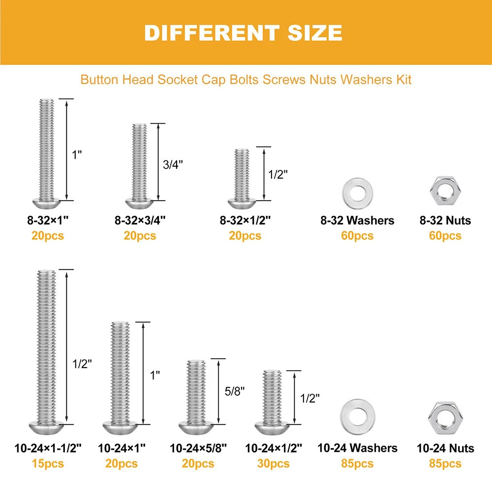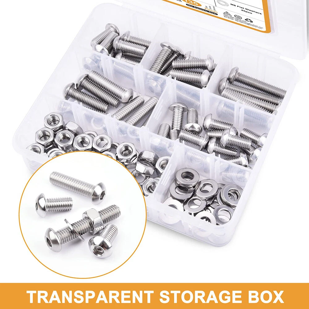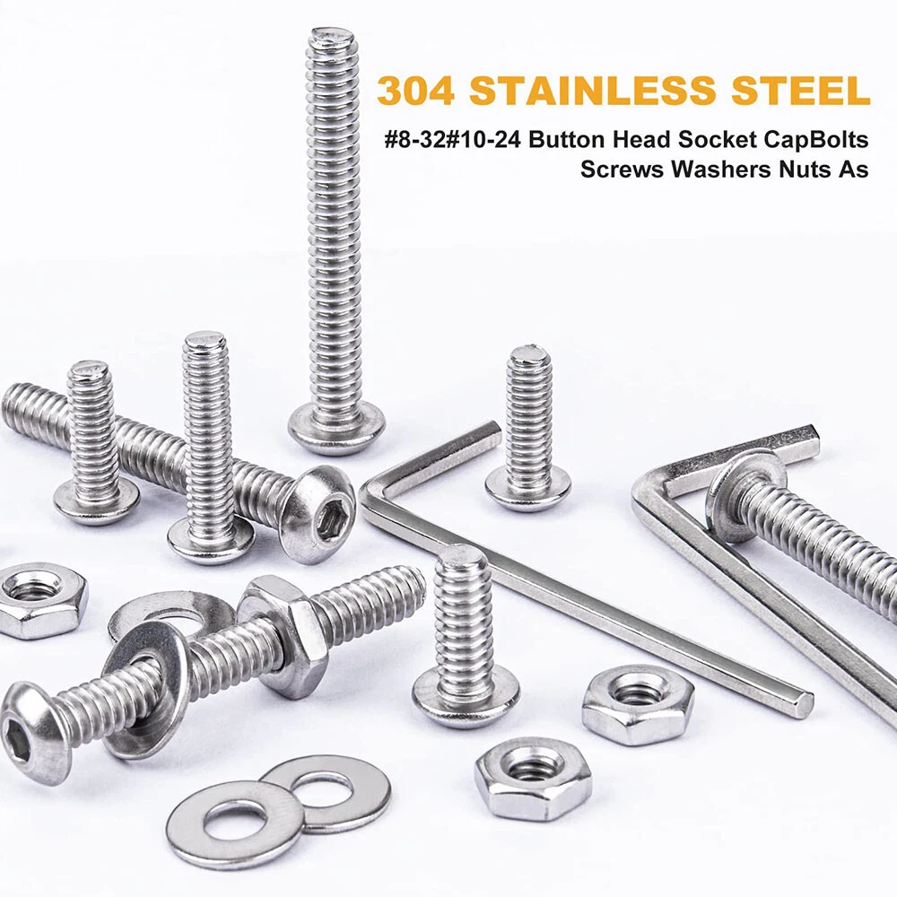 435pcs Button Head Screws Hex Nuts And Washers Kits Stainless Steel Socket Bolts Features : -All hardware nuts bolts and washers are made of high-quality stainless steel, which is high-strength, corrosion-resistant, rust-proof, sturdy, and can maintain good performance in harsh environments and is durable. -Assorted bolts and nuts are compact in design and uniform in force, with precise deep threads, not easy to deform and slip during work; nuts and washers can increase surface contact area, reduce wear, protect screw bolts and other fasteners. -All stainless steel socket head cap bolts, nuts and washers are placed in a transparent plastic box with size labels, neatly arranged so that you can quickly pick the size you need, easy to use, find and carry, not easily confused. - Our assortment of hexagon socket screws can be widely used in home and office equipment, communication equipment, ship assembly, machinery industry, furniture, automobile and motorcycle maintenance, DIY, etc. Ideal for professionals, repairmen, hobbyists, landlords, carpenters, construction workers. Specification: -Material: 304 stainless steel -Drive Type: allen hex socket Size:#8-32,#10-24 -Quantity: 435pcs Package Includes: 20pcs #8-32 x 1/2 Button Head Screws 20pcs #8-32 x 3/4 Button Head Screws 20pcs #8-32 x 1" Button Head Screws 30pcs #10-24 x 1/2" Button Head Screws 20pcs #10-24 x 5/8" Button Head Screws 20pcs #10-24 x 1" Button Head Screws 15pcs #10-24 x 1-1/2" Button Head Screws 60pcs #8-32 Hex Nuts 60pcs #8-32 Flat Washers 85pcs #10-24 Hex Nuts 85pcs #10-24 Flat Washers About us Payment Delivery details Terms of sales Contact us About us 1.Hello Dear Customer and Welcome to GooBetter !: we have been engaged in online sales of hardware fasteners for more than 10 years, if you need a large number of or customized hardware products, please contact us, we can provide good prices and better service. 2.If you are satisfied with the products, I expect you can leave us positive feedback. 3.If you have any problems or be not satisfied with them, please feel free to contact us, we will reply to you within 24 hours. Payment 1.We accept multiple payment methods supported by the Ebay platform. 2.Items will go to post within 1-2 business days after payment confirmed. 3.Please leave note when making the payment if you have any special request (colors/size). Delivery details 1.We use USPS , and we are committed to providing our customers with a better shipping service. 2.We want every customer to receive their purchased products as soon as possible.If you do not receive your shipment in time( because transit time is highly depended and provided by Postal Service (except weekends and holidays)).Please contact us at the first time, we will give you a satisfactory answer. Terms of sales 1.If you are not satisfied with the item, please contact us. 2.We will offer a Full Refund to you when we receive your returned item. 3.Any problem, please feel free to contact us. 4.We are committed to providing better products and services to our customers. Contact us 1.Normally, we leave positive feedback for you once payment received. We are also hope that you can do me the same. Your support will keep us moving forward forever. 2.If you are not satisfied when you receive your item, please return it within 30 days for a replacement or money back. Please contact me before you return it. 3.If the shipping delay happened, we’re willing to pay refund or resend new item(s).