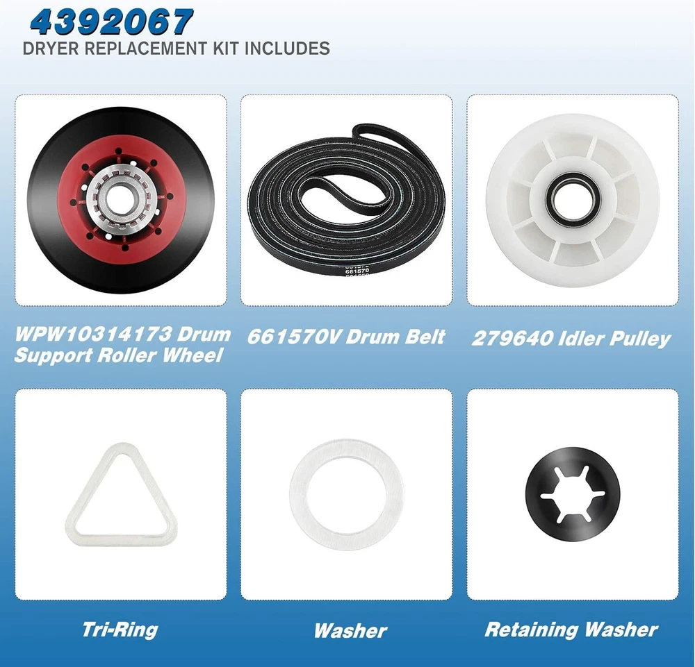4392067 Dryer Repair Kit Replaces Whirlpool Kenmore WED4815EW1 black Product Details Brand Name: AMI PARTS Item Weight: 1.17 pounds Product Dimensions: 93.5 x 0.25 x 0.04 inches Is Discontinued By Manufacturer: No Installation Type: Disconnect the power supply and wear gloves Part Number: 4392067 Color: black Compatible Device: 4392067 Material Type: Rubber, metal, plastic Included Components: 4392067 Dryer Replacement Parts Batteries Required?: No Brand: AMI PARTS Material: Rubber, metal, plastic Product Dimensions: 93.5"L x 0.25"W Belt Style: Drum Belt Compatible Devices: 4392067 Perfect Replacement: Our 4392067 maintenance kit includes a drum roller, belt, and pulley, making it the ideal replacement for your dryer. The kit contains 4 WPW10314173 dryer drum support roller wheels, 1 661570V dryer drum belt, and 1 279640 dryer idler pulley Perfect Replacement: 4392067 4392067 dryer repair kit more suitable for 27" & 29" dryers, replacement part number are 2015, 4392067VP, 80047, 587637, AP3109602, PS373088, EAP373088 Easily Solve Many Dryer Problems: If your dryer is noisy, not tumbling properly, leaving marks on clothes, or refusing to start, our maintenance kit is the solution you need. Simply turn off the power, remove the back and top of the dryer, and replace the bottom two rollers. The drum roller holds the drum in place while it rotates on the support wheels. Installation is straightforward and saves you both time and money on maintenance. We recommend using high temperature lubricant during installation to reduce noise Meets OEM Manufacturing Standards & Works Well: Our high-quality dryer maintenance kit, although not OEM, meets the original manufacturer specifications and performance. It has been thoroughly tested by the manufacturer for reliability and durability. The 4392067 maintenance kit is perfectly compatible with Kenmore, Whirlpool, and other dryer models. If you are unsure whether it is suitable for your dryer, please reach out to us, and we will gladly assist you