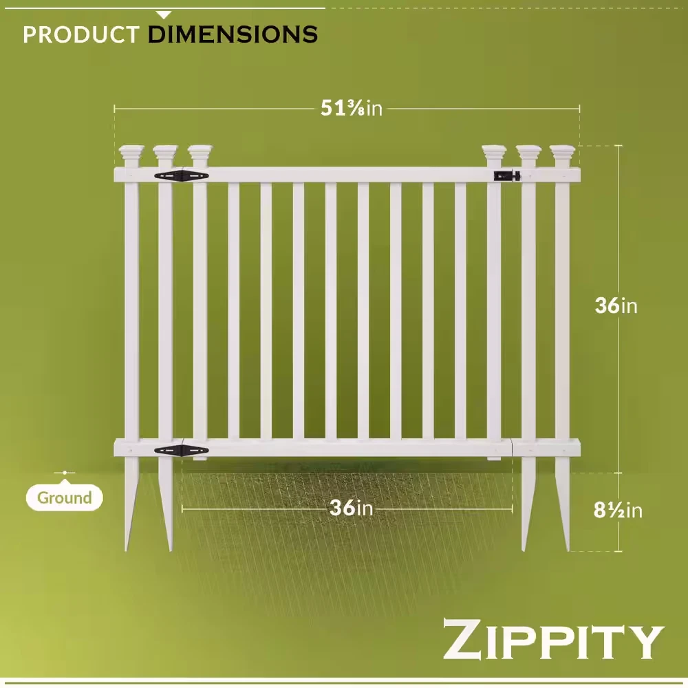 Antique brass layers stacked design gives an elegant look Maintenance-free gate has wings that offer stability Compact design is ideal for handling small pets and children Designed to complement the Baskenridge Vinyl Fence, this gate kit is complete with posts and hardware. The gate has included wings for additional stability. This means that although the gate is 51-3/8 in. W, the opening is 36 in., so you will want to plan accordingly.