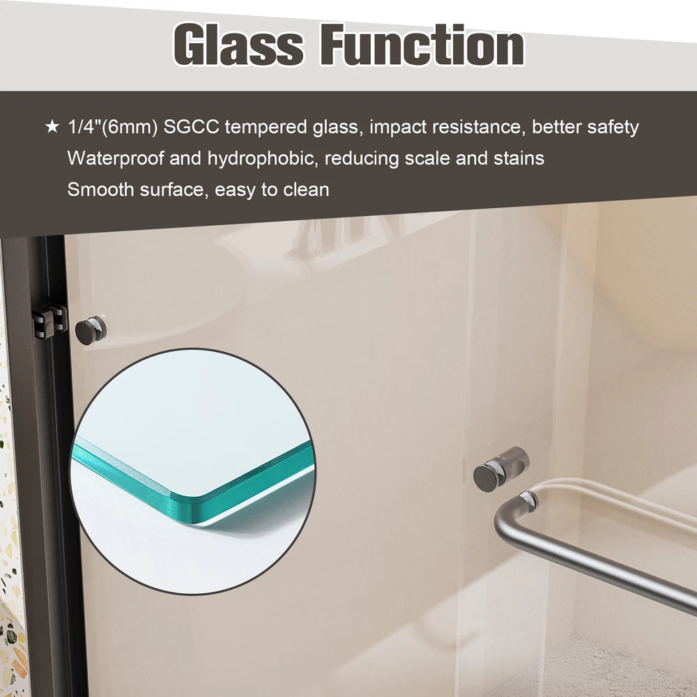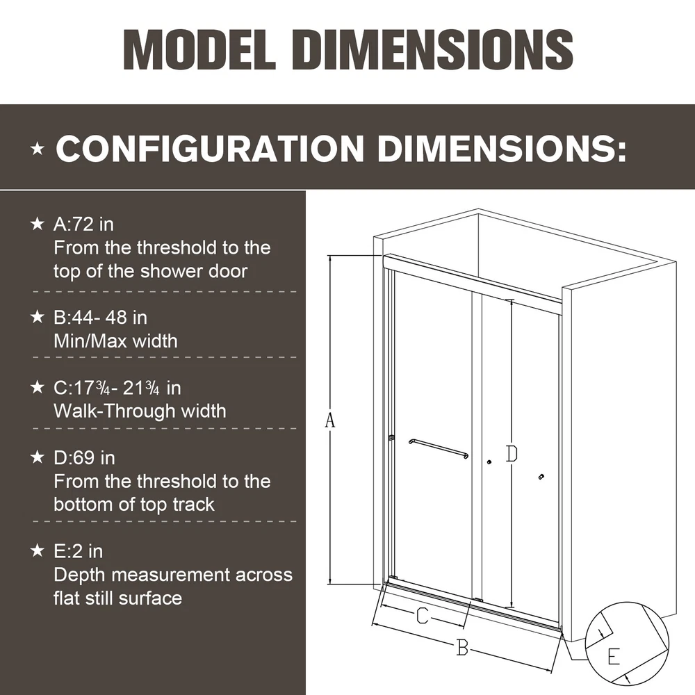 Product Information Item Code P175003 Product Type General Item Product Name 44"-48"W*72" H Semi-Frameless Double Sliding Shower Door, Bypass Shower Door, 1/4" (6mm) Thick SGCC Tempered Glass Door, Matte Black Place of Origin China Main Color Black Main Material Glass+Metal Product Dimensions Assembled Length (in.) 48.00 Assembled Width (in.) 72.00 Assembled Height (in.) 0.24 Weight (lbs) 89.00 Package Size Length (in.) 73.03 Width (in.) 27.95 Height (in.) 4.92 Weight (lbs) 98.10 Product Features · DOUBLE BYPASS SLIDING: This 48 in W * 72 in H semi-frameless shower door can be adjusted to 44 and 48 in width by cutting, walk-through width adjustment range: 17.75 in. to 21.75 in, maximize your bathroom layout of our double sliding door system, designed for easy access while using minimal space for smooth. The door body is light and flexible, reversible installation of left and right panel, and provides smooth opening and closing. · SAFE & STYLISH BATHROOM PARTITION: This product is made of high quality 1/4"(6mm) SGCC certified tempered glass for impact resistance and high tensile strength, increase the strength of the glass. Tempered glass surfaces are smooth and easy to clean and maintain, keeping your bathroom clean and tidy at all times. · EXCELLENT WATERPROOF PERFORMANCE: This shower door is designed with a focus on water resistance. Its premium materials and advanced construction ensure a watertight seal, preventing any water from escaping your shower and onto your bathroom floor. · CLASSIC AND HIGH-QUALITY MATERIALS: The shower door's main structure is made of lightweight and durable aluminum alloy with stunning and sophisticated matte black finish, which offers excellent corrosion and oxidation resistance, ensuring the stability and durability of the shower door without deformation over time. · EASY INSTALLATION: The complete packaging of the shower door includes all necessary components, ensuring a smooth and unobstructed installation process. And the packaging comes with an easy to understand installation guide that covers component preparation and step-by-step installation. How to Measure Your Shower Space ? Measuring the size of your enclosure is the first step toward a perfectly fitted installation. The following guidelines can help you achieve a precise measurement: 1. Ensure that finished wall material is in place before measuring. 2. Take lengthwise measurements at the bottom, center, and top of your enclosure. 3. Check all surfaces and walls for level. If any surface is out of level by 3/8 inches or more, a tapered filler is recommended. 4. Measure your available height (from shower curb to ceiling) and requested height (from shower curb to the desired height of your door) Do Read before You Buy : Refund& Return -Returns are accepted within 30 days.Any problems, please feel free to contact us by ebay message first, let's figure problems out together,your email will be replied within 1 business day. -We provide free Return service, but return shipping cost will be on you in below circumstances : 1. C hanged your mind or do not need /want the item or other personal reasons. 2.Items may slightly differ from photo s in terms of color and lighting differences & on different monitor’s display. 3. Manual measurement has been used, there may be some reasonable error range. 4. Choos ing the wrong size , type or color cause s unfit ting problem . Or didn't read specifications and descriptions, causes real item is different with own imagination or expectation. 5. Buyer did not know how to install or Use the item 6.Find a better price elsewhere . -Returns for free / free Replacement / free parts only happens in condition of product issue/ arriving broken /wrong item or missing parts. -For the quality issue , defective photo s must be attach ed in mails / when Return. Shippment Warning : if we shiped out the item and buyer wants to cancel the order or change address,buyer need to pay possible shipping cost . Please cancel the order or Change address before we ship out. After sals Service -we are responsible for accessories missed ( please contact us first ,and attach photo of what you've received ) -we are responsible for all losses caused by product quality issues ( Resend or Refund, please also attach defective photo s) Feedback We do appreciate hav ing such opportunity to solve the problem before leaving feedback s . Cause negative feedback solve s NO problem, but we DO ! Hope you have a good time shopping in our store! We are honored !