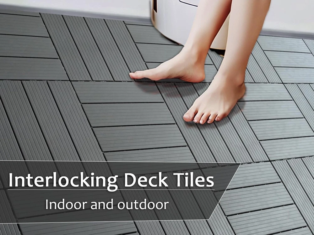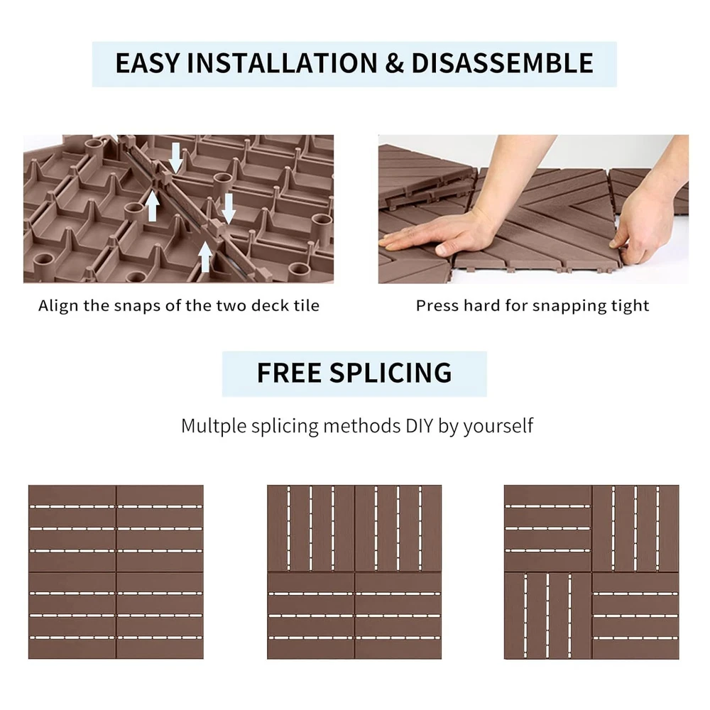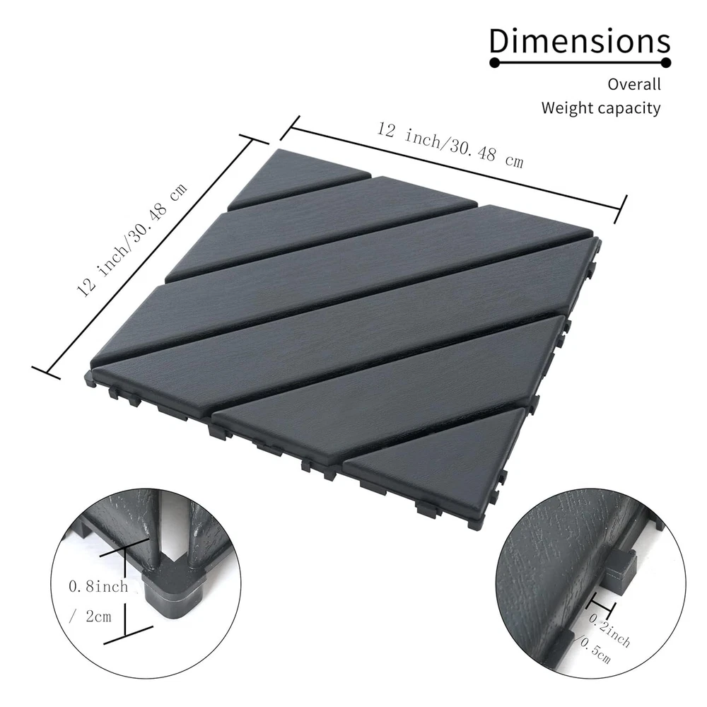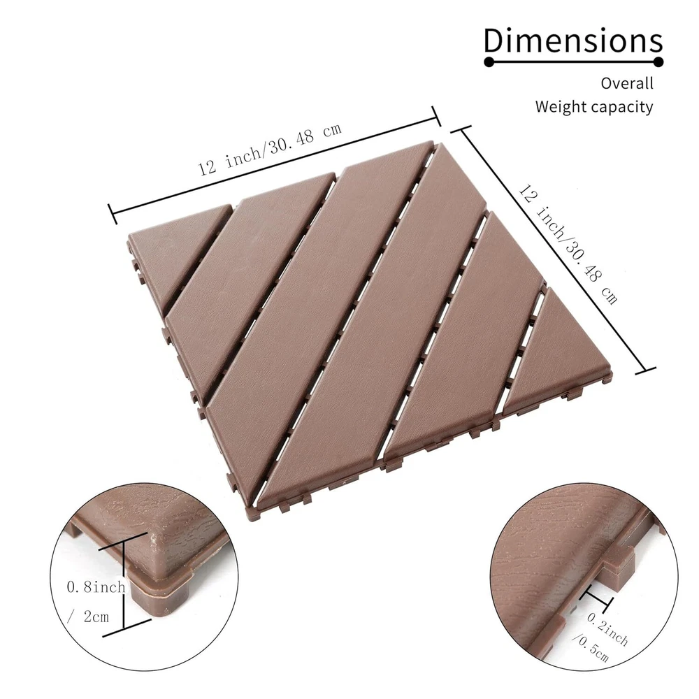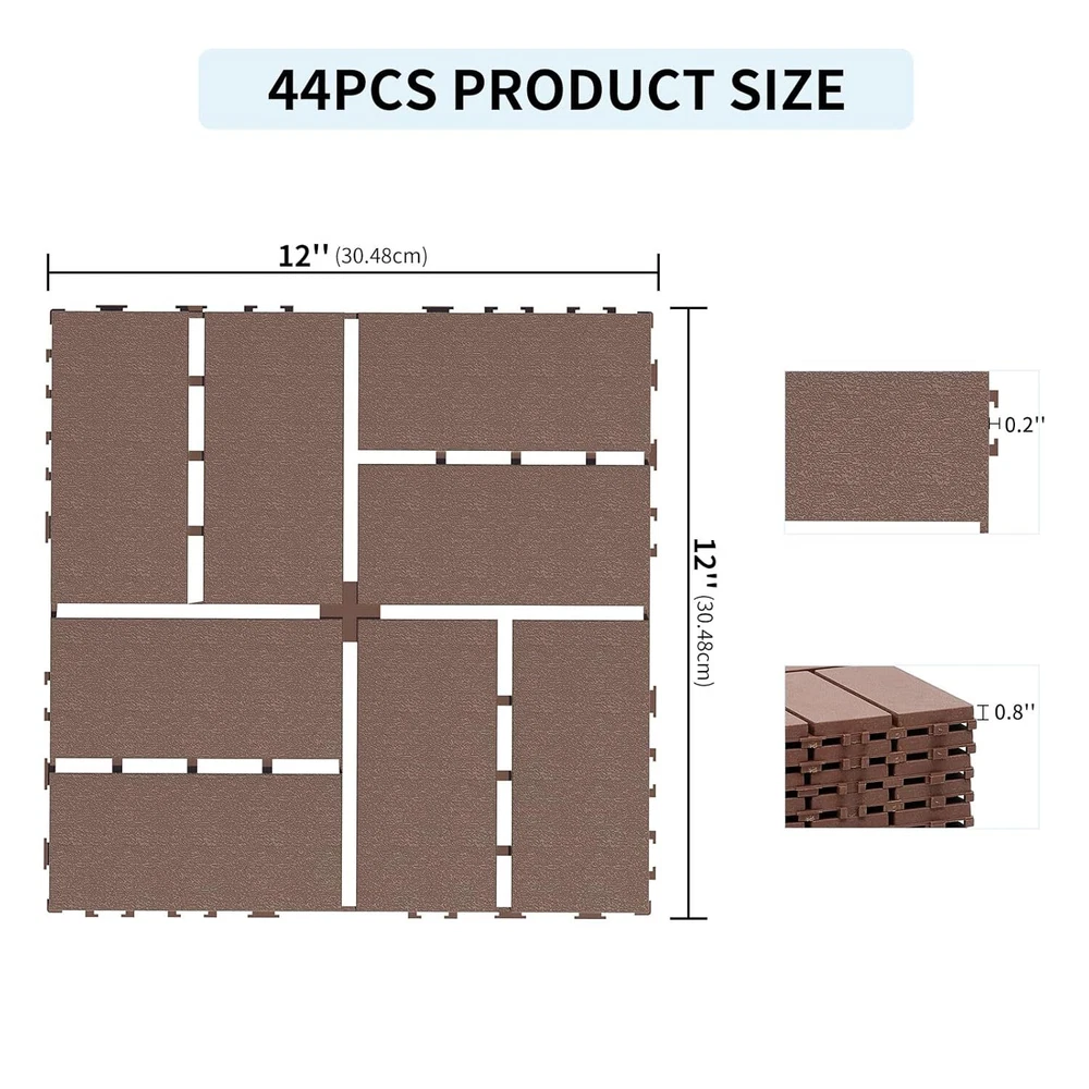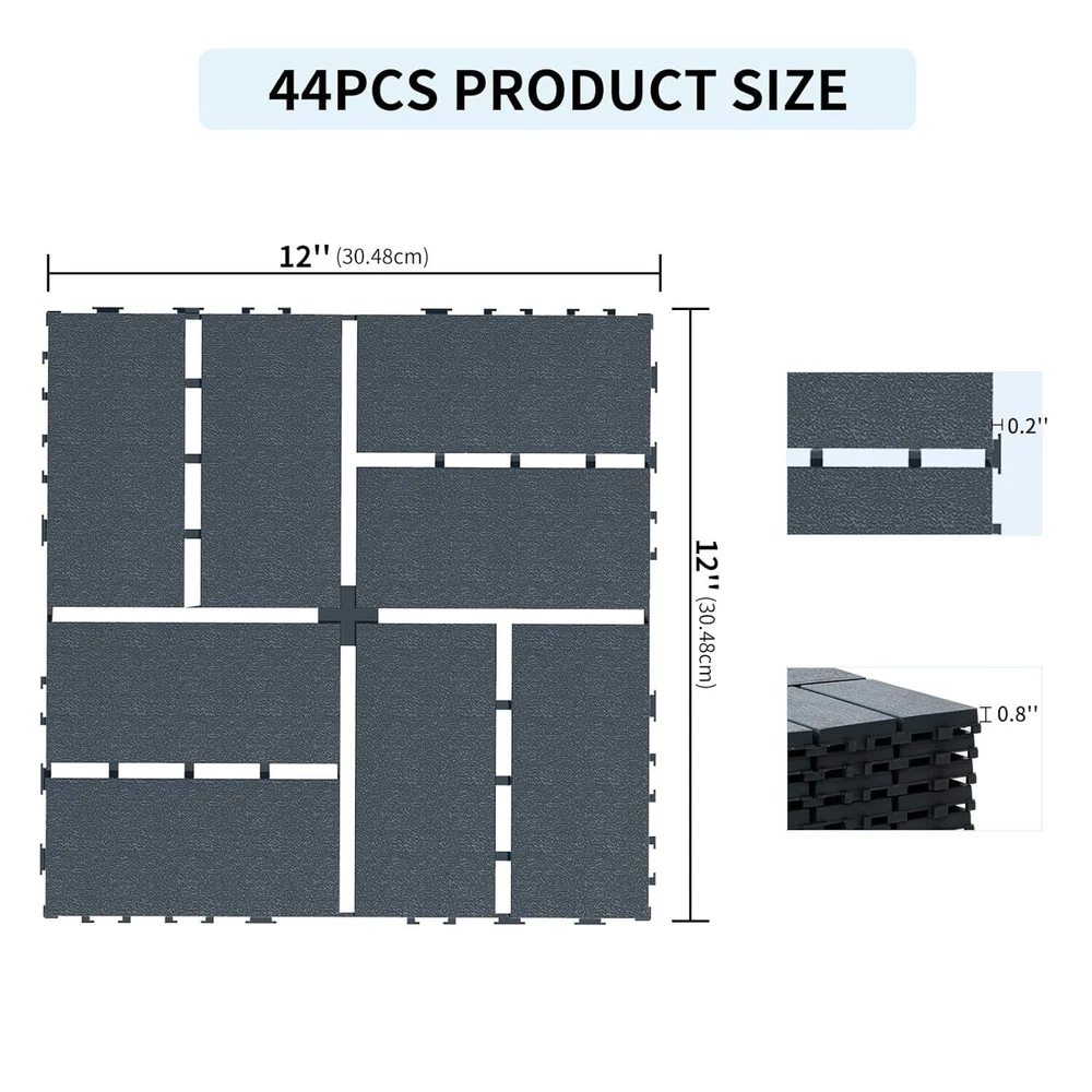 Product Features Single Size: 12" length x 12" width x 0.8" height. Easy to Install:They easily click together like a puzzle, rigid and wont slide about no matter the surface you put them on. Sturdy:It is made of high quality PP material.It has a strong load-bearing capacity. Perfect interlocking patio tiles, balcony tiles, bathroom and any indoor or outdoor setting, and these interlocking tiles are just thin enough, they dont obstruct doors, they can fit any room to your requirements. Note:Due to the light angle, there may be a certain color difference between the product and the real object. Please use it on a flat surface Description Firm support 16 large strong round feel Easy to Install Our upgraded interlock mode ensures a faster and more secure installation process without any tool splicing Easy to Clean Waterproof and easy to clean 1. 2024 latest four styles of flooring in two colors 2. Easy to install or cuttable, no screws, drills, etc. --- easy DIY splicing project 3. Perfect for interlocking patio tiles, balcony tiles, bathrooms and any indoor or outdoor environment , these interlocking tiles are thin enough to not block the door and can fit any room as required 4. Environmentally friendly PP polypropylene material, thickened and tough material, strong and durable, stable structure, good load-bearing capacity 5. The floor is like a puzzle piece Each surface can be easily spliced at will, no need to distinguish directions, and construction and installation can be quick.Sturdy and durable, they won't slip no matter what surface you put them on. 6. Multiple combinations to create various textures and patterns. You can play whatever you want. 7. 1 square foot per floor, 44 per set slices, large quantity Actual length 11.8 inches, splicing interface 0.2 inches Product Description Dimension 12“ x 12” x 0.75“ Material PP Resin Plastic Suit for Deck, balcony, patio, porch, garden, poolside and so on. Suggestions (1) Use stones or artificial grass to fill the gap. (2) Use these tiles to pave places may get muddy or slippery after rainny. (3) We suggest to use them on flat surface instead of curved or bumpy place, preferably on solid surface. On May 8, 2025 at 01:55:56 PDT, seller added the following information: