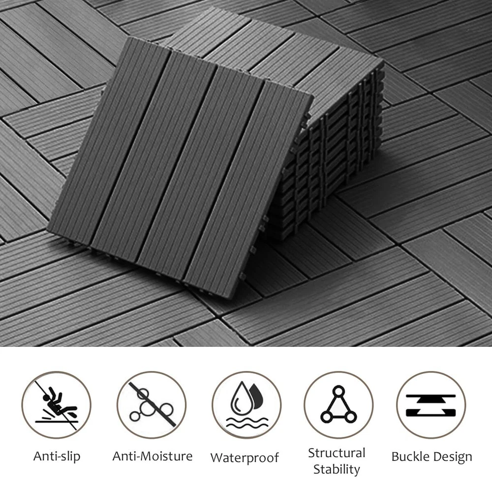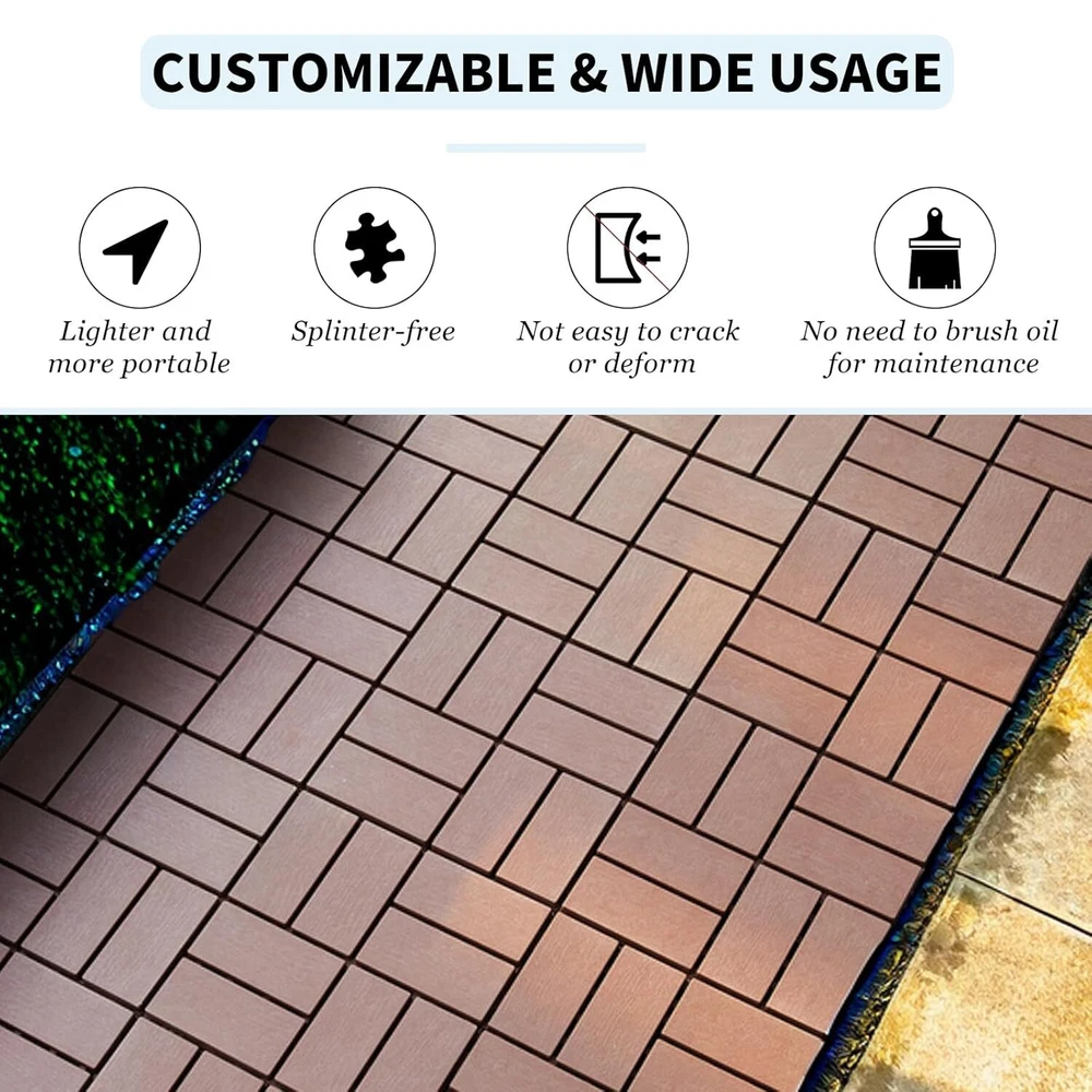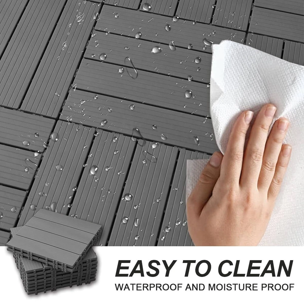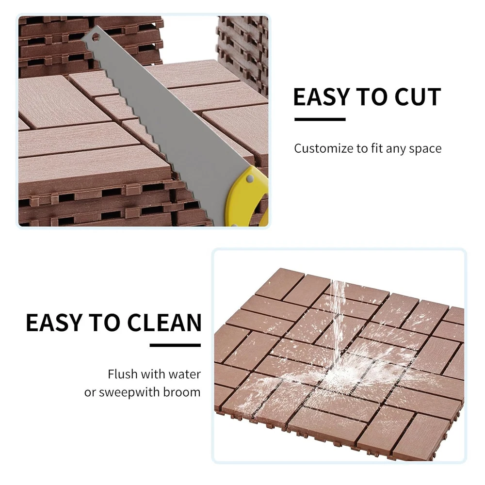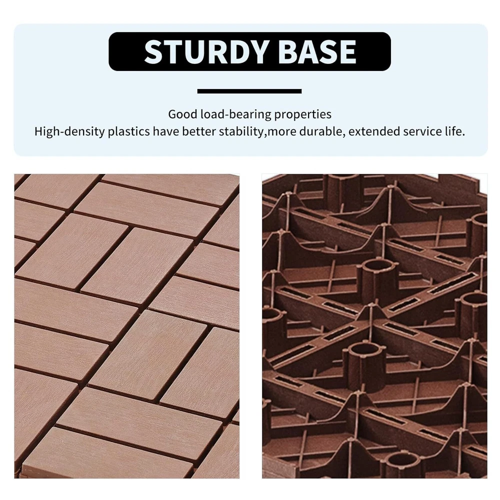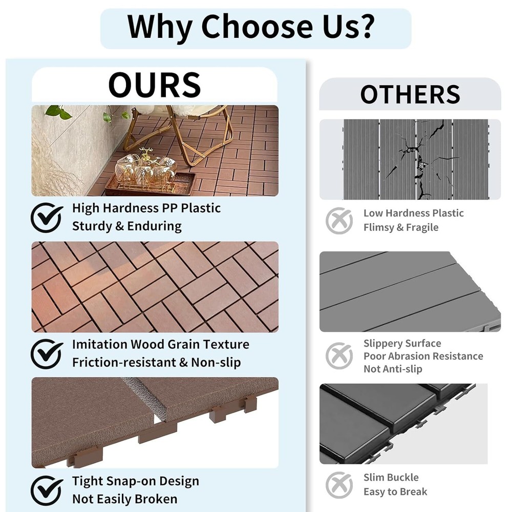 Product Features Single Size: 12" length x 12" width x 0.8" height. Easy to Install:They easily click together like a puzzle, rigid and wont slide about no matter the surface you put them on. Sturdy:It is made of high quality PP material.It has a strong load-bearing capacity. Perfect interlocking patio tiles, balcony tiles, bathroom and any indoor or outdoor setting, and these interlocking tiles are just thin enough, they dont obstruct doors, they can fit any room to your requirements. Note:Due to the light angle, there may be a certain color difference between the product and the real object. Please use it on a flat surface Description Firm support 16 large strong round feel Easy to Install Our upgraded interlock mode ensures a faster and more secure installation process without any tool splicing Easy to Clean Waterproof and easy to clean 1. 2024 latest four styles of flooring in two colors 2. Easy to install or cuttable, no screws, drills, etc. --- easy DIY splicing project 3. Perfect for interlocking patio tiles, balcony tiles, bathrooms and any indoor or outdoor environment , these interlocking tiles are thin enough to not block the door and can fit any room as required 4. Environmentally friendly PP polypropylene material, thickened and tough material, strong and durable, stable structure, good load-bearing capacity 5. The floor is like a puzzle piece Each surface can be easily spliced at will, no need to distinguish directions, and construction and installation can be quick.Sturdy and durable, they won't slip no matter what surface you put them on. 6. Multiple combinations to create various textures and patterns. You can play whatever you want. 7. 1 square foot per floor, 44 per set slices, large quantity Actual length 11.8 inches, splicing interface 0.2 inches Product Description Dimension 12“ x 12” x 0.75“ Material PP Resin Plastic Suit for Deck, balcony, patio, porch, garden, poolside and so on. Suggestions (1) Use stones or artificial grass to fill the gap. (2) Use these tiles to pave places may get muddy or slippery after rainny. (3) We suggest to use them on flat surface instead of curved or bumpy place, preferably on solid surface. On May 8, 2025 at 01:55:56 PDT, seller added the following information: