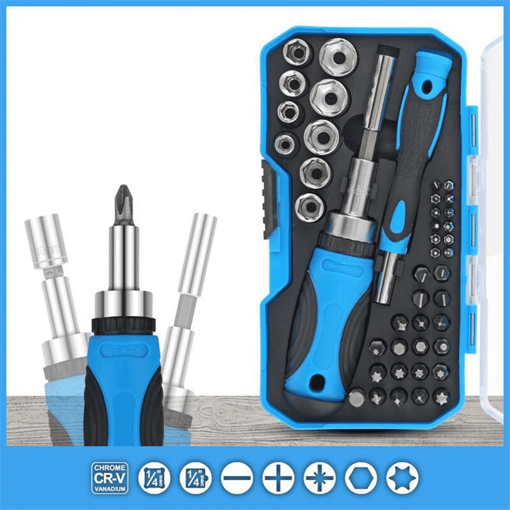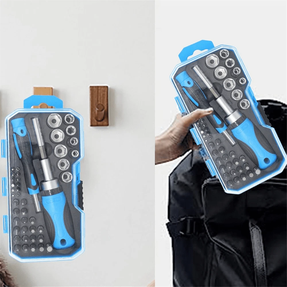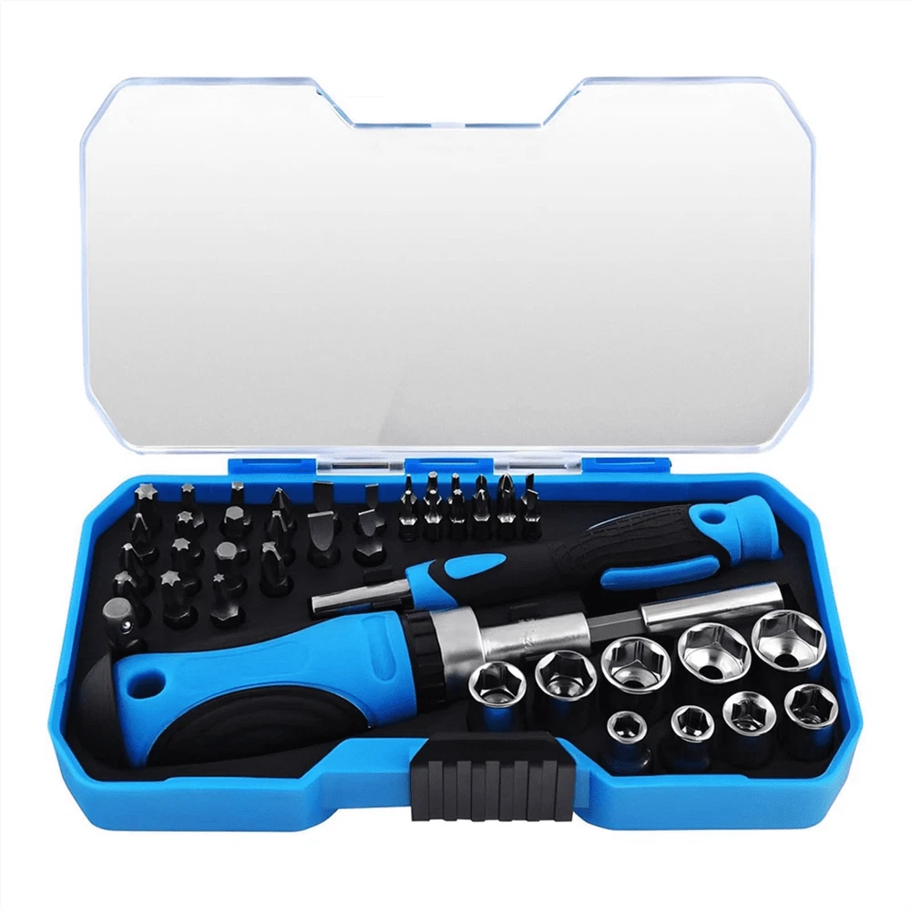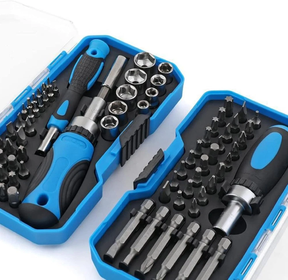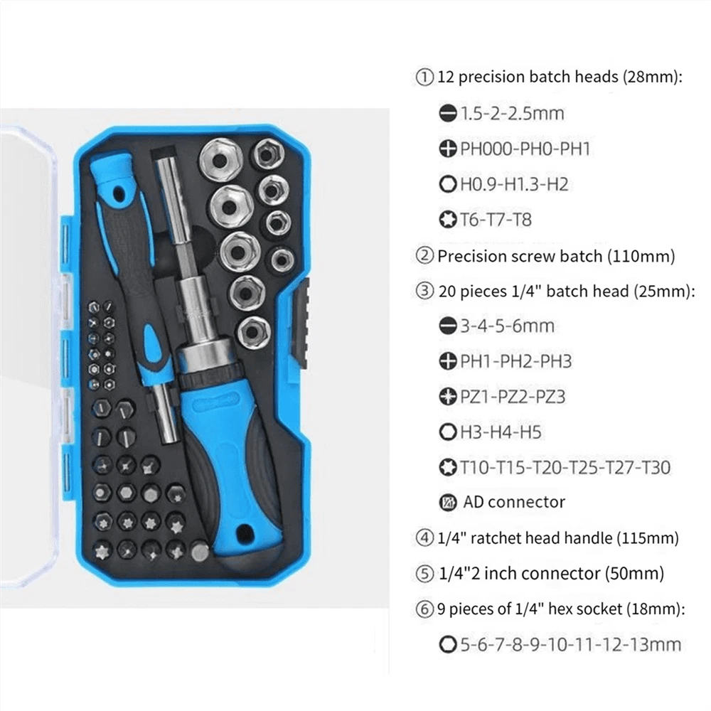 characteristic: It is designed with sockets, screwdriver bits and precision drills of most popular sizes, and is suitable for home, garage, apartment, dormitory, back to school, electronic equipment, glasses and jewelry repair projects. The drill bit and casing are made of High-quality materials, which has durability, extraordinary hardness and excellent toughness and can withstand greater torque. Non- grip and comfortable driver provide users with lasting strength. Three-way ratchet batch handle quickly locks the rotation direction of batch head. This gear is used to tighten the ratchet and center it. This gear is used to manually operate the ratchet to the right. This gear is used to loosen it. All tools are contained in a sturdy transparent cover injection-molded plastic box, which is convenient for storing and identifying tools, keeping tools safe or in the garage, and has good portability. Versatile and reliable, it is very suitable for DIY or professional use. Whether you are engaged maintenance, car maintenance or other projects, this comprehensive package can meet your needs. describe Name: Ratchet screwdriver bit sleeve set Material: Steel+Plastic colour: Blue+Silver Package Contents: 1 x Ratchet screwdriver bit sleeve set Only the above package content, other products are not included. Note: Light reflection and different displays may cause the color of the item in the picture a little different from the real thing. The measurement allowed error is +/- 1-3cm. All tools are contained in a sturdy transparent cover injection-molded plastic box, which is convenient for storing and identifying tools, keeping tools safe or in the garage, and has good portability. The drill bit and casing are made of High-quality materials, which has durability, extraordinary hardness and excellent toughness and can withstand greater torque. Non-slip grip and comfortable driver provide users with lasting strength. Three-way ratchet batch handle quickly locks the rotation direction of batch . This gear is used to tighten the ratchet and center it. This gear is used to manually operate the ratchet to the right. This gear is used to loosen it. characteristic: It is designed with sockets, screwdriver bits and precision drills of most popular sizes, and is suitable for home, garage, apartment, dormitory, back to school, electronic equipment, glasses and jewelry repair projects. Versatile and reliable, it is very suitable for DIY or professional use. Whether you are engaged in home maintenance, car maintenance or other projects, this comprehensive package can meet your needs.