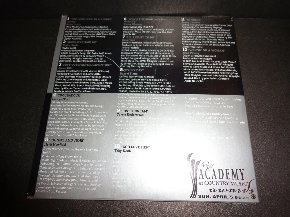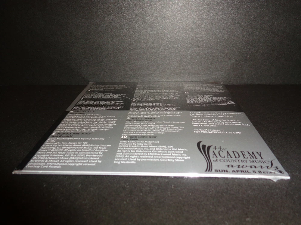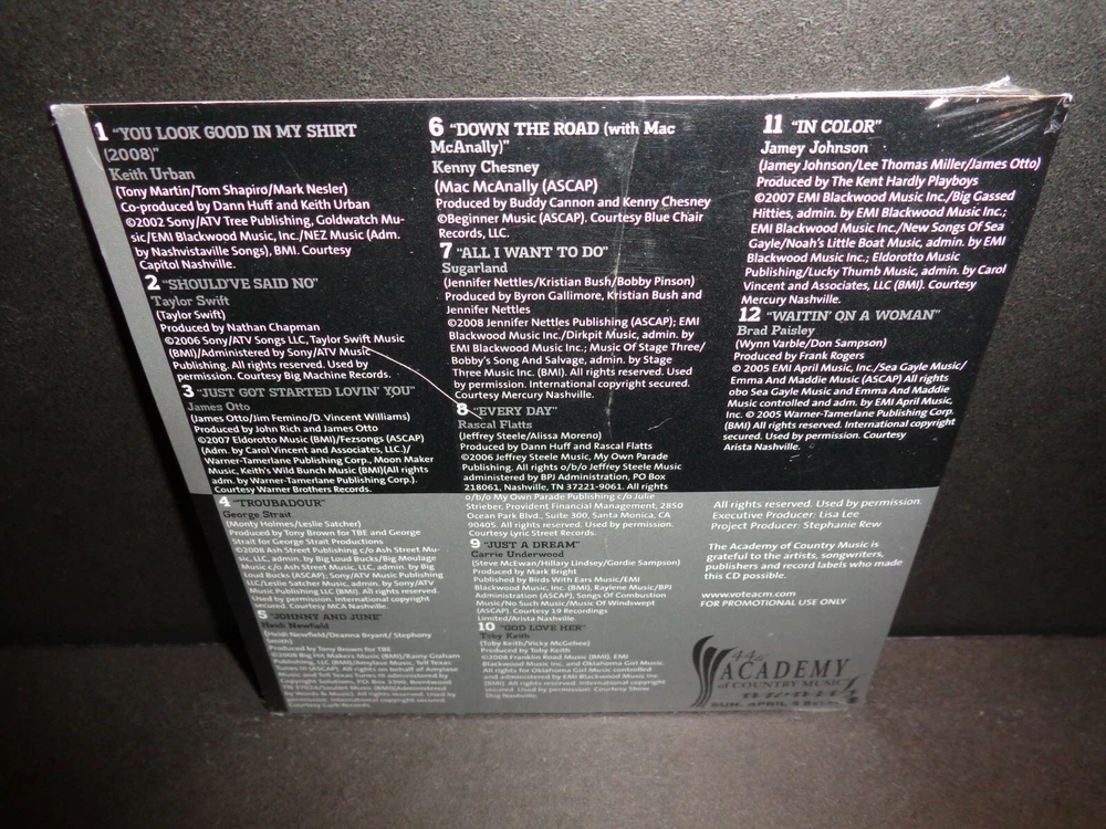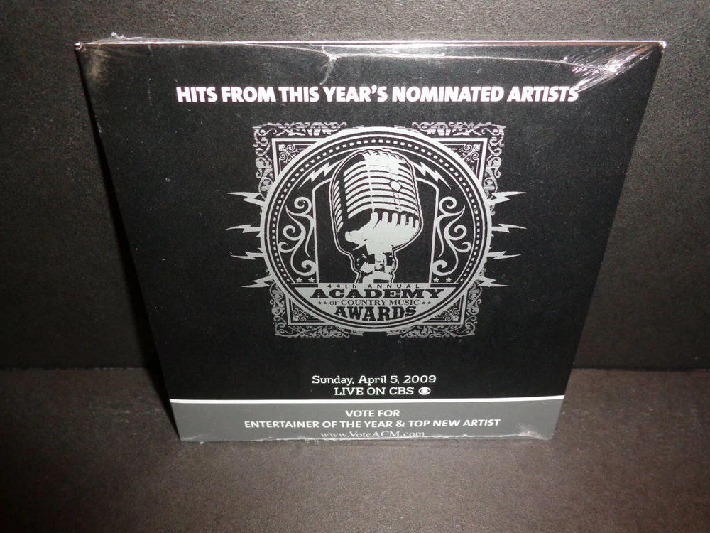 44th ANNUAL ACADEMY OF COUNTRY MUSIC AWARDS HITS FROM THIS YEAR'S NOMINATED ARTISTS - April 5, 2009 Rare Collectible Promotional CD The CD comes in a Cardboard Sleeve Vote for Entertainer of The Year & Top New Artist Songs include: 1. You Look Good in My Shirt by Keith Urban 2. Should've Said No by Taylor Swift 3. Just Got Started Lovin' You by James Otto 4. Troubadour by George Strait 5. Johnny and June by Heidi Newfield 6. Down the Road by Kenny Chesney with Mac McAnally 7. All I Want To Do by Sugarland 8. Every Day by Rascal Flatts 9.Just A Dream by Carrie Underwood 10. God Love Her by Toby Keith 11. In Color by Jamey Johnson 12. Waitin' On A Woman by Brad Paisley Check out my other items ! Be sure to add me to your favorites list !