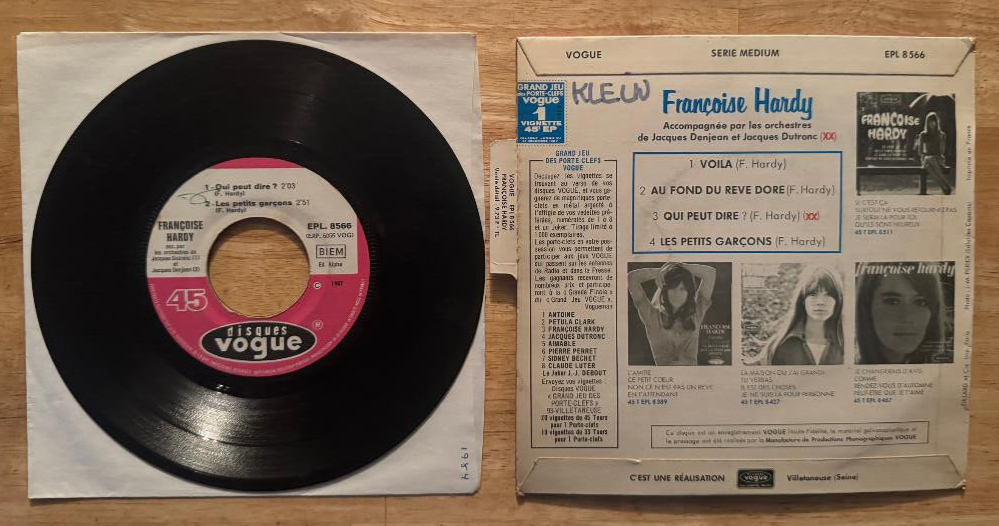 45 FRENCH EP, FRANCOISE HARDY, VOGUE 8566, QUI PEUT DIRE? + 3 , SLEEVE: VG+, RECORD: VG-, S/H: $5.25, CHECK MY OTHER FRANCOISE HARDY RECORDS, I COMBINE SHIPPING. For country who don't get tracking number after the item leaves the USA, registered with signature the item will be sent, NO EXCEPTION!! I'm fed up with scammer! if you don't agree DON'T BID!!!