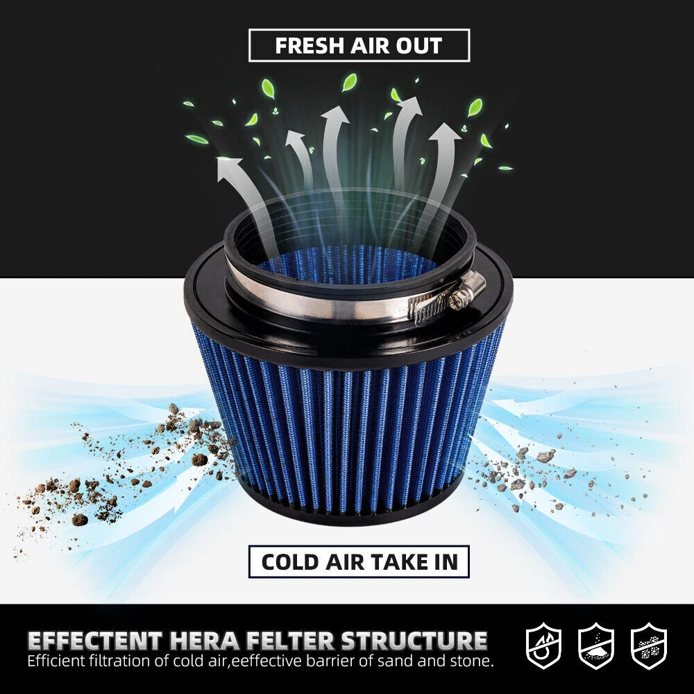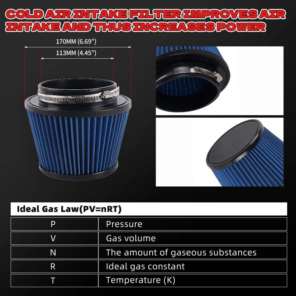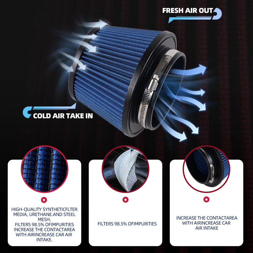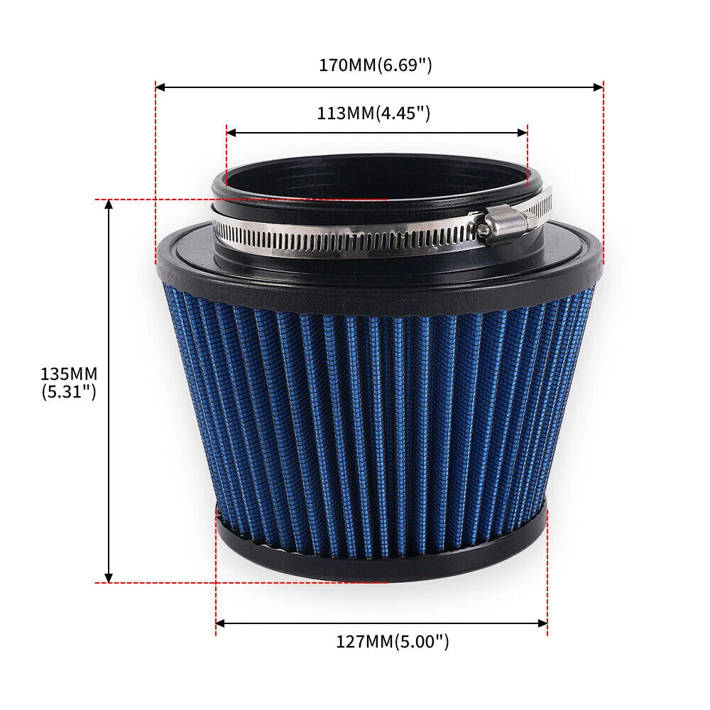 4.5" Inlet Truck Air Filter Dry High Flow Clamp-On Round Cone Air Intake Filter SPECIFICATIONS: Type: Air Filter Material: Plastic + Metal + Non-woven Fabric Inlet Diameter: 114mm / 4.45inch FEATURES: 100% Brand New and Never Used or Installed Increase horsepower, torque and improve the gas mileage. It universally fit for any 114mm / 4.45inch air intake hose. The high flow air filter help engine to draw more cooler air resulting in betterthrottle response & higher explosive horsepower output. It comes with a washable and reusable cone air filter and a clamp. Filter consisted of 2 layers to double the filtration efficiency. [How often should air intake filter be replaced?] It should be inspected once a year or every 15,000 to 30,000 miles, but this can varybased on the car and driving environment. If you often drive through dusty terrain oron unpaved roads, you may need to change it more frequently. PACKAGE INCLUDE: 1 x Air Filter All accessories in the picture are included. NOTE: 1. Please allow 0.5-1 inch difference due to manual measurement. (1 inch=2.54cm) 2. Please check the size measurement and the picture carefully before makingpayment. 3. Due to the difference between different monitors, the picture may not reflect theactual color of the item. Please understand, Thank you. SHIPPING INFORMATION PAYMENT WARRANTY ABOUT US CONTACT US SHIPPING INFORMATION We will only ship this item to buyers by Normal Mail, please confirm your address is correct, and if you want to change the delivery address, just feel free to contact us when you purchase. Usually, we will ship the orders out and upload the tracking number within 1-2 business days(Monday to Saturday from 8:30am-5:30pm) after you complete the payment. PAYMENT We will only accept eBay payment. Please pay using eBay payment ONLY within 7 days from the date of transaction be made. WARRANTY Please inspect your order upon receipt.No damage claims will be honored after 14 days of delivery. All item we sold come with 90 days defective warranty from the date. ABOUT US We are a powerful factory producing auto parts,and we have a professional sales and after-sales team that can provide you with excellent products and services. CONTACT US For any reason you want to contact us,We aim at satisfying every visitor, no matter what kind of situation you meet with, we will be right here to serve you. Please contact our team. If you are happy with the transaction with us, leaving us an ALL-5-STAR positive feedback would be greatly appreciated. Have a good shopping.