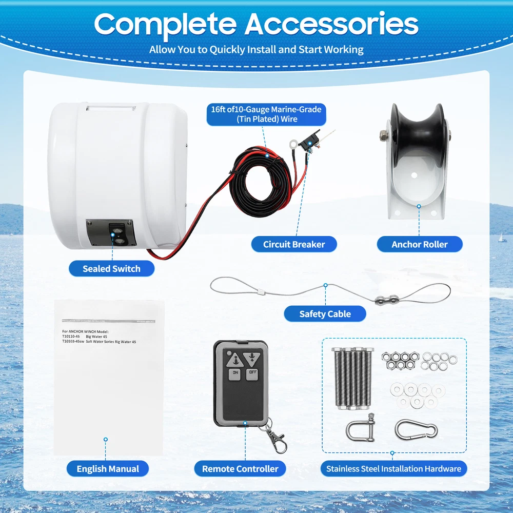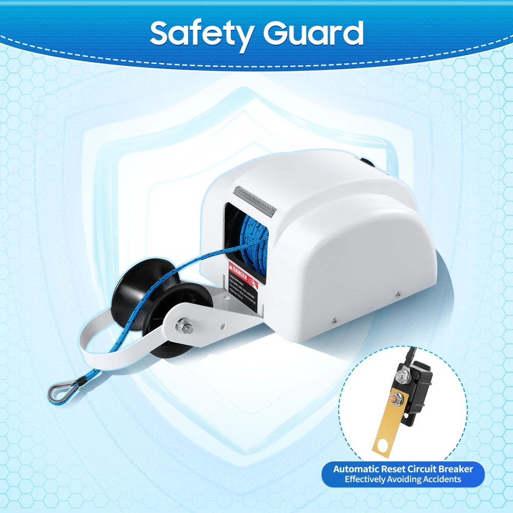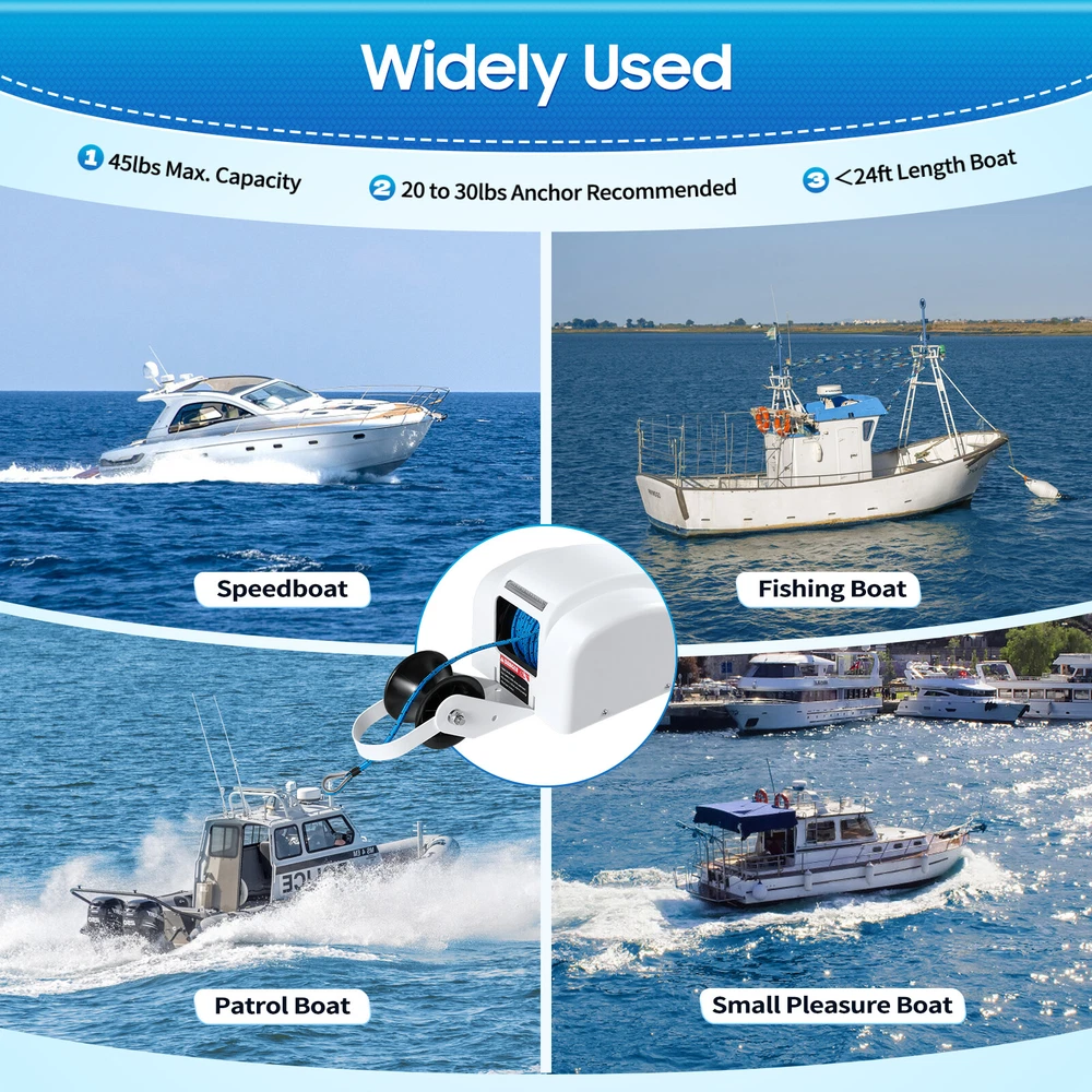 Description This electric anchor winch is made of high-quality materials and fine craftsmanship for durability. It utilizes electric power to allow you to easily raise and lower the anchor via a remote control or control panel, which greatly improves work efficiency. Compared to other anchor winches, this electric anchor winch can quickly and accurately execute commands in bad weather, allowing you to use it more safely and securely. Key Features Build to Last: It is made of high-quality plastic and iron with a painted surface for good corrosion resistance. The nylon anchor rope is strong and durable and has a long service life. Excellent Performance: It is powered by a 12-volt, high-efficiency motor with a maximum load capacity of 45 lbs. and an unloaded rope retrieval speed of up to 7 45 LBS Saltwater Boat Electric Windlass Anchor Winch Marine with Wireless Remote Description This electric anchor winch is made of high-quality materials and fine craftsmanship for durability. It utilizes electric power to allow you to easily raise and lower the anchor via a remote control or control panel, which greatly improves work efficiency. Compared to other anchor winches, this electric anchor winch can quickly and accurately execute commands in bad weather, allowing you to use it more safely and securely. Specification Color: White Martial: Plastic, Iron, Nylon Process: Painting Max. Load Capacity: 20kg/45lbs Recommended Anchor Weight: 9-13.6kg/20-30lbs Suitable Boat Length: <7.3m/24ft Max. Strength of Anchor Rope: 317.5kg/700lbs Anchor Rope Length: 30.48m/100ft Rope Retrieval Speed: 21.3m/70 ft/min Product Size: 43.5*21.5*17.5cm/17.13*8.46*6.89inch Package Size: 38*28.5*22.5cm/14.96*11.22*8.86inch Gross Weight: 8.2kg/18.08lbs Net Weight: 7.3kg/16.09lbs Package Included 1* Electric Anchor Winch 1* Remote Controller 1* English Manual Other Accessories for Installation Key Features Build to Last: It is made of high-quality plastic and iron with a painted surface for good corrosion resistance. The nylon anchor rope is strong and durable and has a long service life. Excellent Performance: It is powered by a 12-volt, high-efficiency motor with a maximum load capacity of 45 lbs. and an unloaded rope retrieval speed of up to 70 ft/min. A 100ft anchor rope can withstand a maximum strength of approximately 700 lbs, so you can use it with confidence. Convenient to Use: A premium anchor roller allows the anchor rope to be lowered and stowed more smoothly, making the crew operate and control the anchor more easily, improving the safety and stability of the vessel. Easy Operation: It has a sealed switch and a remote control that can easily and smoothly control the lifting and landing of the anchor. Moreover, the remote control can be installed on the rudder or other convenient places for use. Safety Guard: It is equipped with an automatic reset circuit breaker that can quickly cut off the power supply to prevent equipment damage or fire and other safety accidents when the circuit is overloaded and short-circuited, or other faults lead to abnormal current. Easy to Carry & Store: Its compact size(17.13*8.46*6.89 inches) and lightweight(16.09 lbs) make it easy for you to carry wherever you need it. Simple Installation: A simple structure and complete accessories make it easy for you to quickly install and start working. Protective Package: To prevent the product from being damaged and bumped during transportation, we packed it with foam, plastic bags, and cartons to protect your products to the maximum extent possible. Customer Service: Communication is the best way to solve problems. If you have any problems, please feel free to contact us. We will reply and solve the problem for you as soon as possible. Details Reserved Holes: It comes with reserved holes that make it easy for you to secure it to the boat for safe use. Large Nut: The large nuts on the anchor roller effectively enhance stability and prevent the roller from falling off during use. Convenient Handle: It comes with a carry handle that makes it easy for you to control the rollers and enhances safety during use. Application It is suitable for anchoring and dropping anchor operations of speedboats, fishing boats, motorboats, small pleasure boats, patrol boats, and other vessels with an anchor weight of up to 45 lbs. Notes Please allow the slight color difference caused by the shooting light and the 1-3cm error due to manual measurement, and make sure you do not mind before ordering. Payment Delivery details Terms of sales About us Contact us Payment We accept ebay payment 。 Fees such as import duties, taxes are not included in the item price or shipping costs. These charges are the buyer's responsibility. Delivery details Shipping: 2-9 working days to: USA Terms of sales We maintain high standards of excellence and strive for hundred percent customer satisfaction. Feedback is very important to us. We hope that you contact us immediately before you give neutral or negative feedback, so that we can address your concerns. It is impossible to address issues if we do not know about them! About us Your satis faction is our ultimate goal. We work hard to earn your trust and future business. Our certified technicians have tested each item before shipping. The unit comes with 1 year limited warranty on all manufacturing defects. a) If you receive a defective item, you may return it or ask for a discount. Please contact us within 14 days after you receive the package. b) What you returned must be intact and in its original packaging as re? u. Customer is responsible for shipping costs of the returned item. c) We will cover the cost of shipping back t with the shipping rate indicated in the registration page. We will send you a new unit or refund the full payment you paid. Thank you. Contact us Business Hour Business Hour: Monday To Friday: 8:30 AM to 5:00 PM (Beijing China time) Due to time zones, our reply to your questions may not be immediately. But within