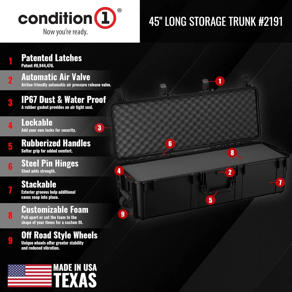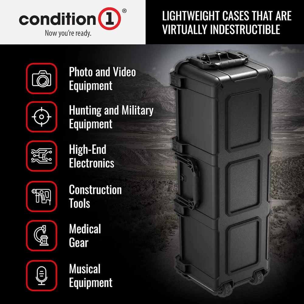 45" Long Hard Shell Carrying Case Model 2191 with Wheels, Waterproof, Protective, Storage for Music Equipment, Camera, Travel Case, Made in USA, 44.52"x16.30"x12.90" Black 45” LONG PORTABLE STORAGE CASE WITH WHEELS - 45” long black hard case with wheels, includes patented latches and rubberized handles for a comfortable grip. A lockable case for maximum security. WATERPROOF AND DUST PROOF CASE - This hard carrying case features an automatic air pressure release valve which makes the case airline friendly. An IP67 dust and waterproof hard case with a rubber gasket for an airtight seal. CUSTOMIZABLE FOAM - Our hard shell carrying case comes with customizable foam that can be cut and shaped to fit your items for a secure fit. The portable hard case is stackable and features steel pin hinges for added strength. OFF ROAD STYLE WHEELS - Condition 1 hard storage case is made in the USA from crush-resistant, virtually indestructible polypropylene copolymer with off road style wheels to reduce vibration. MULTIPLE USES - Use the hard travel case for electronics, as a scientific instrument case, video equipment case, camping storage case, military hard case, and more!