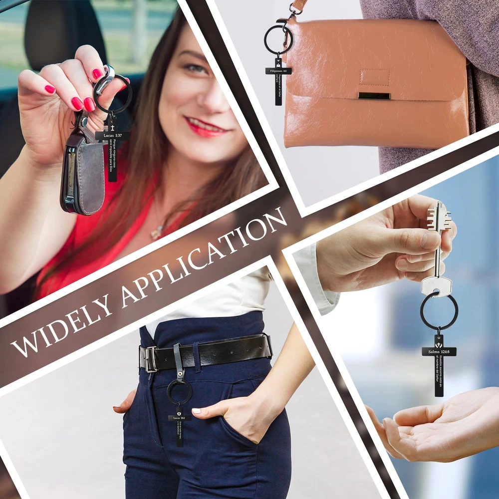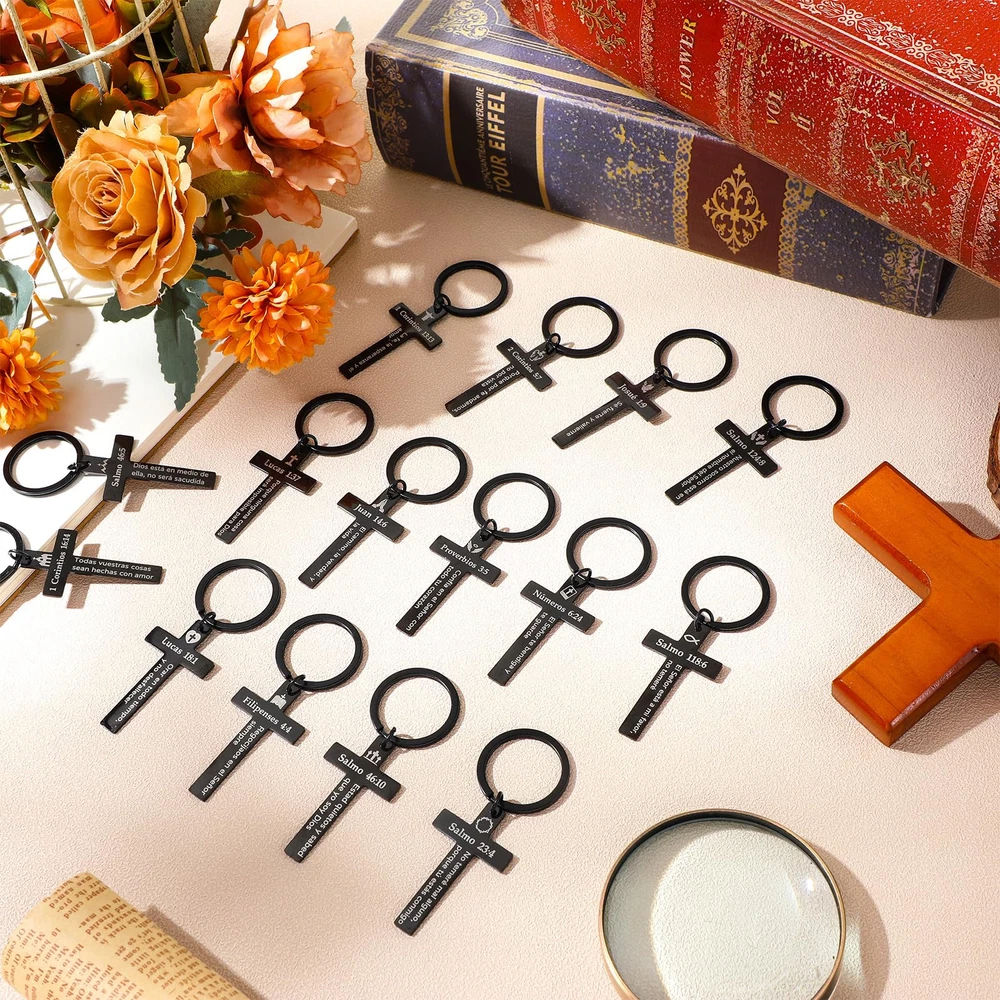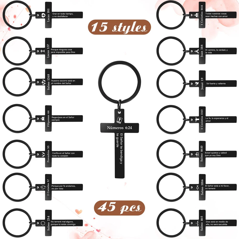 Sufficient Quantity to Share: with each package comes 45 Christian keychains in 15 different Spanish bible verse designs, 3 of each; The rich quantity and styles can meet your needs for sharing these beautiful items with your loved ones, making them ideal for gifting during events or large gatherings Reliable Material: the cross keychain is crafted from sturdy metal, ensuring its durability and longevity, not easy to deform or fade; This keychain's robust material not only signifies its long lasting quality but also underlines the solid faith and dedication that the cross itself represents Compact Handy Size: the pendant part of the cross keychain bulk measures approximately 1.92 x 1.1 inches/ 4.9 x 2.8 cm only; It's handy and compact enough to fit in your pocket or purse to hang with your house keys, car keys or warehouse keys, making your daily life more convenient Encouraging and Warm: each Spanish religious keychain features a classic Spanish bible verse quote, making you feel inspired; The white sentence printed on the elegant black backdrop serves as a constant reminder of faith, hope, and strength, warming your heart with each use Meaningful Gift: the Christian key chain makes for a deeply significant gift, or thank you gift for a new job, retirement, resignation, congratulation; Whether it's a birthday, anniversary, Christmas and more, it can show your wishes for the recipient