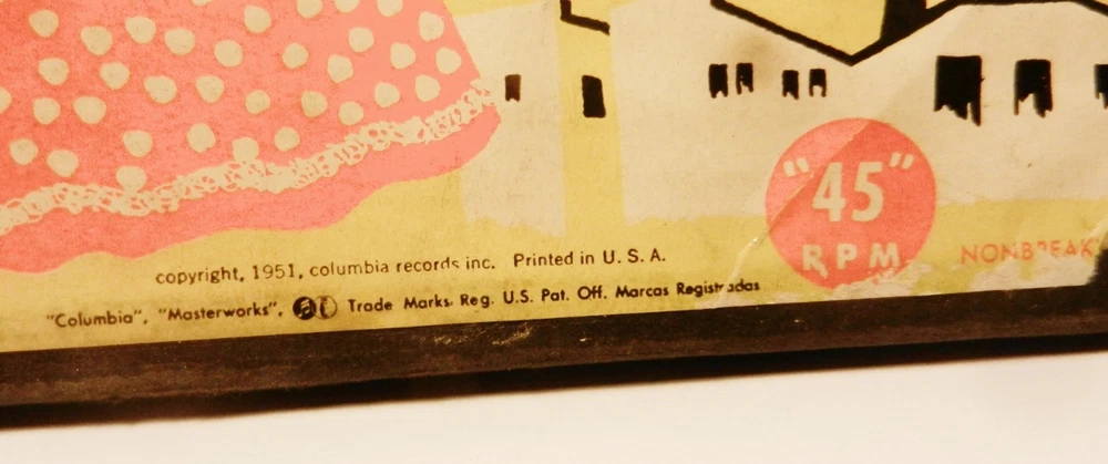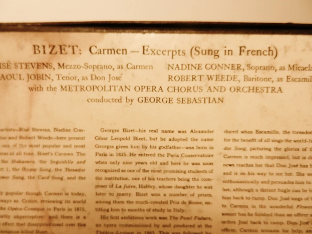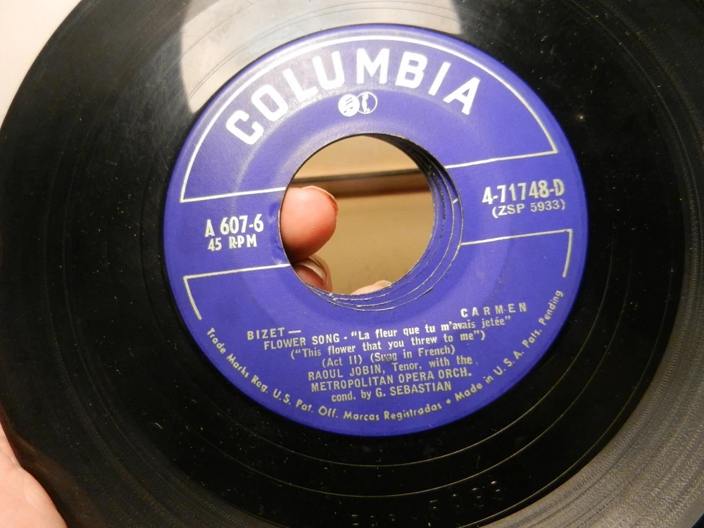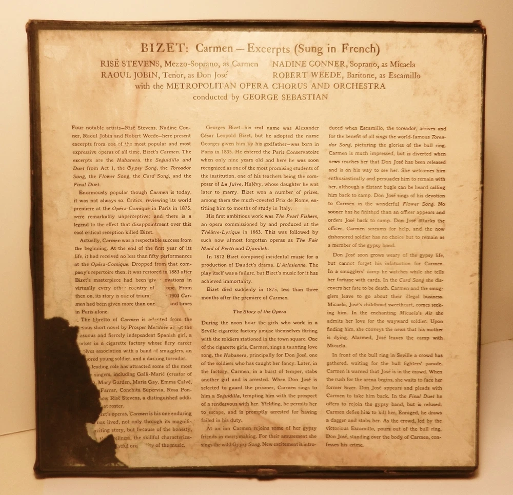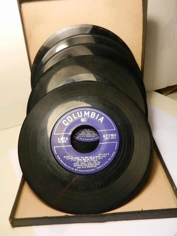 Set of 5~45 RPM ( 7 inch ) records boxed Made by Columbia Records in 1951 Excerpts from Bizet's Carmen Sung in French! Rise Stevens as Carmen, Raoul Jobin as Don Jose ~Nadine Connor as Micaela~ Robert Weede as Escamillo ~with the Metropolitan Opera Chorus and Orchestra Conducted by George Sebastian The records have the following on them 1) Card Song/Gypsy Song 2)Habanera/Final Duet 3)Seguidilla/Micaela's Air 4)Carmen Prelude/Final Duet 5)Toreador Song/Flower Song I am not an expert at rating the quality of records and can only go by what I see and the knowledge of who owned them previously makes me feel that these have been well taken care of. There are no sleeves for any of the records.
