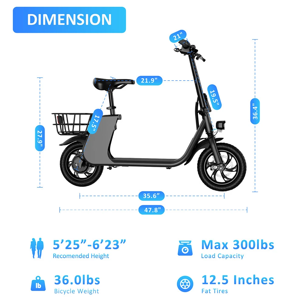 Electric Scooter Adults 12'' 450W 8Ah 18 Mph E-City Bike & E-Scooter with Basket 🚴♂✅ Free and fast delivery within 4-5 working days and excellent after-sales service: Our bicycles have multiple branches across the country. After you successfully place an order and make payment, we will arrange for our staff to pack your package as soon as possible. If you place an order before 4pm on the same day, we will arrange for shipment on the same day. If you place an order after 4pm on the same day, your package will be packed and sent to the courier the next day. The shipping cost is completely free, so please rest assured to place your order. HEZZO C2 12.5" Foldable Electric Scooter 450W Dual Motor 8Ah 36V 15-20 Miles 20Mph Feature: Powerful and Reliable: The Hezzo C2 Electric Scooter boasts a 36V 8Ah Lithium Battery and high-performance Brushless 350W Dual Motors, delivering a powerful and reliable ride for adventurous adults. Enhanced Stability: With front and rear suspension and 12.5-inch off-road tires, this e-scooter offers enhanced stability and control, allowing riders to confidently tackle various terrains with ease. Durable Construction: Made from reinforced iron and aluminum alloy, this scooter is built to withstand daily use and rough conditions, ensuring long-lasting durability and reliability. Convenient Foldable Design: The Hezzo C2 Electric Scooter features a foldable design for easy storage and transport, perfect for commuters and outdoor enthusiasts looking for convenience. Versatile Performance: Suitable for riders up to 150 kgs, this electric scooter provides a versatile and thrilling riding experience, making it an ideal choice for those seeking a blend of performance, durability, and convenience. Care & Warranty Please be sure to charge your scooter fully before first usage. Don’t skip this as it’s important and prolongs the life and capacity of your battery.When using e-scooter - please take extra care and wear some protective gear. It is not a toy.If the product faulty when you first receive it - please coontact us straight away so it can be looked into. The product comes with 1 year warranty. If it's factory fault - We will send a part to change it yourself. Or you may want to post to US based after sales point if the repair is too dificult. If you damage caused by yourself (not manufacturers fault) - you can still purchase the parts from HEZZO to repair your scooter. Contact us We can be contacted at any time through eBay messages if you have any questions, comments or product requests. We will respond to you within 24 hours and do our best to help you out! We encourage our customers to contact us with any questions or concerns. We'd like to be sure you are completely satisfied with your purchase. If for any reason you're not 100% happy - please contact to discuss the matter. Returns 30-day "change of mind" return policy from the day you receive the goods. If for any reason no longer want the item - you can send the item back at your own expence for a refund. Requirement for returning the item: the good must be unused, unopened, undamaged. 14-day return policy for items that are faulty - replacement or refund will be issued only after the goods comes back and get inspected. If you request a return while meeting the above requirements, please contact me first. I will provide you with a return address or a mailing label. Specification Brand: Hezzo Type: Electric Scooter Model: C2 Color: Black,Blue,Red,Yellow Suspension: Front + Rear Dual Suspension Max Range per Charge: 15-20Miles Speed: 18 MPH Battery: 36 V 8 Ah Max Load: 15 0KG motor-assisted: 36 V 450W (Peak 680W) Tire: 12.5 inches tires Charging Time: 4-5 H Warranty: One Year Frame Material:Steel Alloy Weight:41 Ibs Mas load:265 Ibs Size:1214*537*925mm Package:1220*260*560mm Package including: 1 x Electric Scooter 1 x Charger 1 x Tool Kit 1 x User Maual Shipping It can only be delivered to eBay registered addresses. Addresses cannot be changed after the order has been placed. Handling time around 1-2 working days. It will be shipped by tracked delivery service. Tracking details will be uploaded as soon as available. Late/failed courier collections, warehouse errors, fuel shortages does happen every so ofter - please be patience is something like this occurs. Note: Our products have been certified under UL2849 safety standards. ayment Delivery details Terms of sales About us Contact us Payment ● We accept and prefer payment via PayPal,Google Pay,VISA,Master Card,American Express. ● Please submit payment within 7 days after the auction ends. ● If you have any questions, please feel free to contact us! Delivery details ● Ship to worldwide. ● The item will be shipped within 1-2 business days after clearance of payment. ● The order address has to match your Shipping address, please kindly note. Terms of sales ● We sincerely hope that your purchase and our customer service will give you the best PURCHASE EXPERIENCE on eBay. If you are satisfied with the item you have received, please let us know by giving us a nice rating and 5 stars. ● If you have any questions, please do not hesitate to contact us. We will do our best to help you. About us ● We have own E-bike Factory , so we can provide the best price and high quality of electric bike for you. ● If you are looking for a dependable electric bike and mobility scooter, welcome to my store! ● And If you also want to expand more business with us, please feel free to contact us, we will do our best to help you and you can get full warranty of e-bike! Contact us ● Customer satisfactory is most important to us. ● If you have any questions, please feel free to contact us! ● Please give us at least 24 hours to reply! ● Our office hour:-9:00a.m.-- 6:00 p.m.(GMT+8) of Monday to Friday