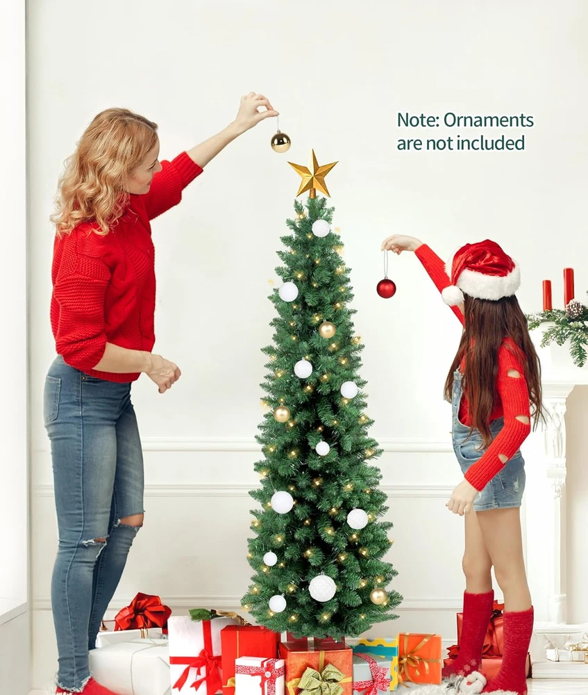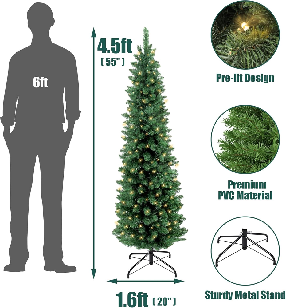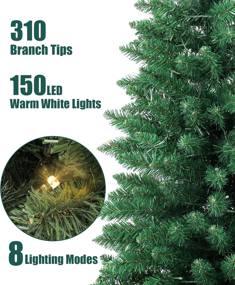 NATURAL LIFELIKE APPEARANCE - The realistic and festive appearance of this pencil Fir slim prelit christmas tree with lifelike branches adds a Christmas atmosphere to any setting; Number of Prelit Christmas Tree Branch Tips (4.5ft/6ft/7ft): 310/ 400/ 500 GREEN CLASSIC DESIGN - Artificially green branches are pre-strung in a series of warm white lights for a dreamy and Christmas appeal; Number of Lights (4.5ft/6ft/7ft): 150/ 200/ 220 EASY ASSEMBLE & FLUFFING - The semi-automatic branch trunk is easy to open and store-Just 3 steps: Simply fix the base and connect to the largest section(A) of the artificial christmas tree; Attach the remaining sections(B&C) and easily fluff the branches; Connect each set of male and female plugs, then plug into a socket to light it up. —Note: Gloves are recommended to fluff the leaves not to hurt your hands. HIGH-QUALITY CONSTRUCTION - Skinny pencil christmas tree branches and tips are made of premium PVC sustainable material, which makes them fire-resistant, harmless, and durable; the slim prelit christmas tree trunk and stand are made of sturdy metal, ensuring anti-collapse, sturdy and balanced, feel free to put on ball, star or other ornaments. CONVENIENT VERSATILITY - Instantly inspires the festive atmosphere of Christmas and add a touch of nature year-round; Press the light switch to explore various lighting modes and choose your favorite one; Accentuate different areas of your living space, office, or even a holiday party by customizing your prelit slim pencil christmas tree with garland, lights, ornaments, and more. Product description 1 Green 2 White 3 Pink 4 Black Get Yours Now and Dive into the Holiday Cheer! Color of Tree Green; White; Pink;Black Color of Light Warm White Light Material PVC + Iron Package Includes Christmas Tree×1; Metal Stand×1; Instruction×1; Screw×3 Shape of Tree Skinny Pencil Slim Tree Annecy Pre-Lit Artificial Slim & Full Christmas Tree Add to Cart Add to Cart Add to Cart Add to Cart Customer Reviews 4.0 out of 5 stars 32 4.0 out of 5 stars 32 4.0 out of 5 stars 32 4.0 out of 5 stars 32 4.2 out of 5 stars 23 4.2 out of 5 stars 23 4.2 out of 5 stars 23 Price — — $89.99 $ 89 . 99 — $125.99 $ 125 . 99 $119.99 $ 119 . 99 $119.99 $ 119 . 99 Tree Type Slim Pencil Slim Pencil Slim Pencil Slim Pencil Full Spruce Full Spruce Full Spruce Dimensions include 4.5ft/ 6ft/ 7ft 6ft 6ft 6ft 4.5ft/ 6ft/ 7.5ft 4.5ft/ 6ft/ 7.5ft 4.5ft/ 6ft/ 7.5ft Light Count 150/ 200/ 220 200 200 200 200/ 250/ 550 250 250 Tips Count 310/ 400/ 500 390 390 390 400/ 970/ 1200 970 970 Materials PVC, Iron PVC, Iron PVC, Iron PVC, Iron PVC, Iron PVC, Iron PVC, Iron Lighting Modes 8 Lighting Modes 8 Lighting Modes 8 Lighting Modes 8 Lighting Modes 11 Lighting Modes 11 Lighting Modes 11 Lighting Modes Light Color Warm White Light Warm White Light Warm White Light Warm White Light Warm White & Multi-Color Light Warm White & Multi-Color Light Warm White & Multi-Color Light