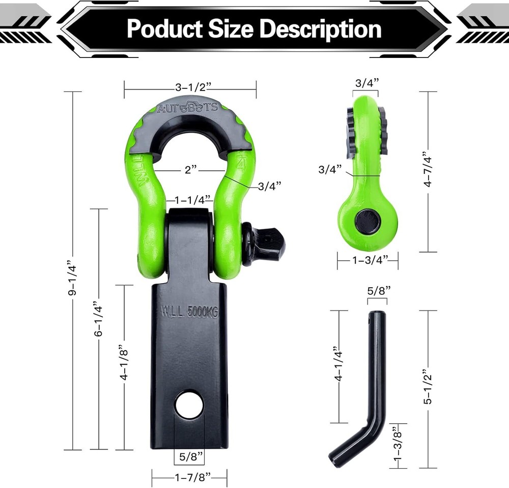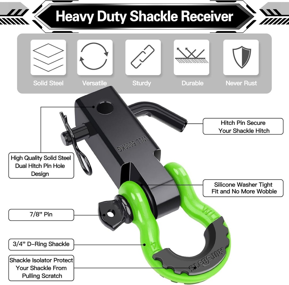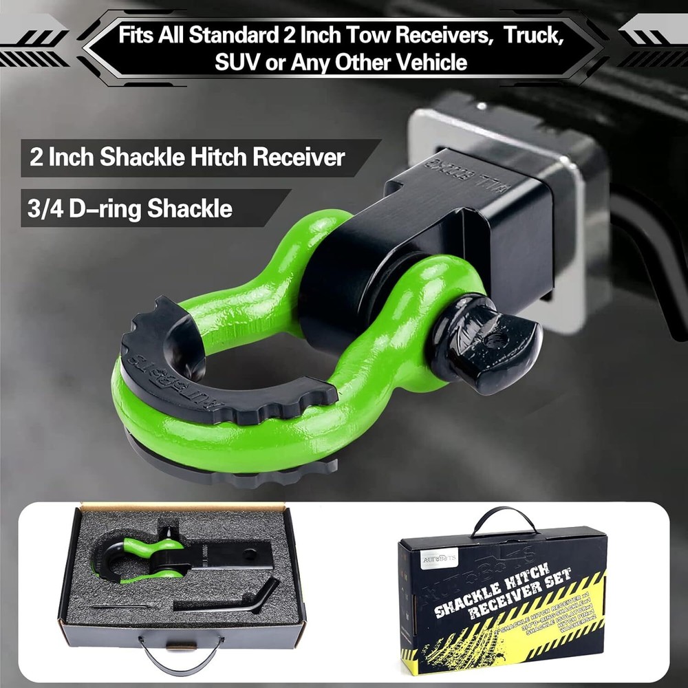 High-strength: our tow hitch receiver consisting of carbon steel with a breakpoint of 45,000 lbs. Shackle silicone isolators to prevent scratching when mounted. This shackle hitch receiver accessory is suitable for all towing applications Anti-rust: hitch receiver anticorrosive with electro-galvanized steel for added durability. The black powder coating provides trailer hitch receiver durable and strong protection against the hardest of conditions Multi-mount design: Shackle hitch receiver with 5/8" screw pin, 3/4 shackles isolator and washer to make it more stability. Dual hitch pin hole design allows the D Rings to swing horizontally or vertically for ease of use Multiple uses: tow hitch shackle fits all standard 2" tow receivers, turning your truck, SUV or any other vehicle into a towing machine built to resist any kind of harsh conditions. The rugged powder-coated finish provides superior corrosion resistance 100% Satisfaction Guarantee: We offer a refined plastic foam case. We offer a 30-day return guarantee. If you have any questions, please feel free to contact us and we will be available to answer your questions