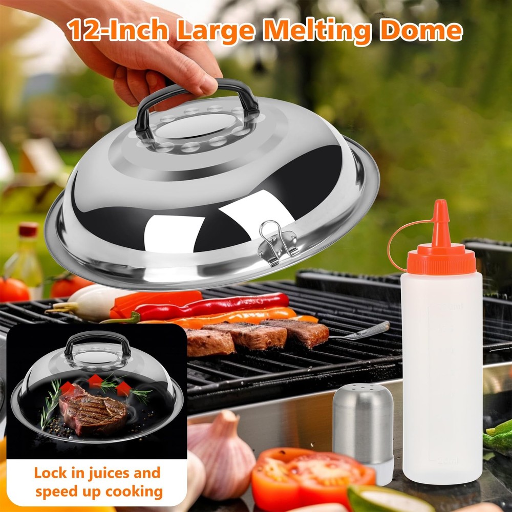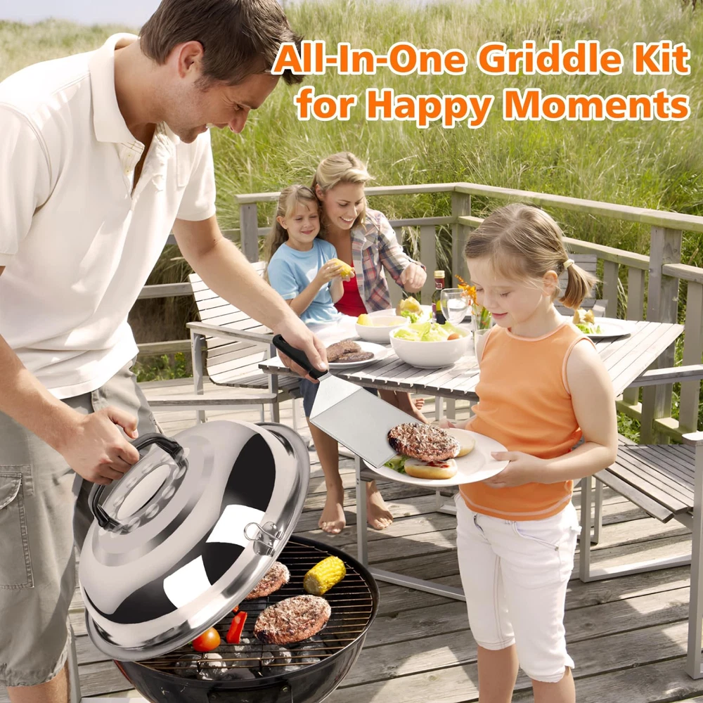 This griddle accessories kit is a game-changer for outdoor cooking! The 45-piece set has everything you need—spatulas, tongs, a burger press, and even a handy carry bag. The grill lid ensures even heat, and the quality is top-notch. Perfect for Blackstone grills, it makes cooking effortless and fun. A must-have for any grill master!