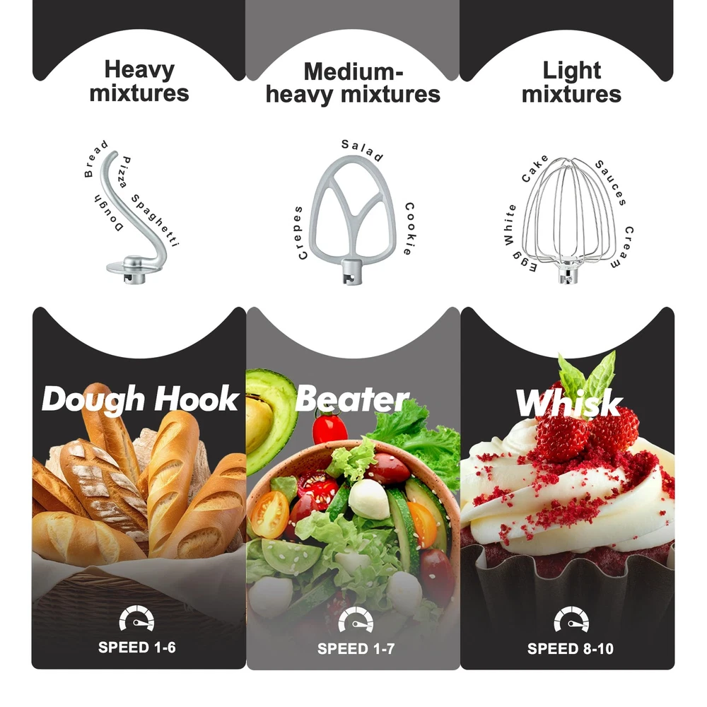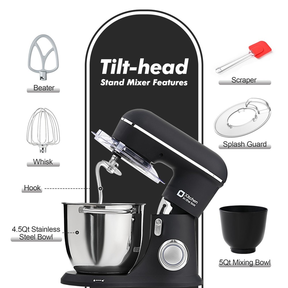 Kitchen in the box two bowls Stand Mixer,a best assistant of your kitchen.Equipped with 4.5Qt Stainless steel bowl and 5QT mixing bowl, suitable for all your family baking need, nested bowl design can easy to storage in the cabinet,such a good helper for space-saving!Otherwise,kitchen mixer has many colors to choose,meet different aesthetic needs. As daily mixer,it is easy to operate and clean up,press the button to turn off the tilt head when mixer running,which is more safer.And transparent anti-splash lid could prevent the ingredient making a mess. This Kitchen Mixer has 10 different speed options,suitable for mixing bread dough, thick batters, meringues, and whipping cream, plus lower speeds for stirring and finessing your most delicate concoctions,could suit perfectly to different ingredients.Chassis 4 stronger suckers,can keep the machine steady and avoid moving or bounce during operation. More importantly,our electric mixer upgraded the multi attachments,aluminium dough hook and flat beater,stainless steel whisk,more sturdy and durable.And dishwasher safe. Feature 4.5Qt stainless steel bowl with dual Handles Extra 5QT plastic mixing bowl Planetary rotations for thorough mixing Transparent anti-splash lid without opening 10 speeds 4 anti-slip suction feet Upgraded aluminium dough hook and flat beater,stainless steel whisk Tilt-up head allows easy removing of bowl Low operation noise Parameter: 120V 60Hz 450W regular, 660W Max Package include: Machine unit Mixing beater Egg whisk Dough hook Scraping rod Anti-splash lidachine unit Mixing beater Egg whisk Dough hook Scraping rod Anti-splash lid Elegant Designed And Matte Finish - The electric mixer with modern design look and unique matte finish, not only work well but also look well. Nested bowls design for space-saving Perfectly suitable for various of your household baking need. And multiple colors to choose,meet a variety of aesthetic needs for your kitchen. Two Mixing Bowls- Our Stand mixer equipped with 4.5QT stainless steel bowl and 5QT extra food safe plastic mixing bowls, perfect for a variety of mixing and baking needs. Special Nesting design for nest two bowls together and offer space-efficient storage. 10 Speeds and Tilt Head Design - This Kitchen mixer has 10 different speed options,suitable for mixing bread dough, thick batters, meringues, and whipping cake cream, plus lower speeds for stirring and finessing your most delicate concoctions,could suit perfectly to different ingredients. Tilt-head design mixer allows access to install or uninstall bowls and accessories easily. Upgraded Accessories and Dishwasher Safe- Aluminium dough hook and flat beater with protection layer,stainless steel whisk are all easy to attach,more sturdy and durable. All of the attachments for the food mixer are dishwasher-safe for quick and easy cleaning. Excellent Gift and Support - The electric stand mixer is also an ideal gift for your family and friends. We have confidence in the quality of our products, if you have any questions when received or during your using, please feel free to contact us via Amazon. We provide 24/7 online after-sales service for you.