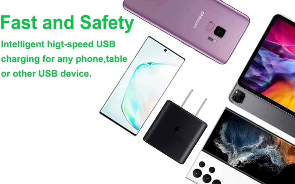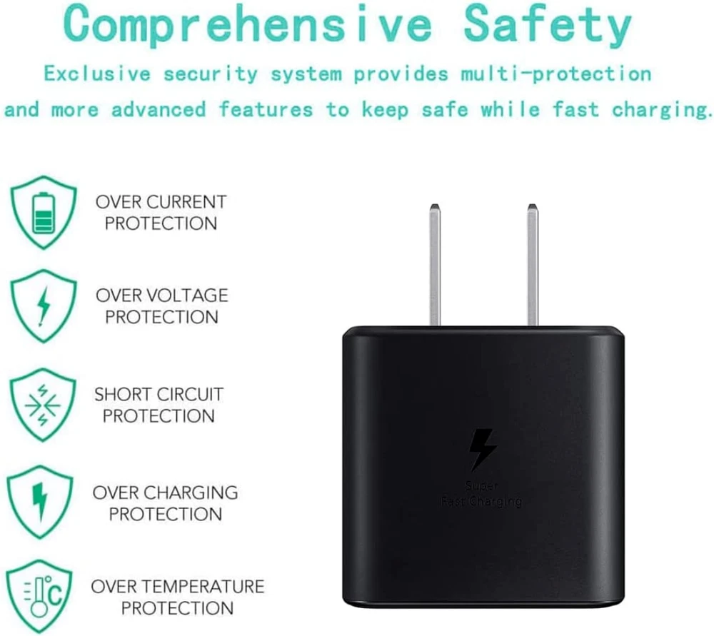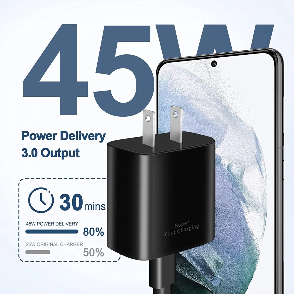 45W Wall Charger Specification: [Type]: 45W PD3.0 fast charge charger [Output power]: 45W [Material]: Fireproof ABS Plastic + PC [Port Type]: USB-C [Input voltage]: AC 100-240V 50-60Hz [Working temperature]: 0-70℃ [Output voltage]: PDO : 5V/3A or 9V/3A or 15V/3A or 20V/2.25A [Output current]: PPS : 4.05A(3.3-11V) or 2.8A(3.3-16V) or 2.1A(3.3-21V) [Output protection]: Over-current protection,short circuit protection, overvoltage protection, overheat protection. 45W Wall Charger Feature: USB-C PD3.0/QC3.0 Fast Charger 1.Universal Compatibility: 45W PD USB Type C wall Charger , PD3.0 QC3.0 dual technology perfect work compatible iPhone 14 series,iPhone 13 series/Samsung S22/Note 20 etc. 2.Safe Charging & Syncing -- Type C USB Awall adapter with intelligent chip automatically detects and delivers the optimal charging power for connected devices, to guarantee fast charging while protecting battery life. Over-current, over-voltage and short-circuit protection effectively protect your devices from damage and ensure the safer charging overnight. 3.Compact Size: comes in a pocket-friendly size, easily portable and lightweight, can go wherever the journey takes. 4.No Charging Cable in package, You need to use your original charging cable. Fast Charging Cable Features: 1. Type C to Type-C Cable: USB-C connector offers a user-friendly reversible design, fast Charging and transferring, Up to 480 Mbps data transfer speed; power output up to 3Amp. 2. Support QC and PD fast charge, support data transmission. Fast charging your USB-C laptops, tablets and smartphones by using 60W 45W 30W 18W 15W USB-C Power Adapters, suports PD 3.0 and QC 3.0 fast charging. Data transfer speed is up to 480Mbps. 【Note: Not support video output.】 3. Suitable for charging mobile phones, earphones, iPad, laptops (over 60W recommended 100W charging cable) 4. Strong toughness, not easy to break when bending 6. Anti-fracture design, upgraded 3D aluminum connector and unique laser welding technology can ensure that the metal parts will not break. 6. The high-quality nylon braided cable has increased durability and no tangles. The special stress relief design can withstand 10,000+ bending tests. Compatible device model: -For iPad Pro: For iPad Pro 12.9" 4th Gen (2020), iPad Pro 12.9" 3rd Gen (2018), iPad Pro 11" 4th Gen (2020), iPad Pro 11" 3rd Gen (2018) which is USB C port. -For Samsung: Galaxy S22/S22+/S22 Ultra, Galaxy S21/S21+/S21 Ultra, Galaxy S20 FE/S20/S20+/S20 Ultra, S10, S10+, S10e, S9, S9+ Plus, S8, S8+ Plus/Active, Note 20/20 Ultra, Note 9, Note 8, Note 7... -For Google: Pixel, Pixel 2, Pixel 3, Pixel 4, Pixel XL, Pixel 2XL, Pixel 3XL, Pixel 4XL, Pixel 3A, Pixel 3A XL... -For LG: G7 Thing, G6, G5, Stylo 4, V20, V30, V35, V30S, V40 ThinQ Plus... -For Motorola: Moto G6, G6 Plus, G7 Plus, G7 Power... -For other Type-C devices Package includes: 45W Wall Charger+3FT 5A Dual Type-C Fast Charging Cable
