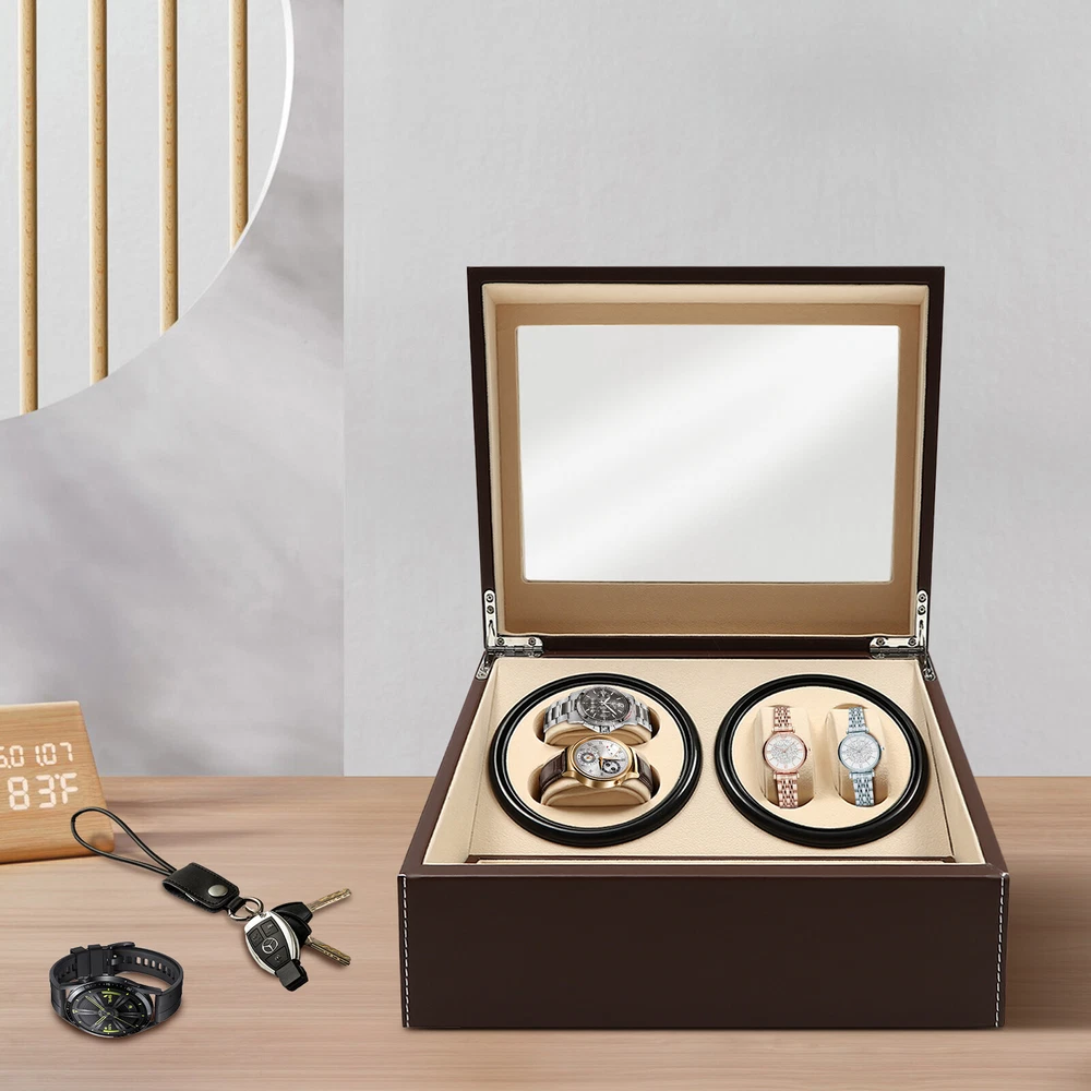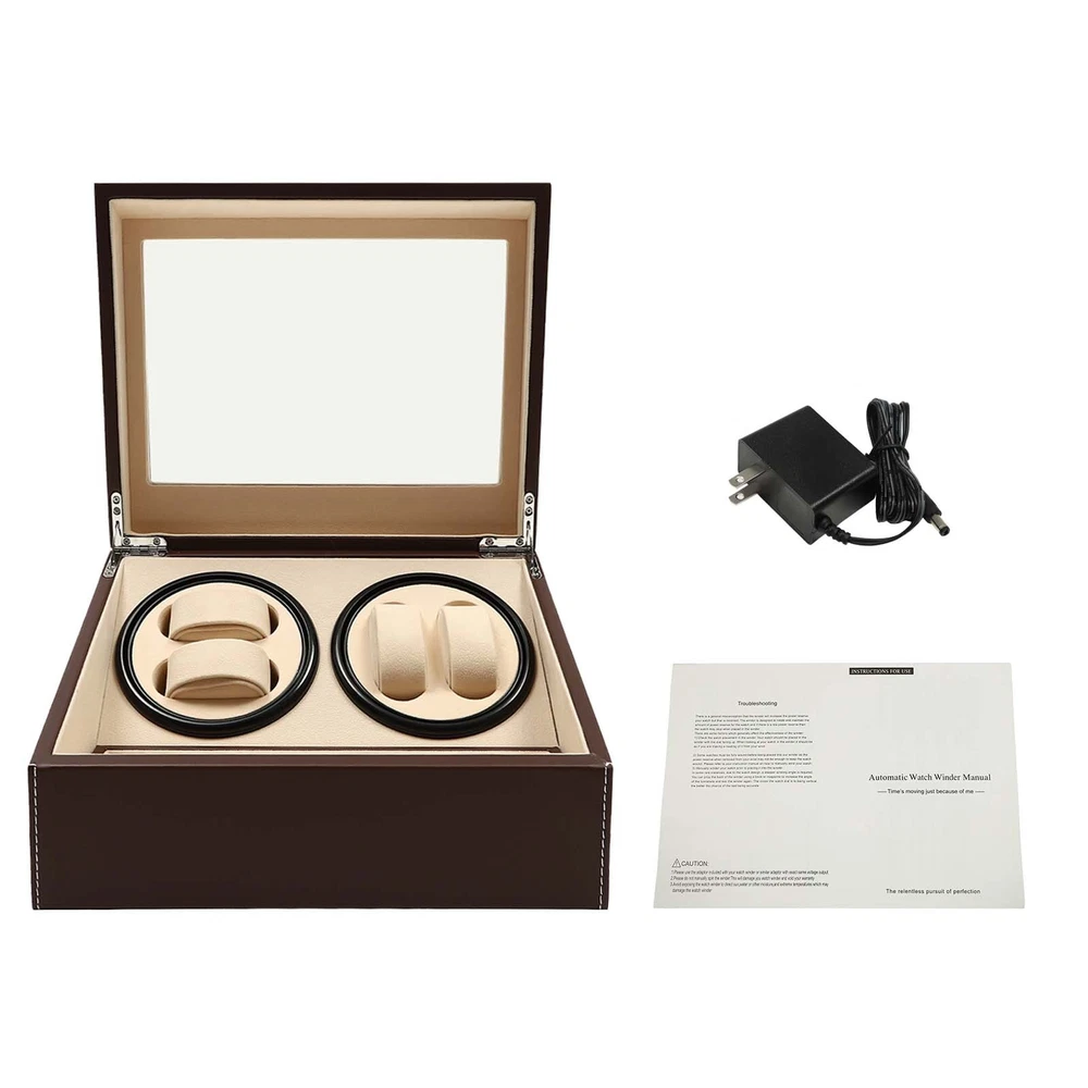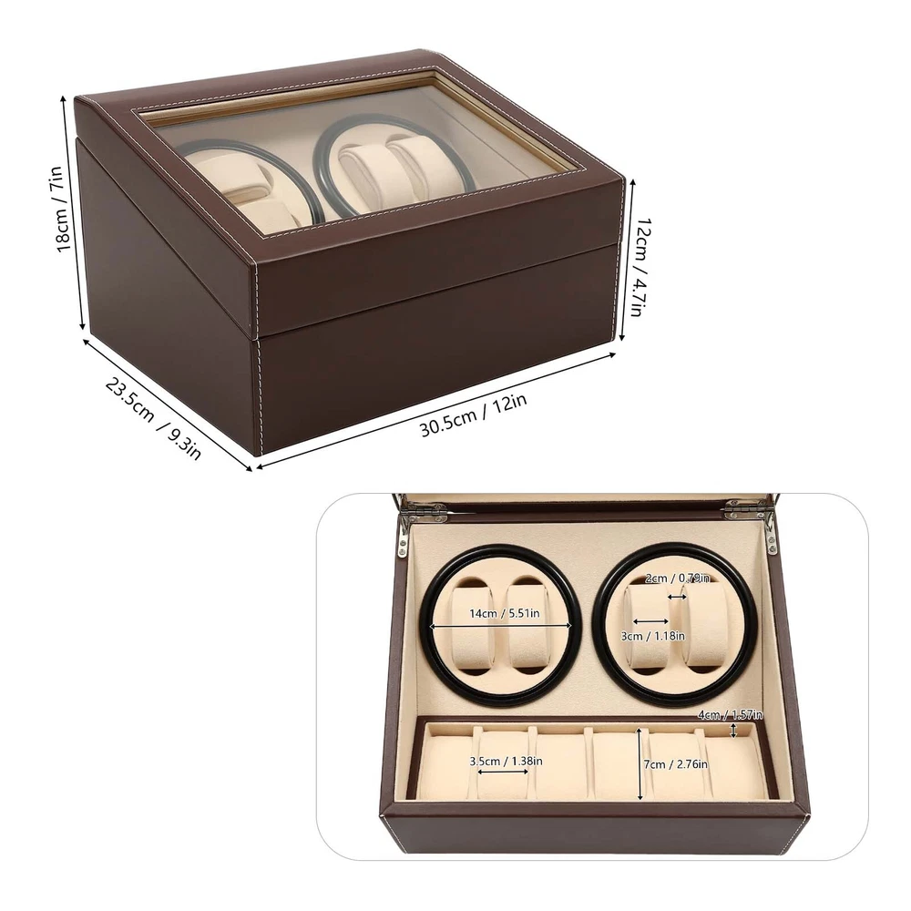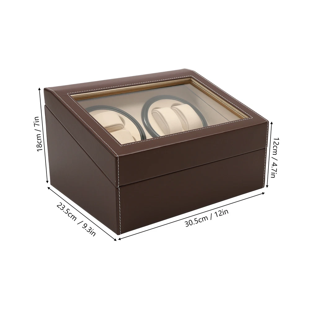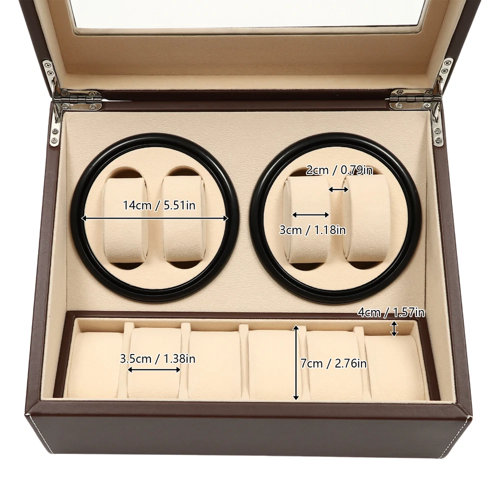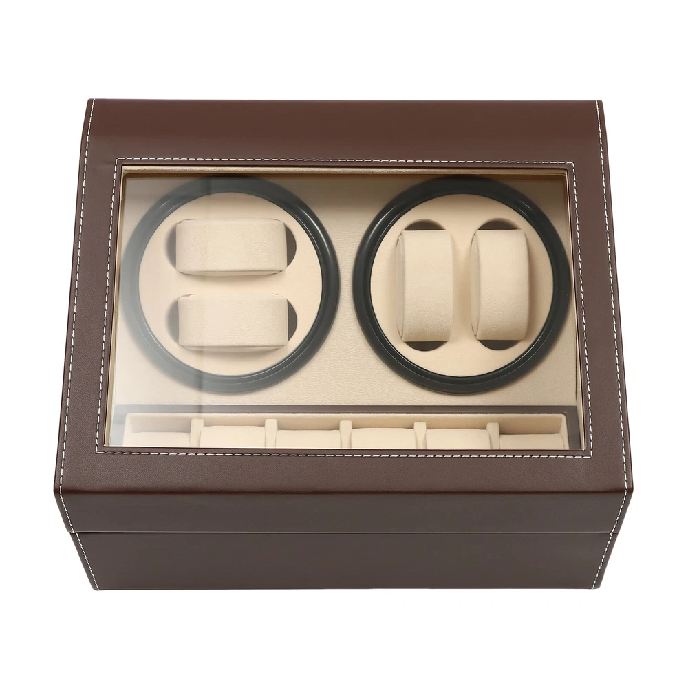 4+6 Automatic Watch Winder Storage Box Watch Display Case Jewelry Organizer New Description This 4+6 watch box can store up to 10 watches with 4 of them displayed on the rotating spots. You can view the watches in the box through the glass window. It is ideal for selling at stores or for personal use at home. Key Features Large Capacity: This watch box can store and display 10 watches of almost all types and sizes. Automatic Rotating Display: This watch box is equipped with two clockwise/counterclockwise motorized rotating dials for displaying the watch in all directions. Unique 4+6 Design: Our watch box has 6 storage spots and 4 rotating display spaces, where through the glass lid you can clearly see your collections. Easy to Clean: The leather surface and glass cover are easy to clean. You just need a clean cloth wipe it gently. Rotation Mode: The rotation runs automatically. It rotates clockwise and counterclockwise alternatively for 2 minutes with a 6-minute break in between. Removable Pillow: If you want to place other jewelry, you can either remove the pillow or fix the jewelry on the it. Watch Protection: The soft watch pillow is made of plush material to ensure the watch is well-protected. Extreme Quiet Motor: The automatic rotating meter box with a low-decibel motor is espeically suitable for people who are sensitive to noise. Details Leather Surface : The watch box is made of leather, which is more dust-proof, scratch-proof, and shock-proof, it is safe and comfortable to use. Transparent G lass C over : The watch box cover adopts clear glass material, so you can view the watch without opening it. Application It is perfect for storing and displaying your watches in a store or at home, regardless of the types or sizes. Specification Color: Brown Box Material: PU Leather (Surface)+Wood Board+Beads Cashmere (Lining) Net Weight: 3.3kg Gross Weight: 3.8kg Overall Dimensions: 12x 9x 7inches (Lx Wx H) Removable Pillow Size: About 2.5x 1.2 x 1.5inches (Lx Wx H) Display Window Size: 10x 6inches (Lx W ) Watch Slot Size: 2.75x 1.25x 2inches (Lx Wx H) Package Size: 36x 29x 24cm (14.2x 11.4x 9.5inches) Package Included 1 x 4+6 Automatic Watch Box 10 x Removable Pillows 1 x Power Cord 1 x English Manual Notes: Before starting to rotate, please make sure that the watch strap has been fixed on the pillow to avoid bumping. When the dial is still rotating, please do not take out the watch by hand. Please do not put the watch box in a damp or sun-exposed place, preferably in a dry and ventilated spot instead. Please allow1-3 mm error due to manual measurement, and make sure you do not mind before ordering Warm Note: The Power Cord Is in the Foam Board, Please Be Careful Not to Drop It Directly. Payment Delivery details Terms of sales About us Contact us Payment We accept ebay payment 。 Fees such as import duties, taxes are not included in the item price or shipping costs. These charges are the buyer's responsibility. Delivery details Shipping: 2-9 working days to: USA Terms of sales We maintain high standards of excellence and strive for hundred percent customer satisfaction. Feedback is very important to us. We hope that you contact us immediately before you give neutral or negative feedback, so that we can address your concerns. It is impossible to address issues if we do not know about them! About us Your satis faction is our ultimate goal. We work hard to earn your trust and future business. Our certified technicians have tested each item before shipping. The unit comes with 1 year limited warranty on all manufacturing defects. a) If you receive a defective item, you may return it or ask for a discount. Please contact us within 14 days after you receive the package. b) What you returned must be intact and in its original packaging as re? u. Customer is responsible for shipping costs of the returned item. c) We will cover the cost of shipping back t with the shipping rate indicated in the registration page. We will send you a new unit or refund the full payment you paid. Thank you. Contact us Business Hour Business Hour: Monday To Friday: 8:30 AM to 5:00 PM (Beijing China time) Due to time zones, our reply to your questions may not be immediately. But within above working time, we will reply your email within 24 hours. If it's non-workdays, please kindly be patient and wait till Monday. Please contact us with ebay message. Please feel free to contact us if you have any questions. Monday To Friday: 8:30 AM to 5:00 PM (Beijing China time) Due to time zones, our reply to your questions may not be immediately. But within above working time, we will reply your email within 24 hours. If it's non-workdays, please kindly be patient and wait till Monday. Please contact us with ebay message. Please feel free to contact us if you have any questions.