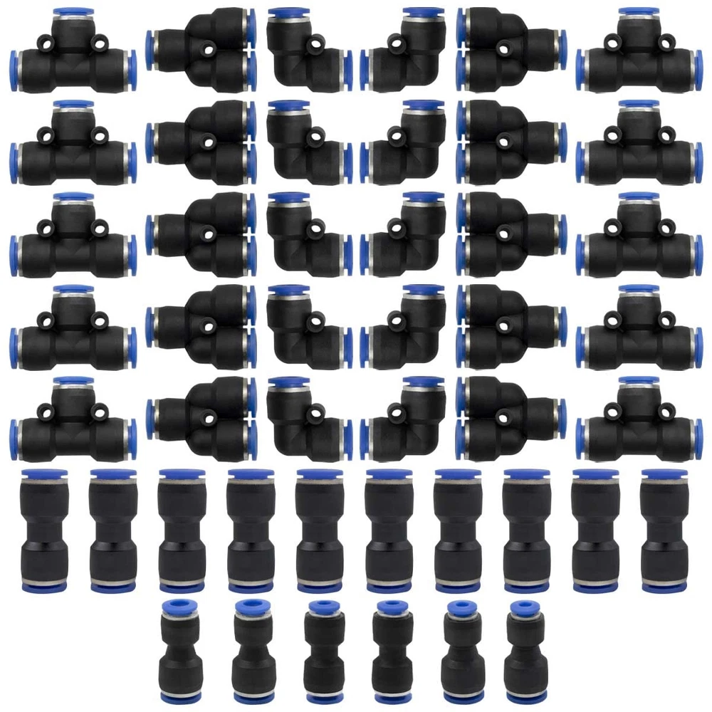 【Package】 46 Pcs Air line Pushing Connectors, incuding 12mm straight/Elbow/Tee/Splitter Connectors and 2 pcs 6-12,8-12 ,10-12mm reducing connector. 【Dual Application】:The straight/Elbow/Tee/Splitter pneumatic connector is used to connect polyethylene, nylon and PU tubes, air pipes and pneumatic tools, widely used in industries automatic equipment like machinery, electronics, automobile, packaging. 【Working Environment】: 0-8 bars. Working Temperature: 0-60°C. Applicable Tube: PU/Nylon/PE. 【Quality Goods】This fittings are made of high quality brass plastic, durable and no air leakage for long term use. Built-in stainless steel locking claw and NBR O-ring, you'd never worry about that tube falls off. High pressure resistance, can withstand strong pressure without tripping, so no tripping needed. 【Easy to Intall】 No extra sealing is required, just a simple push to connect to the tube and they are tightly connected. Elliptical release rings at both ends are more convenient to disassemble without extra tools. In addition, those fittings are flexible and space-saving, 360-degree rotate freely.