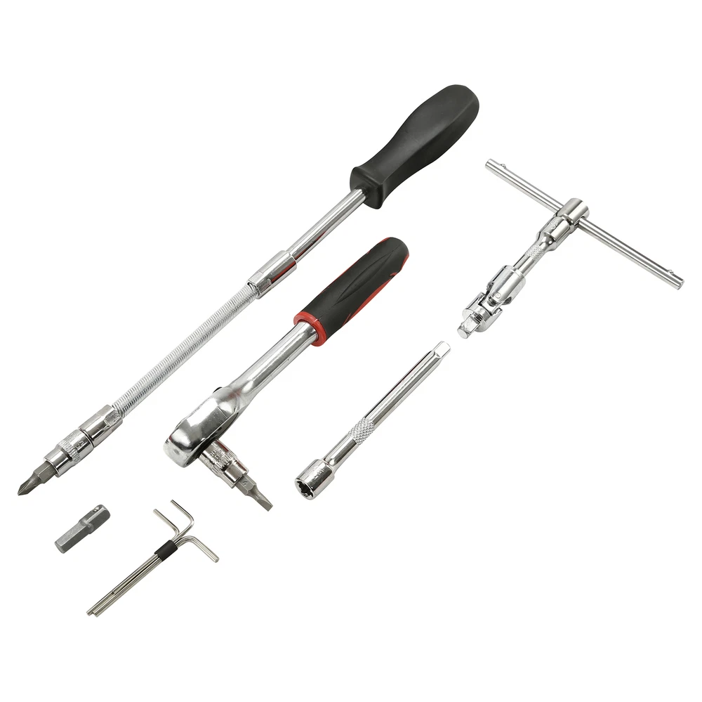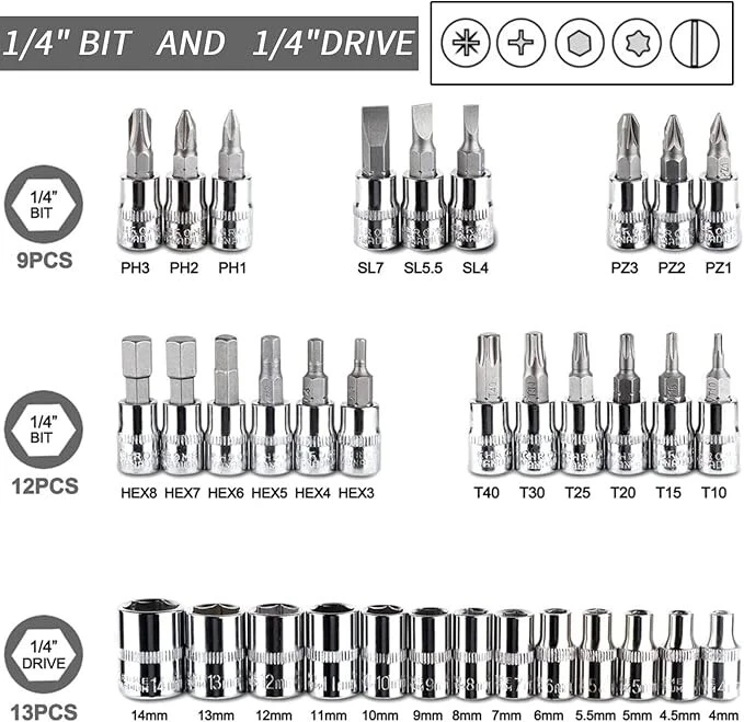 DESCRIPTION: Main Material: Chromium-vanadium steel This item is well made of premium material for durable and practical use. With high quality and precise design, it will ensure its popularuty and practicability. There are 46 pcs of tools that will meet all your needs. Perfect accessory kit for car owners. PACKAGE INCLUDE: 21PCS - BIT SOCKETS: SL4, 5.5, 7 PH1, 2, 3 PZ1, 2, 3, HEX3, 4, 5, 6, 7, 8 T10, 15, 20, 25, 30, 40 13PCS - 1/4"" DR SOCKETS: 4, 4.5, 5, 5.5, 6, 7, 8, 9, 10, 11, 12, 13, 14MM 3PCS - HEX KEY WRENCHES: 1.5, 2.0, 2.5MM 1PC - 1/4"" DR UNIVERSAL JOINT 1PC - 1/4"" X2"" EXTENSION BAR 1PC - 1/4"" X4"" EXTENSION BAR 1PC - 1/4"" X6"" FLEXIBLE EXTENSION 1PC - 1/4"" DR SLIDING T BAR 1PC - 1/4"" QUICK RATCHET HANDLE 1PC - 6"" SPINNER HANDLE 1PC - BIT ADAPTOR 1PC - BLOW CASE On Oct 14, 2024 at 08:35:18 PDT, seller added the following information: