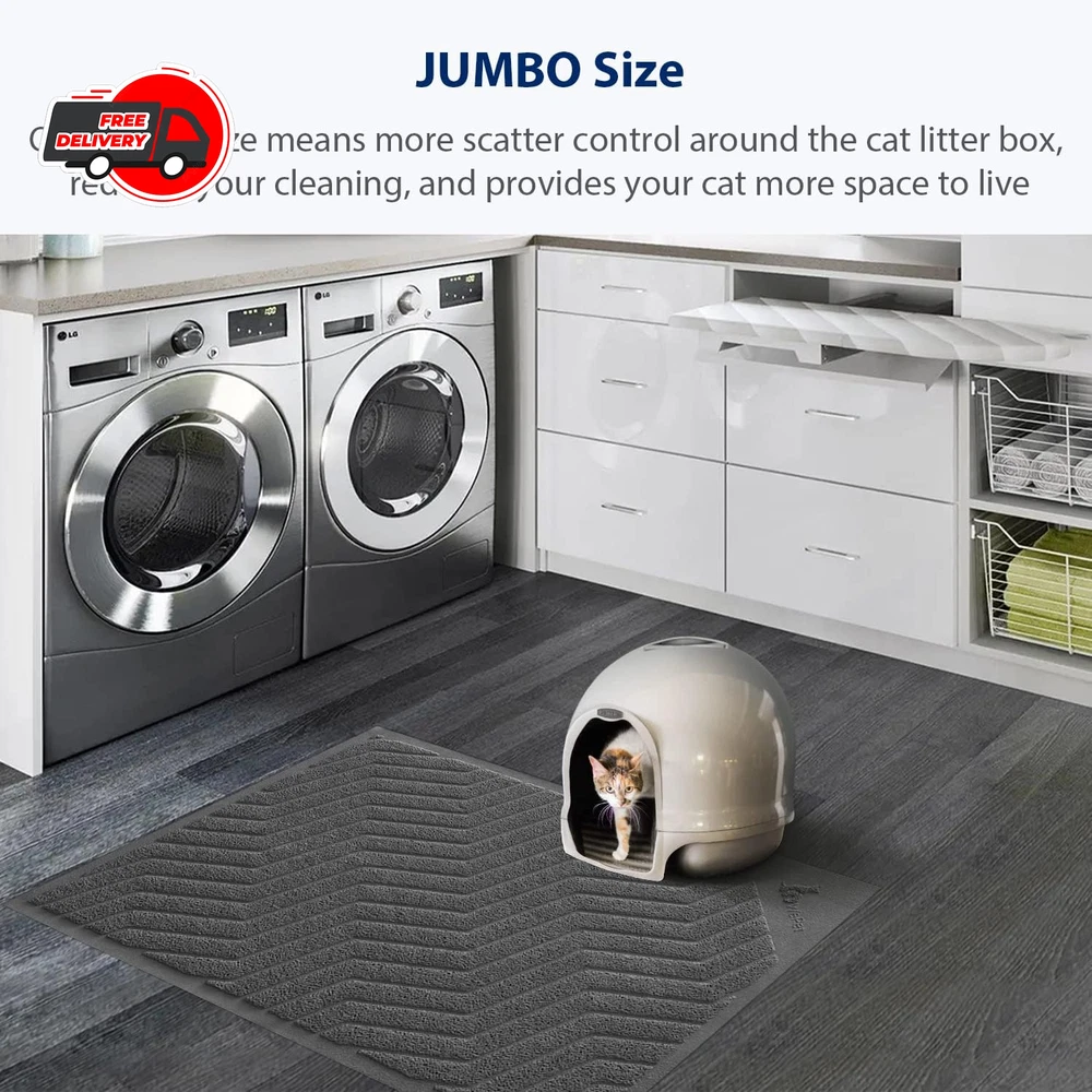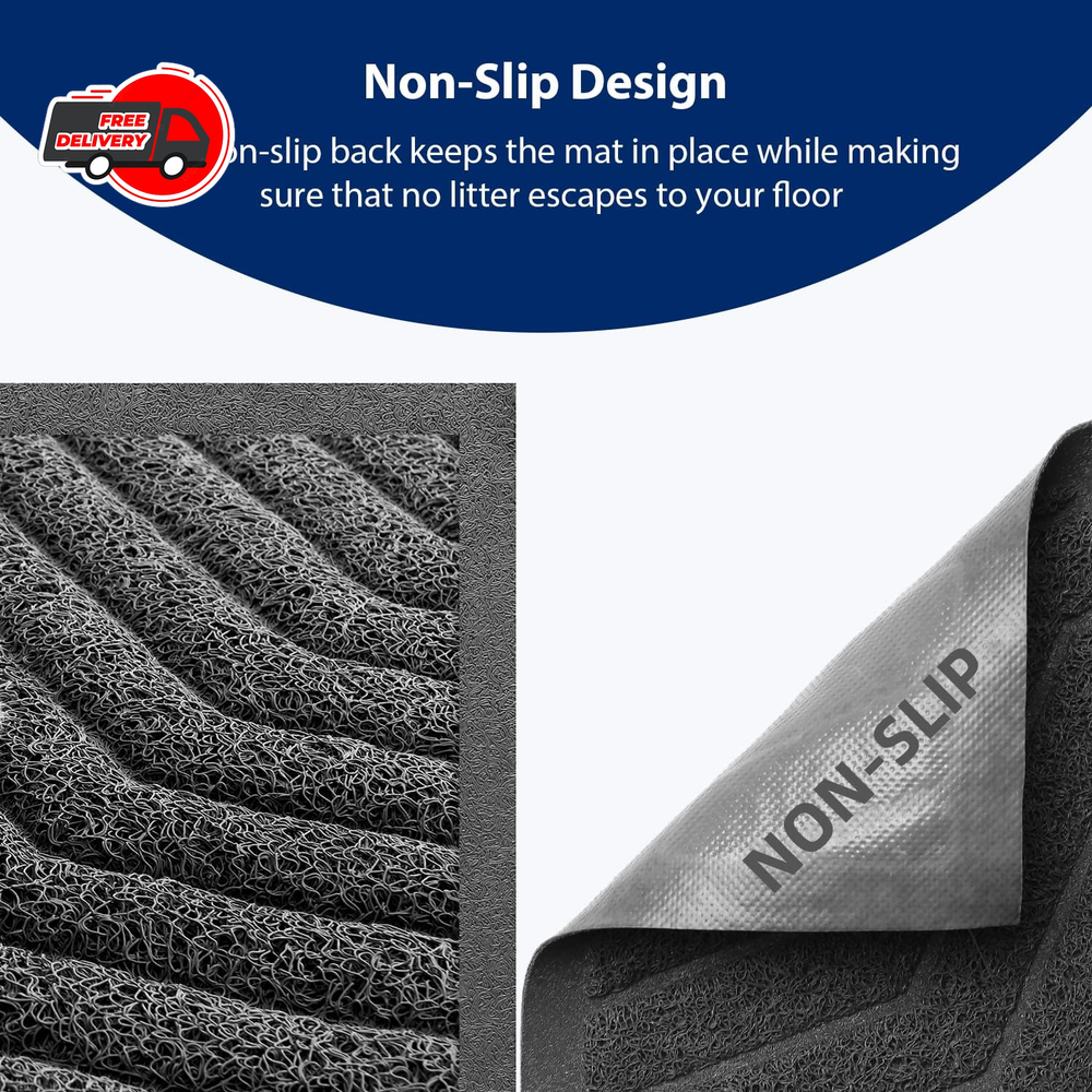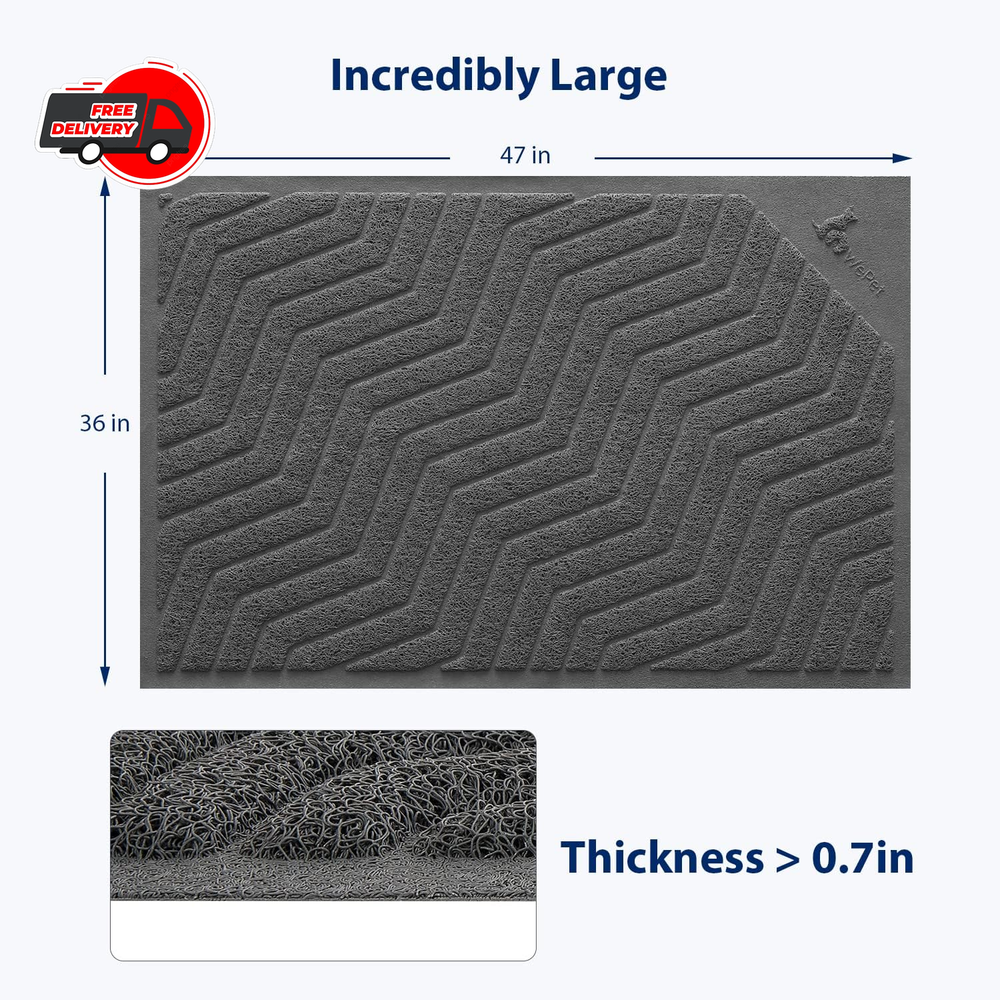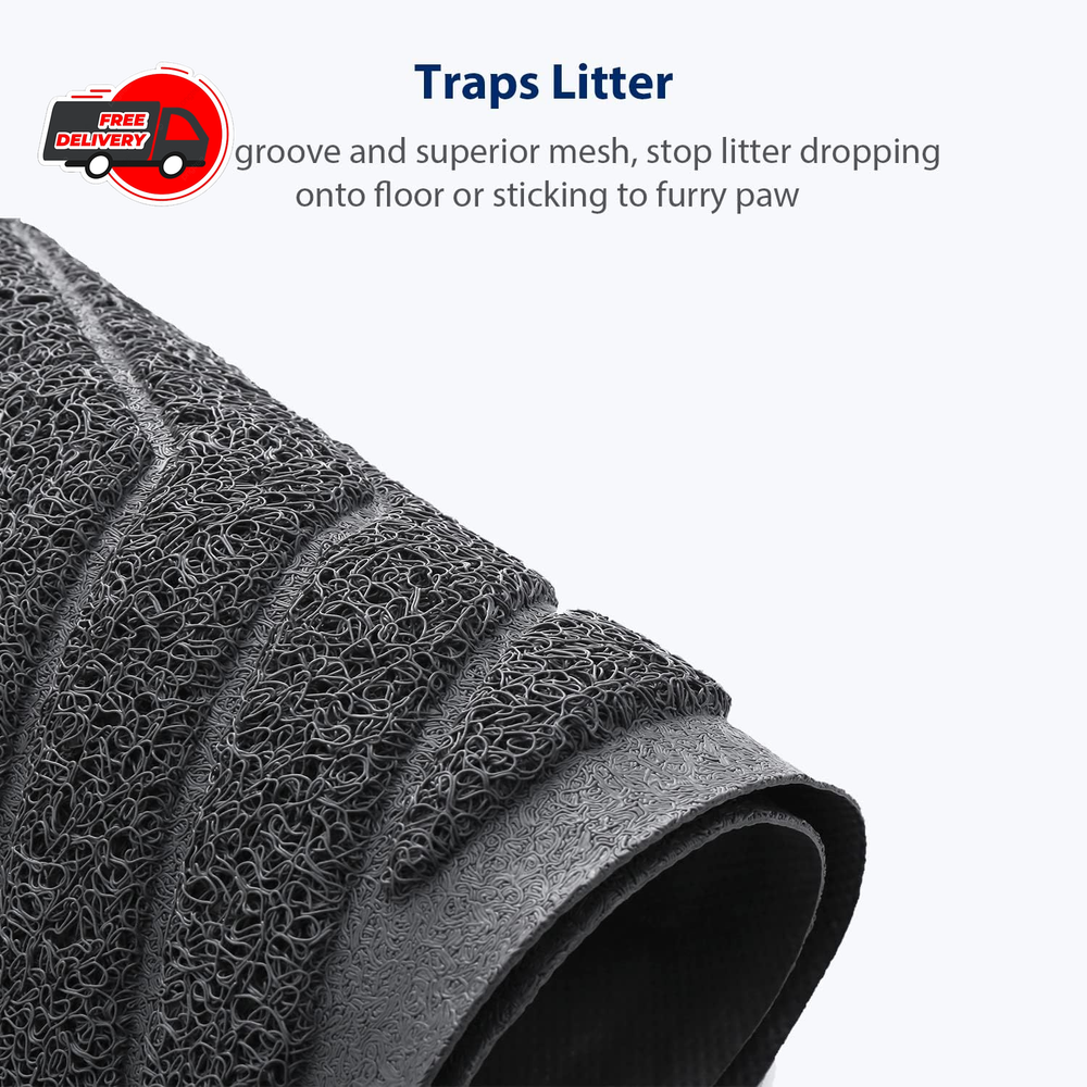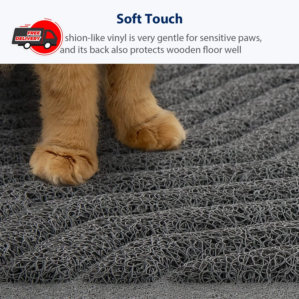 [Color & Size]: GREY XXL; Length 47" x Width 36" x Height 1/3" Inch [DESIGN]: With creative design upgraded based on repeated tests, this mat features deep groove and superior mesh, using carpet fiber technology to stop litter dropping onto floor or sticking to furry paws. The mat is large enough so that you have less sweeping to do around the litter box. [FUNCTIONS]: This mat traps 95% more litter. Open web construction removes, traps and hides scattered litter more easily. Flexible coils brush Kitty’s paws efficiently. [FEATURES]: This mat is long lasting, water & urine resistant, soft for paws and easy to clean. The non-slip back keeps the mat in place while making sure that no litter escapes to your floor. Elegant design blends beautifully with both modern and traditional home decor.