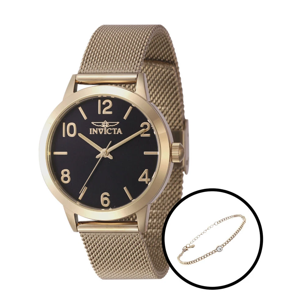 This impressive Invicta Wildflower watch features a precise Quartz movement as well as a gold case. Its black, brass dial is enclosed by a highly protective Mineral Crystal. This watch is finished by a strong gold, band, and it offers 30 m water resistance. A summon to all stunning sirens. Ever true to the very essence of the source for inspiration, the Invicta Wildflower collection is most deserving of female attention. Capturing the contradictions of its muse, the timepieces of Wildflower are flawlessly integrated representations of elegance and strength. Realized with features including diamonds, gemstones, mother of pearl, textured or pave dials, and Swiss movements, Invicta has embraced the paradox and has found the brilliance in the bloom. Year: 2023 Collection: Wildflower Series: - Product Family Code: PF21024 Limited Edition Threshold: - Band Material: Stainless Steel Band Tone: Gold Band Size [mm]: 16 Band Length [mm]: 190 Interchangeable: No Bezel Color: None Bezel Material: None Buckle Type: Buckle Case Material: Stainless Steel Case Tone: Gold Case Size [mm]: 34 Crown Type: Push Crystal: Mineral Dial Material: Brass Dial Color: Black Function Type: Quartz Chronograph Function: None Gender: Lady Luminous Material: None Luminous Color: None Movement Caliber: PC21J Movement Components: Japan Movement Jewels: - Movement Origin: Japan Movement Vendor: TMI Swiss Made: - Diamonds TCW: 0 Case Thickness: 8.00 UPC Code: 886678626779 Water Resistance [m]: 30 Weight: 60 TERMS OF SALE: - Payment Is Expected Immediately. An Unpaid Item Case Will Be Opened After 48 Hours of Non-Payment. - All Items Usually Ship Within 1 Day of Cleared Payment Monday-Friday. All Orders That Come in Over the Weekend Won't Ship Until Monday Unless There's a Holiday. - Double Check Your Shipping Address Before Finalizing Purchase. We Ship to the Address Provided By eBay, Made Sure Yours Is Up to Date. - Your Tracking Number Will Be Uploaded on Ebay Once We Print Label for Your Order. - Buyers Can Use "ask seller a question" For Questions and We Will Respond Promptly. OUR RETURN POLICY: - Returns Are Accepted Within 14 Days After the Delivery Date. - Returned Item Must Be in Its Original Condition Including Box Packaging & All Accessories (protective plastics intact, tags and documents, boxes, and accessories unused and undamaged). - Refund Is for Exchange When Available or Full Refund Less the Shipping Charges Paid to Shipping Company for Delivery to Your Location. - Refused Shipments or Returns Due to Buyer's Remorse Would Incur a Restocking Fee Of 15% Of the Item. Addresses Entered Incorrectly and Customers Not Available for Delivery Are Included as Refused Shipments. - Items Returned in Any Condition Other Than as Shipped Out May Add to the Restocking Fee Up to 50% Or Cause the Item to Be Refused and Shipped Back with No Refund Applied at Buyer's Expense