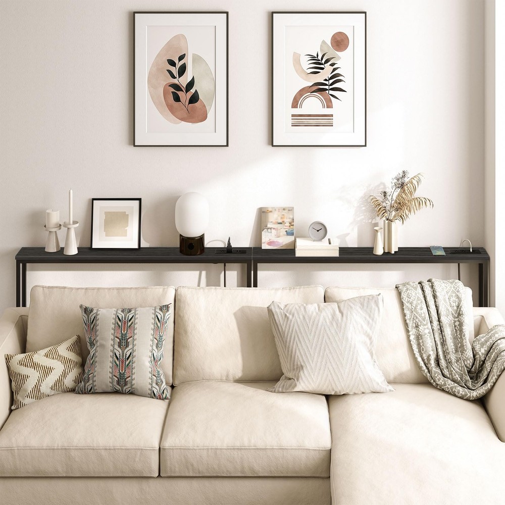 This skinny console table is a game-changer for tight spaces! Fits perfectly behind the couch or in a narrow hallway while adding stylish storage and a built-in charging station. The rustic brown and black finish gives it a modern yet cozy look, and the sturdy particleboard and metal construction ensure durability. No more cluttered countertops—now I can charge my devices and keep everyday essentials neatly tucked away. Super functional and sleek!