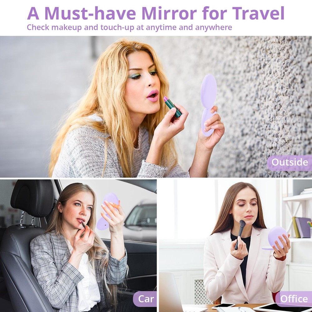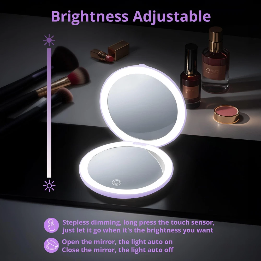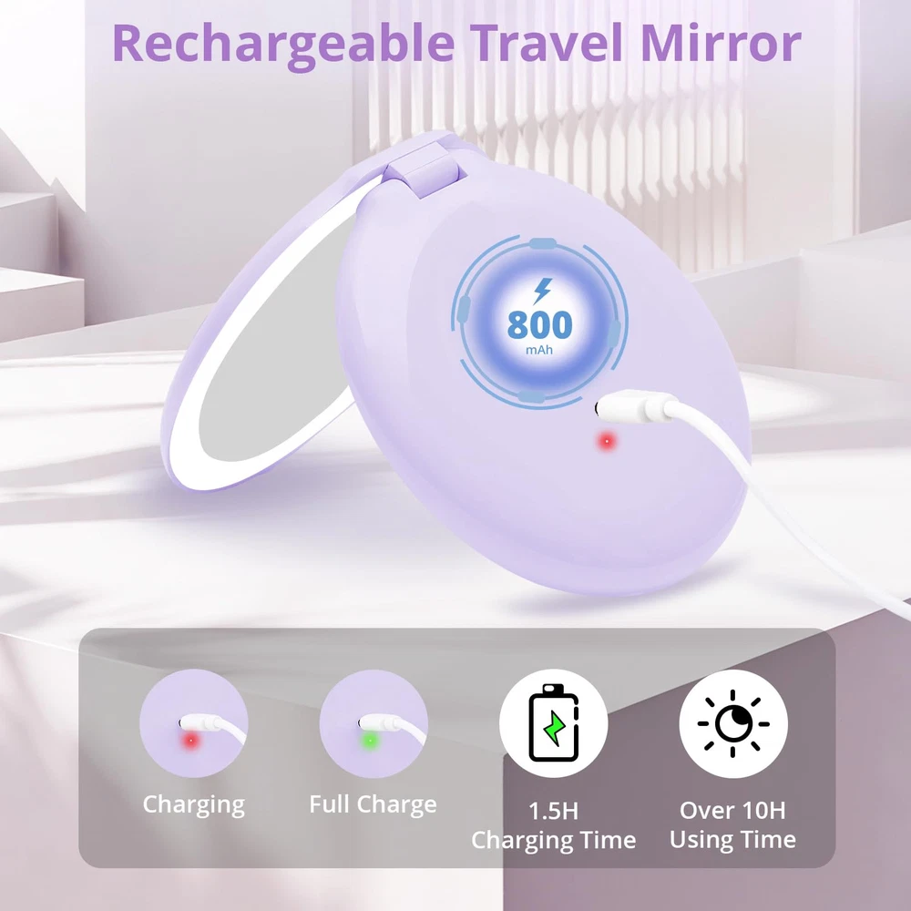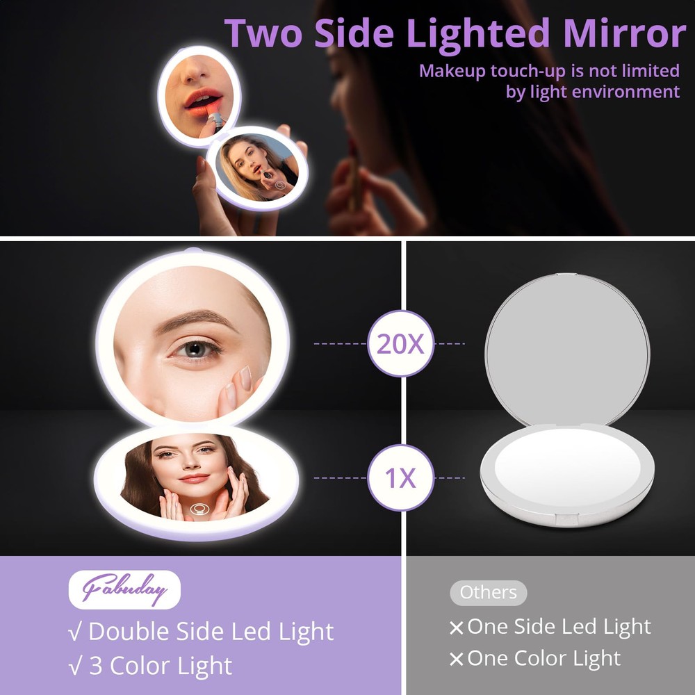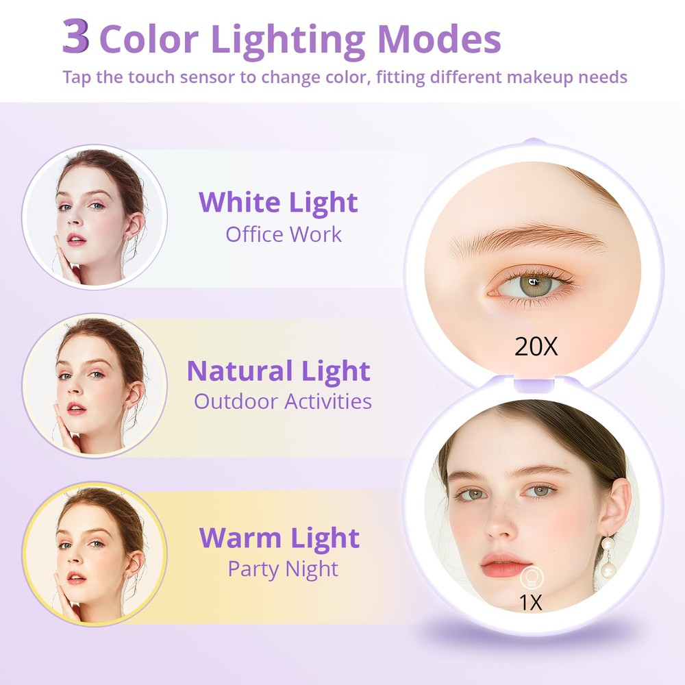 Double Sided Lighted Mirror with 1x/20x: Upgraded compact mirror provides lighting for both mirror sides. 20x magnified mirror make you more efficient in doing face beauty, checking skin and hair style, and eyelash makeup Travel Essentials for Women: Folding travel mirror has a cute size to fits backpack, purse, bag, luggage. You could carry it on the go for traveling, business trip, road trip, camping etc. Check your makeup anytime and anywhere to make sure your makeup stays in perfect condition. A must have travel gift for women Large 4.8 inch Wide Design: It's size bigger than other compact mirrors, but enought portable fits your purse. Large size allows you to check your entire face, unlike small size allows you to see only a small part of your face 3 Color Lights & Stepless Dimming: Electric illuminated mirror provides warm/natural/cool light to meet the makeup needs of date/outside/office. Tap the sensor to turn ON/OFF the lighting, long press 3s to adjust the brightness. The light will automatically turn on or off as the mirror opens and closes Rechargeable for Cordless Use - Light up face mirror built-in 800 mAh lithium battery, suitable for home and trip, meets your cordless use need. It can be continue to light up 3 hours in the highest brightness state, only takes 1.5-2 hours to fully charge the mirror. It comes with type-c cable