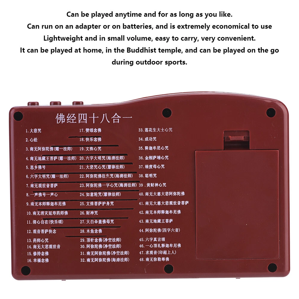 48 Songs Great Compassion Bud dha Sound Machine Buddhist Supplies Decoration Features: 1. Can be played anytime and for as long as you like. 2. Can run on an adapter or on batteries, and is extremely economical to use. 3. Lightweight and in small volume, easy to carry, very convenient. 4. It can be played at home, in the Buddhist temple, and can be played on the go during outdoor sports. 5. Everyone can take part in chanting for peace in their home - just turn on the chanting player and chant along with it. 6. Chanting Buddhist gives a sense of tranquility and provides a peaceful . Specification: Condition: 100% Brand New Material: Plastic ABS Color: As pictures shown Process: Semi-manual, semi-mechanical Size: Approx. 15.4 * 10.2 * 4.6cm / 6.1 * 4 * 1.8in Battery: 3 * AA battery (not included) Package list: 1 * Buddha Machine 1.We Ship to Worldwide. 2.Delivery time depends on destination and other factors, it may takes up to 15-30 days. If you don't receive the item after 35 days, please contact us, we'll investigate and solve the delivery problem. 3.Shipping days exclude weekends and public holidays. 4.Import duties, taxes, and charges are not included in the item price or shipping cost. These charges are the buyer's responsibility. Please check with your country's customs office to determine what these additional costs will be prior to bidding or buying. 1.Accept paypal only, 2.We only ship to confirmed ebay addresses. When you make payment,please confirm it.Thank you. 1.30 days money back or item exchange, seller pays return shipping; 2. ebay Money Back Guarantee: Get the item you ordered or get your money back. Covers your purchase price and original shipping. Customer Service: Welcome to our store! We are a professional worldwide wholesale company, with our own factory located in China. We will reply your message within 24 hours Mon-Sat, and 48 hours on Sunday Feedback: We maintain high standards of excellence and strive for 100% customer satisfaction! Feedback is very important to us. pls contact me first before you leave Neutral or Negative feedback. i will do my best to solve the problem, thanks!