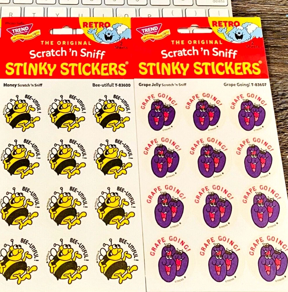 This lot of 2 TREND Scratch n Sniff Stickers is from the Special Edition RETRO Collection ~ Stinky Stickers! Honey ~ 24 Stickers + Grape Jelly ~ 24 Stickers