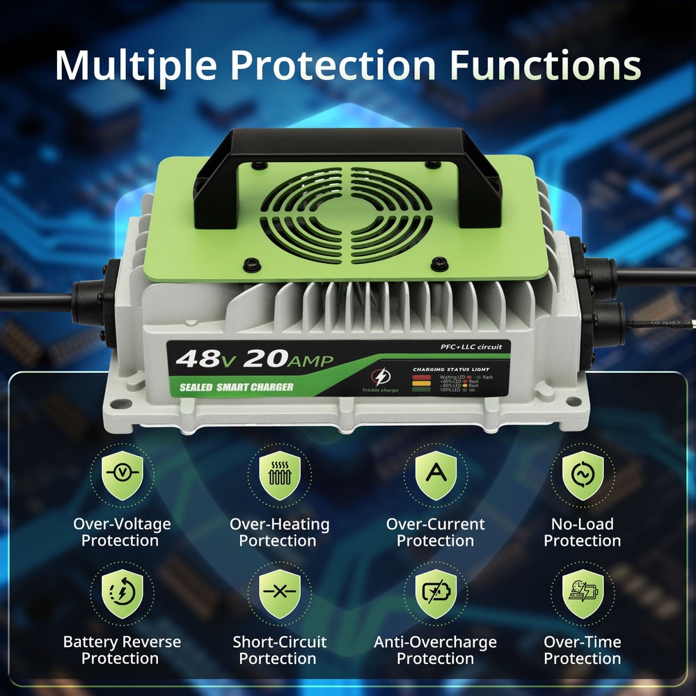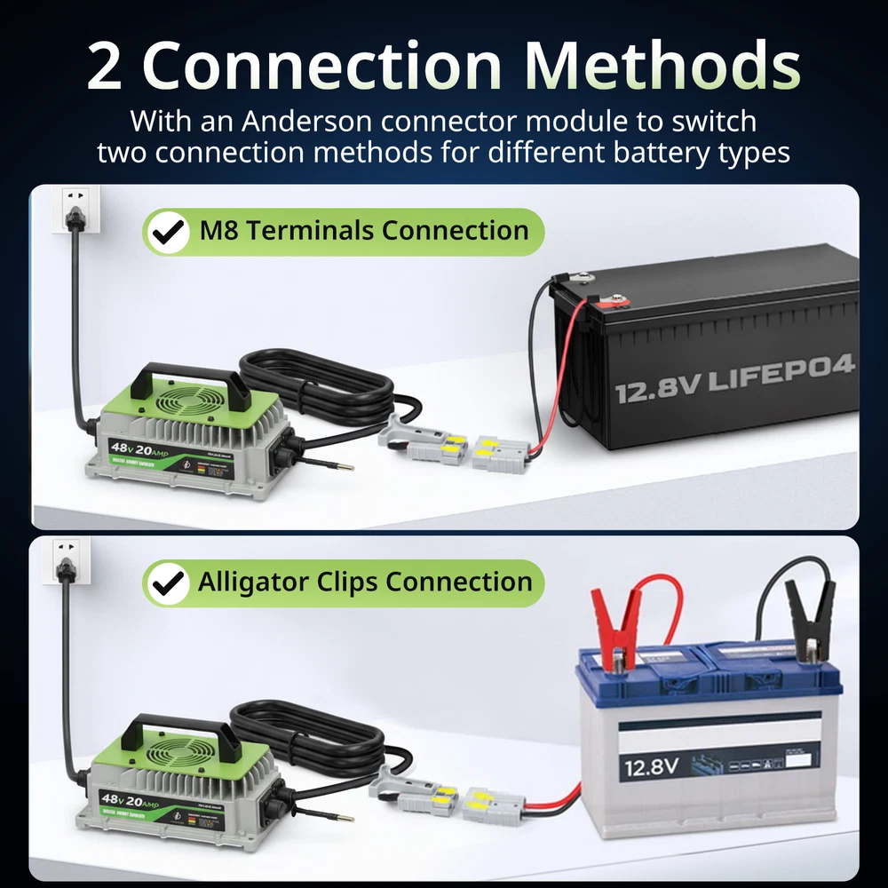 DESCRIPTION PAYMENT SHIPPING RETURN POLICY CONTACT US 48 Volt 20 Amp Lithium Onboard Golf Cart Battery Charger w/ Ring Terminals Plug About this item Multipurpose 48V Battery Charger Equipped with 48V charging voltage and 20A charging current, this charger is specially designed for LiFePO4 batteries. It’s widely applicable for charging batteries in golf carts, RVs, marine vessels, solar energy storage systems, trolling motors and electric forklifts, delivering reliable and fast charging. 2 Connection Methods This LiFePO4 battery charger provides two connection options through an Anderson connector module: M8 terminals for permanent installation (just tighten bolts to battery posts) and alligator clips for temporary use on protruding terminals. Note that alligator clips are not recommended for high-current battery applications. Charging Status Indicator The golf cart battery charger comes with a 3-color indicator light, enabling clear monitoring of charging status: Red/Green Flash means Waiting Mode; Red Flash indicates Low Charging (<80%); Yellow Flash stands for Normal Charging (>80%); Solid Green shows Fully Charged (100%). Once the battery is fully charged, the charger automatically shuts down to avoid overcharging and effectively extend battery lifespan. Multiple Protection Functions The 48V LiFePO4 battery charger boasts multiple protection functions, such as output over-voltage cutoff, over-current/short-circuit protection, reverse connection protection and input under-voltage shutdown protection. It also has a dual-temperature monitoring system: an external NTC sensor detects ambient temperature, while internal circuitry monitors component overheating to prevent thermal runaway and ensure higher operational safety. Excellent Heat Dissipation The 48V battery charger adopts an aluminum alloy enclosure for passive heat dissipation, along with an active cooling fan and optimized air ducts. This combination greatly improves cooling efficiency, ensuring the charger operates stably and prolonging its service life. Specifications: Input Voltage: 100-240V Compatible Battery Type: LiFePO4 Output Mode: Empty Output Battery Voltage: 48V Charging Current: 20A Storage Temperature: -20℃ to 70℃ Working Temperature: -10℃ to 45℃ Package List: 1 x Battery Charger with Power Cable 1 x Connection Cable with M8 Terminals 1 x Connection Cable with Alligator Clips 1 x Users Manual Item Specifics Brand : BIGRIG Warranty : 1 Year Compatible Make : Club Car E-Z-GO Yamaha Voltage : 48V Compatible Model : 48V Golf Carts with LFP LiFePO4 Batteries Current Output : 20A Compatible Battery Type : LiFePO4 Payment Shipping Returns Contact Us PayPal preferred. Payments are expected within 7 days after the last winning auction is closed; Otherwise Unpaid Item Dispute will be filed with eBay. Product will beshipped within 2 business days after full payment is received and verified. Delivery Time is about 3-7 business day s to most of countries. All domestic orders will be shipped via USPS, UPS or FedEx from our US warehouse and usually arrives to your door in about 3-5 business days. We ship the package to your shipping address in eBay instead of the one in PayPal. Please tell us your shipping address if it is different from the one in eBay. The tracking number will be given for the customer to check the shipping status online (registered or faster service only). We are not responsible for any wrong or undeliverable addresses. Please verify and update your shipping address on eBay during checkout. We stand behind every product we sell. All of our brand new items come with a 30-Days money-back guarantee. We define the item as defective only if it doesn't function as described. It is the buyer's responsibility to understand the item description before bidding. We will replace the defective items, provided that they are in stock within the warranty period posted with the listing and the buyer return the original item and pay for the S&H cost for the replacement. We will refund the purchase price if the replacement is not available or buyer prefers a refund and send the original item back at his/her own cost. Shipping & handling cost are not refundable. Man-made damage by abuse or wrong operation is not covered by this warranty. No product liability insurance is assumed. We strive to source genuine products from the suppliers. However, if you feel any of our products violate your Trademark, Patent Right or any other Intellectual Property Rights, please contact us. We will remove any offending listing immediately while awaiting further discussion. All rights reserved. On Nov 5, 2025 at 00:52:38 PST, seller added the following information: