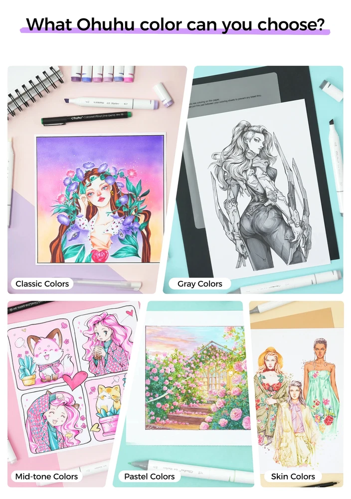 Main Featrues 【Honolulu Series】BRUSH & CHISEL , DOUBLE-TIP, DOUBLE THE FUN Widen your artistic horizons with the dual-tip marker design! Choose the brush tip for sweeping, calligraphic strokes or quickly color in large areas with the wide chisel tip. What's more, now Ohuhu replacement brush tips is available, so you can easily replace the worn-out tips to ensure consistent and precise lines whenever you create. The only limit is your imagination 【Honolulu B Series】BRUSH & FINE , DOUBLE-TIP, DOUBLE THE FUN Widen your artistic horizons with the dual-tip marker design! Choose the brush tip for sweeping, calligraphic strokes or the fine tip for details. What's more, now Ohuhu replacement brush tips is available, so you can easily replace the worn-out tips to ensure consistent and precise lines whenever you create. The only limit is your imagination REFILLABLE INK FOR A LIFETIME OF CREATIVITY With 51 Ohuhu popular colors available for refills now and more on the way, your creativity knows no bounds. Enjoy a wide range of hues and keep your markers going for years to come. Whether you're exploring the rich colors of Honolulu, Oahu, the Kaala, or the bold hues of Molokai Series, they are refillable now. Switch between sets seamlessly and unlock endless artistic possibilities SEAMLESSLY BLENDING Say goodbye to unsightly splotches and uneven coloring. Our high-quality ink seamlessly blends to create beautiful, professional-grade artwork, perfect for both beginners and experienced artists; Also, no more frustrating smudges or wet ink ruining your work. Our alcohol-based ink dries quickly, ensuring that your art is always clean, crisp, smudge-free, and ready to display 48 VIBRANT COLORS + 1 COLORLESS BLENDER The rainbow is at your fingertips - choose from 48 brilliant colors and bring your ideas to life. The color spectrum is yours to explore with 48 brilliant shades to choose from, plus a colorless blender for better blending effects. From coloring books to professional masterpieces, our brush markers will breathe life into your artwork EASY IDENTIFICATION, ORGANIZATION & PORTABILITY Don't waste time searching for the perfect color. Our markers come with color-coded caps to keep you organized and efficient. Plus, the free carrying case makes these markers perfect for any coloring adventure or as a thoughtful gift for any artist Product Description