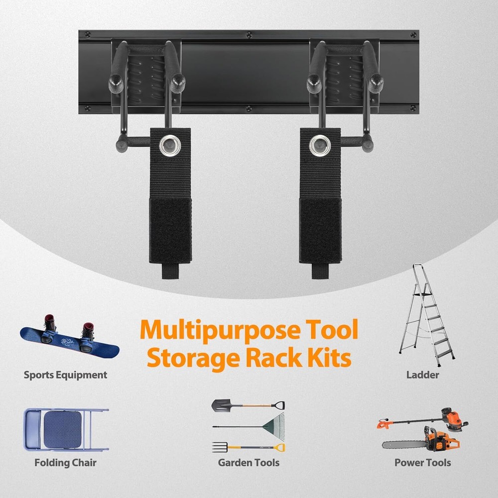 Product Description Garage Tool Organizer Wall Mount, 48 Inch Adjustable Garage Tool Storage Rack, Heavy Duty Garden Tool Organizer Rack, Yard Tool Organizer System for Rake Shovel Broom Mop Wall Holder MULTI-FUNCTION GARAGE TOOL ORGANIZER: This versatile wall mount tool hanger set offers the ultimate solution for your wall storage needs. Perfect for organizing a variety of items including garden tools, brooms, hoses, yard tools, pole cutters, hockey sticks, ski gear, and more. Keep all your gear neatly arranged, tidy, and easily accessible with this efficient system. HEAVY DUTY WALL STORAGE SYSTEM: Our garden tool storage rack boasts heavy-duty construction, crafted from solid steel with a durable powder-coated finish to prevent rust and ensure a lifetime of use. Each double UP-DOWM hook is rubber-coated, providing added protection against slippage and damage to your valuable tools. EASY TO RELOCATER & ADJUSTABLE: The garage wall organizer has 3 Steel wall racks (16 inch), 6 Double UP-DOWM Hooks (10 inch) which are equivalent to 12 double hooks (6 long hooks and 6 short hooks). These hooks can be effortlessly repositioned anywhere along the tracks of the panel to accommodate changing storage needs. Allowing you to customize your storage setup with ease. ADDITIONAL 4 PCS STORAGE STRAPS: The Garage Storage system comes with 4 pcs of 13inch storage straps, perfect for neatly looping and securing cables, hoses, cords, and ropes. By keeping these items wrapped tight and stored up, these additional straps further contribute to transforming your garage into a beautifully organized space, bringing you a sense of bliss and order. SPACE SAVING UTILITY RACKS: The garage storage racks can be mounted to virtually any solid surface, indoors and outdoors. It is easy to hang all your tools on it to declutter the corner of your garage, and keep the garage well-organized. If you are not satisfied with the wall mount tool organizer, just send an email to us and we will offer a 100% no question asked REFUND or REPLACEMENT. About Us We are a reputable seller with many years of experience selling on eBay. Our goal is to provide high-quality products and excellent customer service. Shipping Items will be shipped within 1-3 business days when we received payment. (Orders are not processed on weekends & holidays) Tracking information will be sent once item is shipped. Delivery time depends on destination and other factors Item is shipped to ebay address. Leaving correct address can minimize delay. For international shipping and shipping to Guam, Hawaii and Alaska, Please contact us before placing the order. International buyers please note: Import duties, taxes and charges are not included in the item price or shipping charges. These charges are buyer’s responsibility. We will try our best to reduce the risk of the custom duties. Local pick-up is unavailable at the moment. Contact Us We reply any email messages within 1 business / working days(off-duty at weekend). If you do not get a response from us, then please check your junk or spam mailbox. Our Business hours: Mon-Fri 9:00-18:00, UTC/GMT +8 hours. Please contact us either by clicking "contact seller" in the "purchase history" section or simply click "ask a question" at the bottom of this page. If you are unsatisfied with our item or service, please contact us before leaving any feedback. We are committed to resolve all issues in a friendly and satisfactory manner.