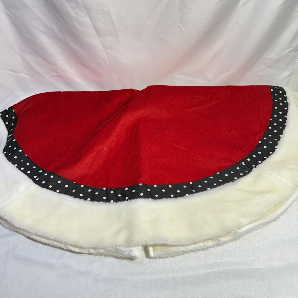 Add a fun and festive touch to your Christmas tree with this 48" red, white, and black polka dot tree skirt. Made from a combination of cotton and faux fur, this large round tree skirt features cute bow ties and a playful polka dot pattern. Perfect for any Christmas occasion, this tree skirt will add a touch of whimsy to your holiday decor. Never used