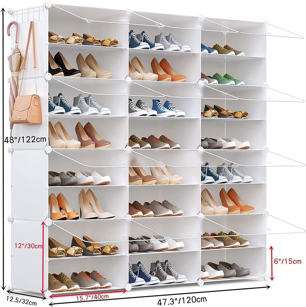 We provide sufficient accessories. Please check the number of accessories according to the instructions before installation. If there is any missing, we will provide a solution within 24 hours. You can assemble it according to your needs. Accessories may be redundant or missing due to different assembly methods, because we provide the number of accessories for 3 columns and 8 layers. If you assemble an 8-layer shoe cabinet, you can assemble 3 connected columns, which is just right. 【48 Pair Large Shoe Rack】Size: 48"(W) x 12.5"(D) x 48"(H). Our shoe rack provides a large space to store shoes, which can hold 48 pairs of shoes. It can store all kinds of high-heeled shoes, high-top shoes, sports shoes, sports shoes, boots, enough to meet the daily needs of you and your family,make your home neat and uncluttered 【Dustproof & Prevent Pets from Chewing Shoes】All shoes can be enclosed by shoe rack, which can effectively prevent dust and easy to clean. And comes with an easy-to-open transparent door that lets you find your shoes quickly and prevents pets from chewing on your shoes.The perforated door facilitates air circulation and prevents the accumulation of peculiar smells 【Expandable Shoe Rack for Closet】 You can customize the design according to your needs, put the shoe rack in the closet, store shoes, hats, clothes, toys, etc.Keeps your everyday storage handy yet organized 【Sturdy Structure】The shoe rack is made of metal frame and environmentally friendly, harmless and durable PP material, waterproof and easy to clean. Maximum load capacity of each cube: 11lbs 【Suitable for all space】The shoe rack is strong enough, spacious, compact, and can be placed in Closet, living room, doorway, bedroom, office. Equipped with installation instructions and installation tools to help you install quickly and easily.The content: 16* 12x12inch side panels + 12*12x16inch frosted doors + 39*12*16inch cross panels + 40 connectors + 32 cross panel clips + 1 five-claw hook + 1 hammer We provide sufficient accessories. Please check the number of accessories according to the instructions before installation. If there is any missing, we will provide a solution within 24 hours. You can assemble it according to your needs. Accessories may be redundant or missing due to different assembly methods, because we provide the number of accessories for 3 columns and 8 layers. If you assemble an 8-layer shoe cabinet, you can assemble 3 connected columns, which is just right.