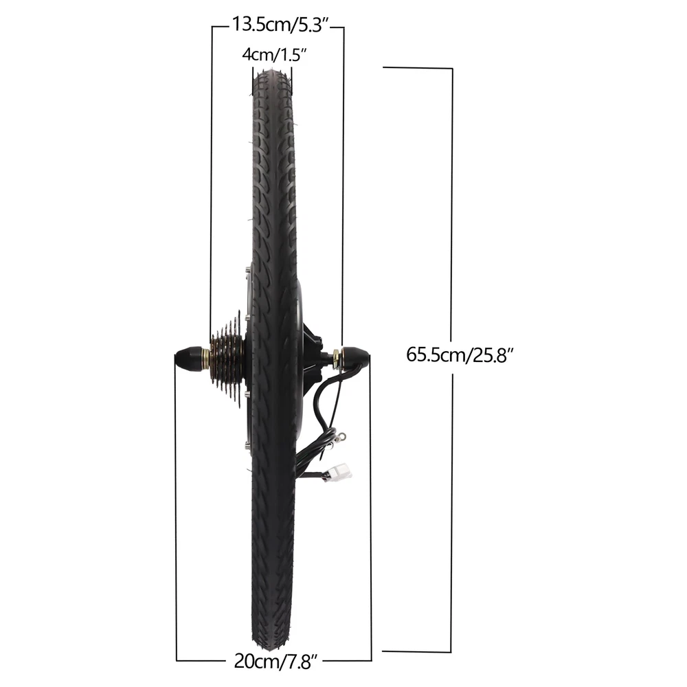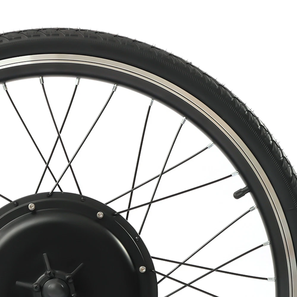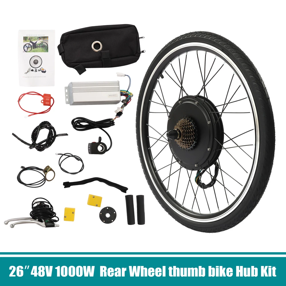 48V 1000W 26" E Bike Conversion Kit Electric Bicycle Rear Wheel Hub Motor +Light Description Ride a beautiful bike, shuttle on the road with flowers on both sides, and experience the joy of life with passion and speed. Our electric bicycle motor conversion kit can help you do this. It is made of a variety of high-quality materials, which has laid a solid foundation for your long-term use. Brushless and toothless motor has high efficiency and can provide strong power. A speed of 56km/h can make you a wind chaser. With it, you will experience a different ride. Key Features Premium Material: This product is made of aluminum, iron, copper, magnetic steel, aluminum alloy, and rubber butyl. All of these materials have good performances, making the kit durable, and not easy to rust. Therefore, you can use it for a long time without frequent replacement, which can save your use cost to a certain extent. Exquisite Craftsmanship: The kit adopts the process of baking varnish and plastic powder, which makes it has good toughness, corrosion-resistant , and wear-resistant , and also makes the color brighter. Budget-friendly Design: The package of this kit includes all the items required, such as controller bags and auxiliary sensor, so you don’t need to buy them separately, which saves your costs and provides you with more convenience. Brushless and Toothless Motor: Our kit uses an upgraded 1000W brushless and toothless motor with an efficiency of more than 80%, which runs smoother with low noise than a brushed motor thus providing stable power to the bike. And brushless motors do not need to replace brushes, making maintenance easier. High Efficiency: The rotating speed of the motor is 440rpm, and the torque is 45N M. At the same time, its speed can achieve 53km/h, which can provide you with a better riding experience. In addition, it uses thickened round spokes to improve the wind-breaking ability without stepping in the air. Safe and Reliable: This conversion kit is equipped with a powerful controller, which is conducive to ensuring the smooth operation of other parts, making your entire process safer and easier. Besides, it is equipped with a power-off brake handle, which can cut off the power of the motor in case of emergency braking so that the bike can stop in time and reduce potential safety hazards. Enjoy Riding: With this high-performance and cost-effective conversion kit, you can convert ordinary bicycles into electric bicycles, enjoy riding more confidently and happily, and have a better mood. Strong Bearing Capacity: The electric bicycle motor conversion kit is equipped with 36 spokes, and the staggering weaving design makes the stress point uniform and firm, so it can bear a weight of about 120kg/264.55lbs, which is suitable for most people. Adjustable Speed: The product is equipped with a thumb throttle, through which you can increase or decrease the speed, which provides more convenience for your cycling. Convenient Installation: A detailed installation manual is concluded in the package, so you only need to follow the manual steps, which saves you energy. Ideal Gift: With powerful functions and a beautiful appearance, you can give this conversion kit to your friends or family who love riding. Worry-free Service: We have been working hard to provide better service and quality for our customers, which is our goal. If there is any quality problem with our conversion kits. Please contact us in time. Details Auxiliary Sensor: The pedal of this kit is equipped with an auxiliary sensor, which can transmit your stepping frequency and force to the controller, and then adjust the motor speed accordingly. Controller Bag: This conversion kit is equipped with a black controller bag made of oxford cloth, which is waterproof , soft, and wear-resistant . It is not only beautiful but also can be used to store the controller and keep it clean. Texture: There are many textures on the wheel surface, which can increase friction, prevent skidding, and ensure your riding is more stable, smooth, and safe. Rims: Rims of this group of electric wheels are made of high-quality aluminum magnesium alloy, which has waterproof and anti-corrosion properties. High-quality rims are more durable and extend the service life of the product. LED Light: The thumb throttle is equipped with three LED lights. The bright lights can illuminate the road for you at night and bring you a sense of security. Application This conversion kit is suitable for cyclists to convert ordinary bicycles into electric bicycles and it fits 26inch bikes. Specifications Color: Black Material: Aluminum, Iron, Copper, Magnetic Steel, Aluminum Alloy, Rubber Butyl, Aluminum Magnesium Alloy, Oxford Cloth Surface Treatment: Baking Varnish, Plastic Powder Bike Type: Electric Bike Suspension Type: Rear Voltage: 48V Power: 1000W Rotational Speed: 440rpm Torque: 45N.M Light: 3 LED Efficiency of Motor: >80% Speed: 53km/h Loading Capacity: 120kg/264.55lbs Battery Type: 48v17-20ah Lithium Batteries or Lead-acid Batteries(Not Included) Specific Uses For Product: Road Suitable Wheel Size: 26inch Wheel Diameter: 65.5cm/25.8inch Length of Motor Shaft: 20cm/7.8inch Rear Fork Distance: 13.5cm/5.3inch Thickness: 4cm/1.5inch Net Weight: 10.4kg/22.93lbs Gross Weight: 12.2kg/26.9lbs Package Size: 66*66*23cm/25.98*25.98*9.06inch Package Included 1* Motor Wheel 1* Flywheel 1* Pedal Assistant Sensor 1* Controller Bag 1* English Manual All Accessories for Assembly Notes Please read the user manual carefully before use and pay special attention to the safety precautions included. Please note that our kit does not contain batteries. We recommend that you use 48v17-20ah lithium batteries or lead-acid batteries. While connecting the controller to the wires, please make sure that you connect the right colors to the controller. Otherwise, the controller may be broken. Please note that the product is not waterproof, so please do not ride in rainy days. Please allow the slight col