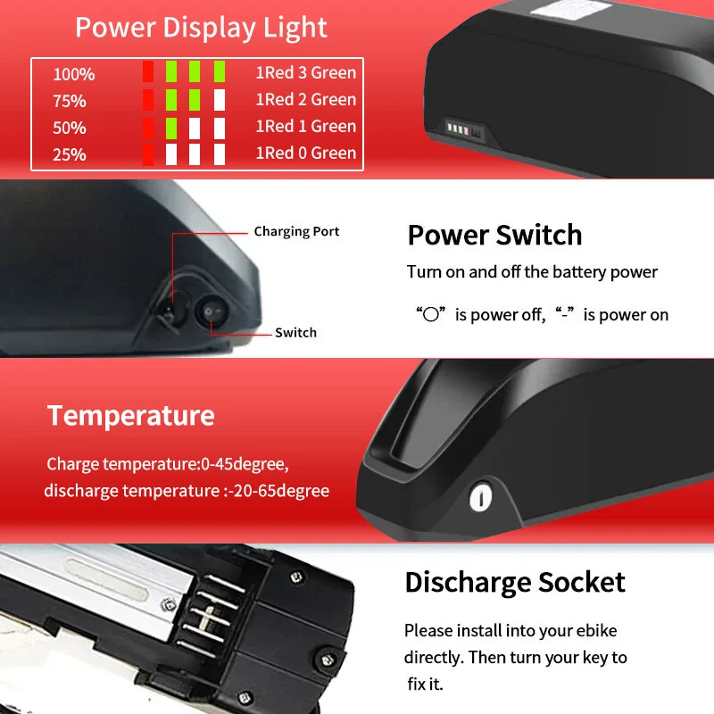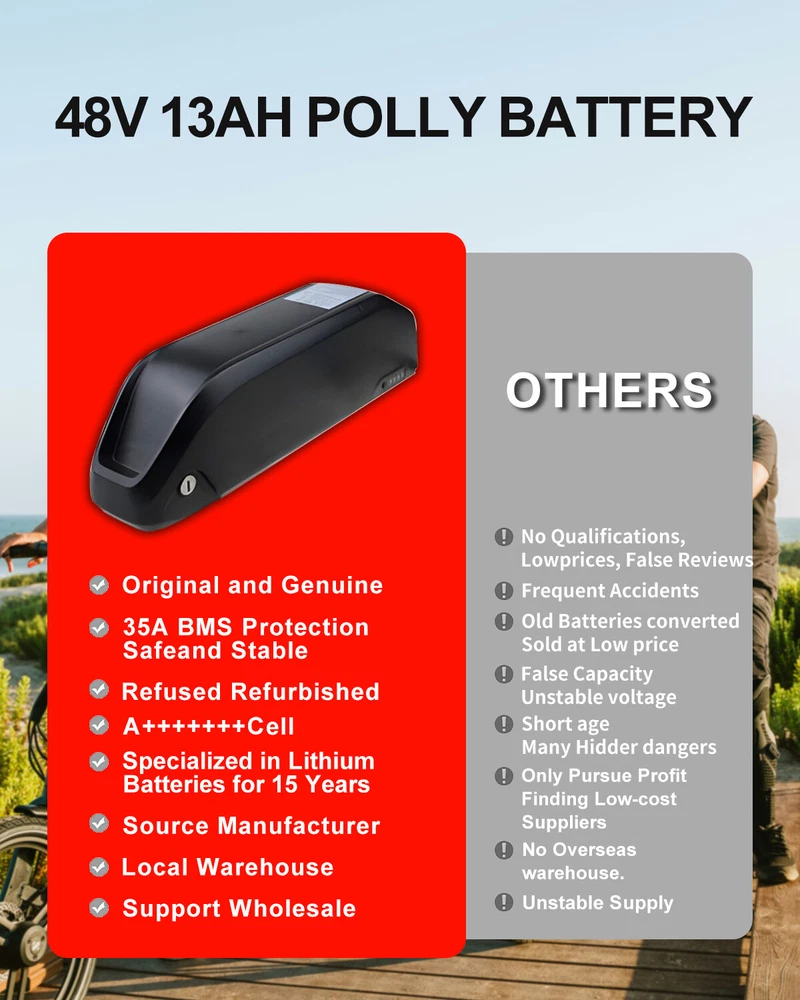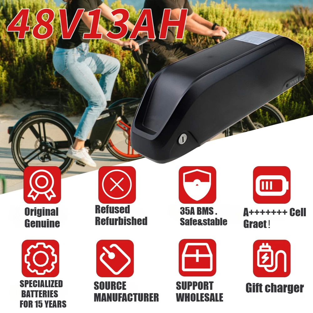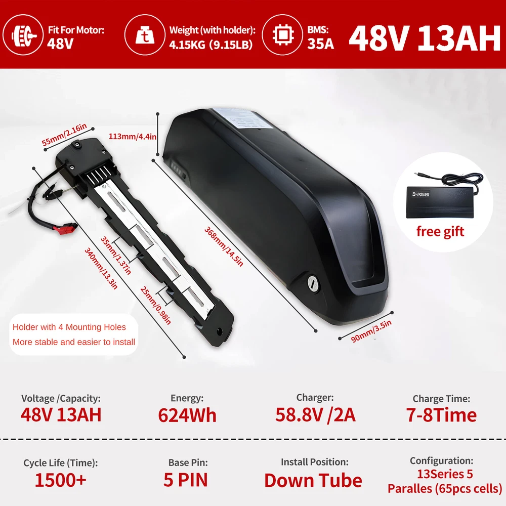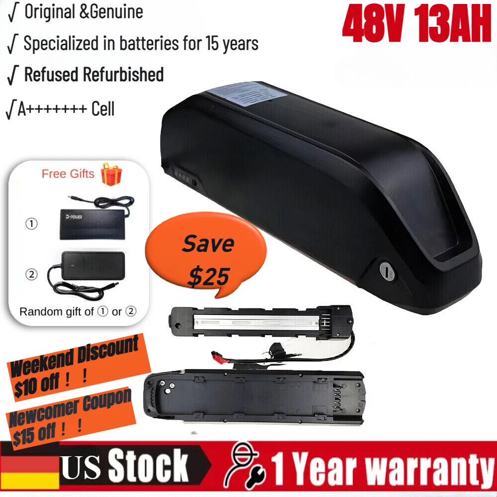 🔋 48V 13Ah with 35A BMS Lithium Ebike Battery Purchase Note: Please confirm the motor and voltage of your ebike before the purchase and check whether the size of the battery can be placed in your bike's frame,and finally choose the battery that fits for your bike. C har ging note : Please connect the charger to the power supply first, and then connect the charger to the battery Features 【 Fit ebi ke 】 : For 48V 200W /250W/300W/350W/400W/480W/500W/750W/800W/900W/1000W/1200W/1500W ebike 【High energy density】Our Ebike lithium batteries have high energy density, which means they are capable of storing large amounts of electrical energy in a relatively small size and weight. Therefore, it can travel longer distances on a single charge, improving driving efficiency and convenience. 【Design Features】The LED power indicator on the body can remind you to charge on time. And equipped with a safety lock to prevent theft. ▶ 35A BMS: Built in BMS with short circuit , over-current , over-heat , over-charge , over-discharge protection. ▶ Long life 1500+ cycles,Quality Grade A+++++ cell, Riding time longer than ordinary batteries. ▶ Waterproof case:Reduces the possibility of damaging the internal battery. ▶ With battery base, easy to install. The discharge connector is Anderson plug ▶ 【Warranty Service】If the electric bicycle battery is damaged within one year or other problems. Please do not hesitate to contact us, we will give you satisfactory results. specifiction Vo ltage:48V Battery Cap acity: 13Ah Energy: 624Wh Configuration: 13 Series 5Paralles Item Size: 368mm*9 0mm*113mm Battery Cells: Impo rte d cel ls & Chinese 3C A+++++ cells Protection Function: Over c harge , Over discharge,Over current, Short circuit, Balance Standard charge Curre nt : 2 A Peak Current : 85 A Max Constant Discharge Current:30A Charge Cut-off Voltage: 54.6V Discharge Cut-off Voltage: 36.4V Charger: 54.6V 2A Way of Charge: CC / CV Discharge Connector: An derson Charge Temperature: 0-45℃ Discharge Temperature: -20-65℃ Packing List: 1 * Ebike Battery 1 * Charger (US plug Option) 1 * Motor Battery C onnector (Anderson) Not e s : 1. Please c om pare the voltage and size of your original battery before purchasing, and choose the same voltage as the original battery. 2. Please use the equipped charger for charging, and it is strictly prohibited to use other chargers that do not meet the requirements 3. The mileage cannot be guaranteed 100% due to factors such as vehicle condition, road conditions, personal driving habits, and weight. Therefore, the mileage is not ideal and is not within the quality range. Purchasing indicates acceptance of this clause. 4. Please do not disassemble the battery without authorization. Disassembling it does not provide warranty, and returns are refused 5. The battery is waterproof, but do not place it in water. 6. If not in use for a long time, please turn off the power and charge regularly (it is recommended to charge once every 20 days). If the battery cannot be used due to long-term non charging, the seller will not be responsible for any responsibility 2. Re turn policy: 1.If there is a quality issue with the battery, please send an email to customer service. Due to the time difference between China and Germany, we will reply within 12 hours. 2. Batteries are special items, please do not initiate return requests without authorization. 3. If you are in a hurry to return the item, please choose "Doesn ’ t fit" or "didn ’ t like it “ as a reason for return" to wait for the system to automatically process it 3. Leaving negative reviews without authorization will remove warranty benefits. 3. Shippi ng Policy: 1. All orders will be shipped within 24-48 hours, please ensure your address is correct 2. If the local warehouse is out of stock, I will ship from the other warehouse to you 4. The battery is not eligible for return due to water ingress or damage caused by human factors. We apologize for any inconvenience caused. 4. Ite ms not received: Please do not initiate disputes that have not been received. The workflow of Chinese customer service is to prioritize email messages. Please send an email first, and customer service will reply within 12 hours at the latest 48V 13Ah Battery for 48V 200W-1920W Ebike Electric Bike Lithium Battery BMS 48V 13Ah 48V 750W 48V 500W 48V 1000WElectric Bike Battery Ebike Battery w/Charger Lockable 48V 1000W 48V 750W 48V 500W Ebike Battery ≤1000W Electric Bike Motor Lithium Battery BMS 52V 48V 36V 10Ah 15Ah 20Ah Electric Bicycle Ebike Lithium Battery Rechargeable 52V 48V 36V Ebike Battery Hailong Lithium Battery Pack 1000W 1500W Motor BAFANG 48V 15Ah Hailong Ebike Battery 200W-1500W Electric Bike Motor Lithium Battery US Samsung ebike Lithium battery 60V 52V 48V 24Ah 13Ah for 0~2000W Electric Bicycle 52V 48V 36V Ebike Battery Hailong Lithium Battery Pack 1000W 1500W Motor BAFANG 52V 48V 36V Hailong Ebike Battery 200W-1500W Electric Bike Motor Lithium Battery Samsung ebike Lithium battery 60V 52V 48V 24Ah 13Ah for 0~2000W Electric Bicycle ebike battery ebike battery 48v 1000w 20ah ebike battery 48v ebike battery 52v ebike battery 52v battery 52v 20ah ebike battery 52v 20ah battery 52v 20ah 48v+13ah+20ah+lithium+li-ion+battery+for+750w+1000w+ebike+electric+bicycles 48v lithium battery 48v ebike label 48v ebike battery 48v battery 48v 13ah ebike battery 48 volt lithium battery