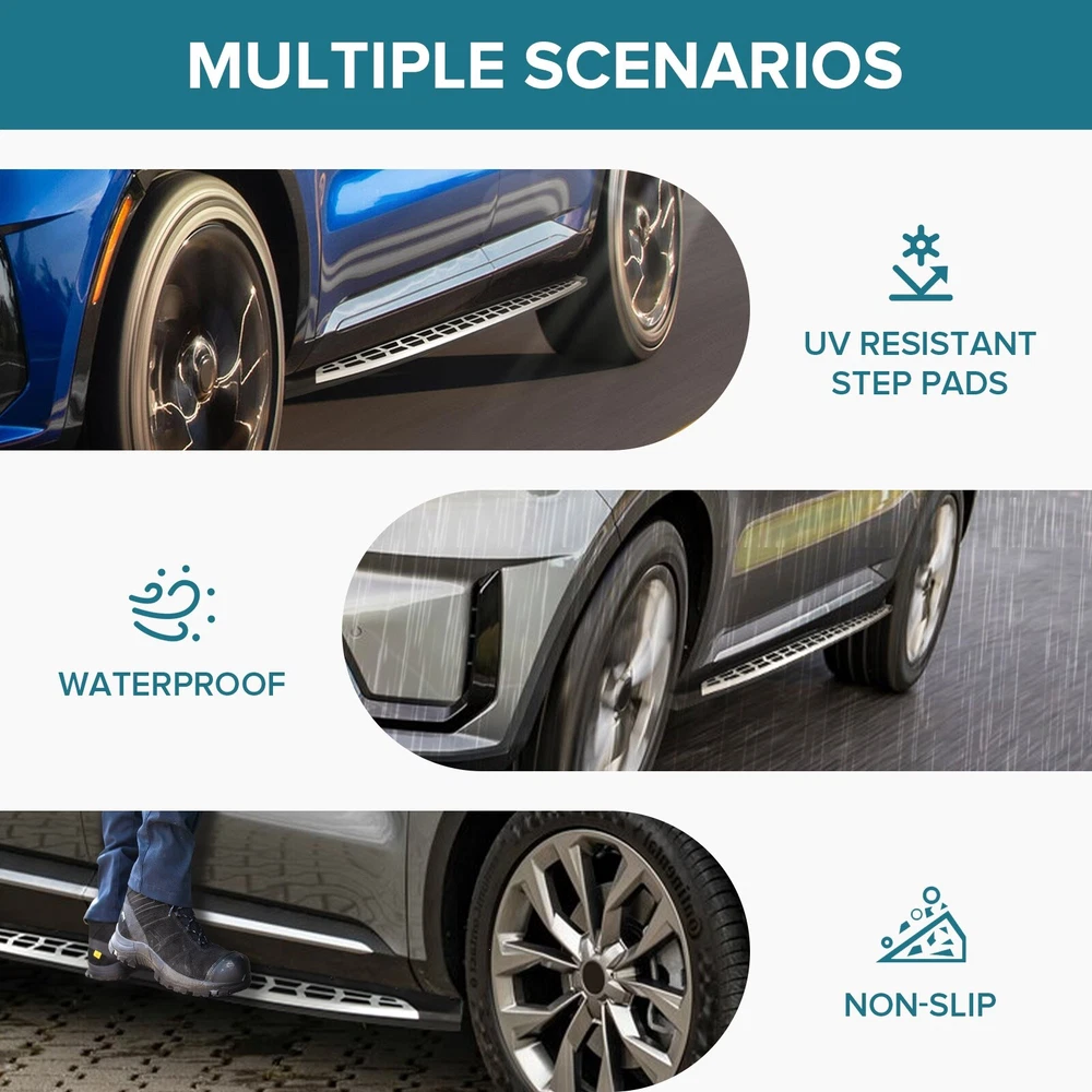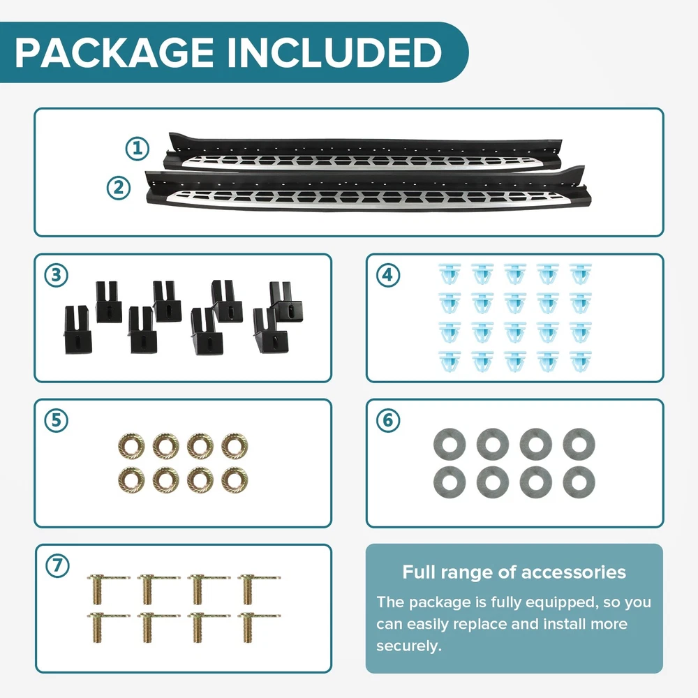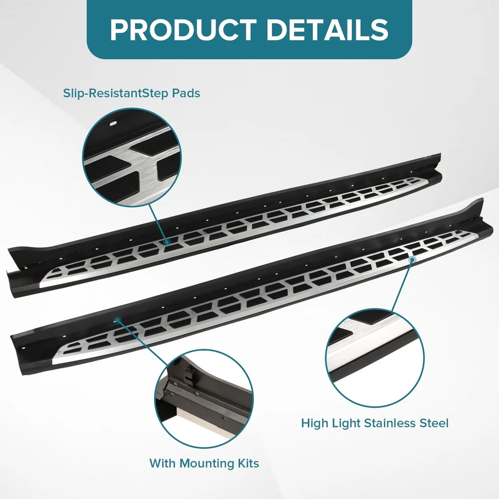 Specification Color: Black+silver Type: Step Nerf Bar Placement on Vehicle: Left, Right Fitment Type: Performance/Custom Material: Stainless Steel,ABS Shape: Rectangular Mounting Hardware Included: YES Package Size: 77.95*12.01*8.27 Package Weight: 28.66 Fitment 2021-2024 Kia Sorento Features & Benefits 1. High-Grade Construction: These running boards, also known as Side Steps, are made from high-grade Stainless Steel. This makes them lightweight yet extremely durable, perfect for long-term use. 2. Weather Resistant: Built tough, these running boards are highly resistant to corrosion. They perform well in all weather conditions, making them a reliable addition to your vehicle. 3. Easy Assembly and Removal: These running boards are designed for easy assembly and removal. This means you can easily install them when needed and remove them when not in use. 4. OEM Replacement with Quality Guarantee: These running boards serve as the perfect OEM replacement. They come with a quality guarantee, ensuring that you get the best value for your money. 5. Enhances Vehicle's Exterior: Apart from their functional benefits, these running boards also provide a great upgrade for your vehicle's exterior look. Please ensure to check the compatibility of these running boards with your vehicle before ordering. Feel free to contact us if you have any questions. On Nov 19, 2024 at 02:02:29 PST, seller added the following information: On Nov 22, 2024 at 02:46:24 PST, seller added the following information: