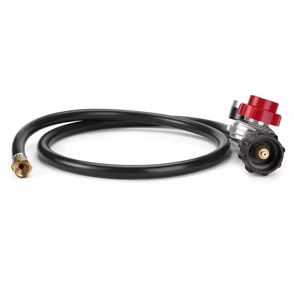 This Regulator Hose 0-30 PSI adjustable output is must have item for your propane burners, turkey fryers, heaters, smokers and all other propane appliances, Easy to use and good for secure gas flow, No gas leak, Simply connect and go, Extremely reliable. Output pressure 0~30 PSIG adjustable regulator .Hose measures 4 Feet long.Measuring from 0- 60 psi (as well as 1-4 100xKPA), the Pressure Gauge lets users control their heat with a precise level of accuracy. Easy and quick to install. Type 1(QCC 1) tank end connector & 5/8"-18 UNF outlet connection (3/8 inch female flare fitting has an outside diameter of 5/8 inch). 3/8" female flare fitting, fit for gas grills, gas stoves, turkey fryers, burners, smokers, cooker, fire pit, hot water heater, as long as your appliance connection is 3/8" male flare connector. 3/8" Female Flare Fitting has an outside diameter of 5/8", come with pipe fitting 3/8" flare M x 1/8" MNPT. Specifications: Material: PVC + Cuprum Length:approx. 123cm/ 4Feet Inlet Pressre: 25~250 PSIG Outlet Pressure: 0~30 PSIG adjutable Gauge reading: 0~60 PSI (1- 400 x kpa ) Adjustable Range: 0~30PSI Inlet connection: 3/8" Flare Fitting Male QCC(ACME) Outlet Connection: 5/8"-18 UNF Female flare swivel fitting (3/8" SAE) Max. flow capacity: 130,000 BTU/hr. Works with QCC1/ Type 1 propane tank. Note: For safety, please adjust it to 0 PSI (shut off the regulator.) Please do not apply this regulator to an appliance which supposed to equipped with a LOW PRESSURE regulator. What's included: 1 x Propane Regulator 1 x Adapter(3/8" flare M x 1/8" MNPT)
