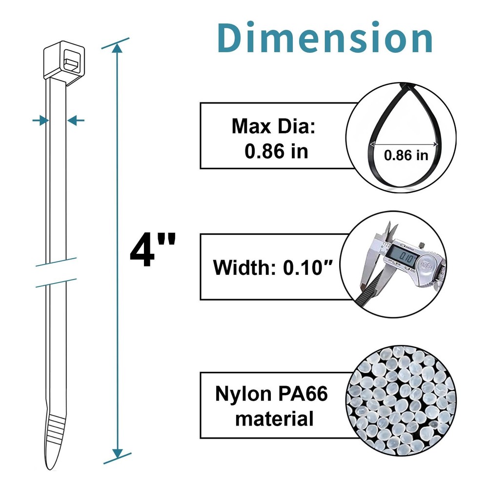 Black Zip Ties 4 inch 2000 Pack Co.,Ltd is a professional manufacturer of nylon cable ties. We will continue to improve the product quality, provide top grade products and the best service for our customer. Make your best choice, zip ties! High Quality black zip ties are made of UV resistant halogen free nylon. Operation temperature is -40℉to 185℉with UL94V-2 flammability. Higher Tensile Strength The tensile strength of our zip ties is 18 lb, higher than others. Our zip ties’width is 0.1 inch, wider than industry standards. You can use our wire ties with confidence without worrying they will break. Self-locking Design zip ties can be easily locked in, tightly and securely. One-piece construction for consistent performance and reliability. Multi-purpose Applications plastic ties can be used to tie cords and cables for electronics. 4 inch zip ties can be used to organize electrical wires and PC or laptop cords. You can use them to repair garden fences, hang LED lights, etc. : zip tie have a 1-year period. Our customer will receive a 100% if any quality issues under period. Tips: 1. Please keep out of reach of the children. 2. Please keep it sealed for long-term use. 3. Please use zipties in proper temperatures. 4. Please use ziptie in proper tensile strength. Package Includes: 4 inch Zip Ties Black 2000 Pack. 2000 Pack: Each package contains 2000 zip ties , you don't have to worry about running out of in the middle of your project Dimensions: Length: 4" | Width : 0.1" | Max Dia: 0.86" |Tensile Strength:18 lb | Color: Black | Quantity: 2000 Pack High Quality: tie wraps 4 inch are made of nylon, so in snow and direct sunlight is not a problem Ideal For: plastic ties are suitable for office, server rooms, home, garden, and packaging : Customer will receive a if any quality issue under the