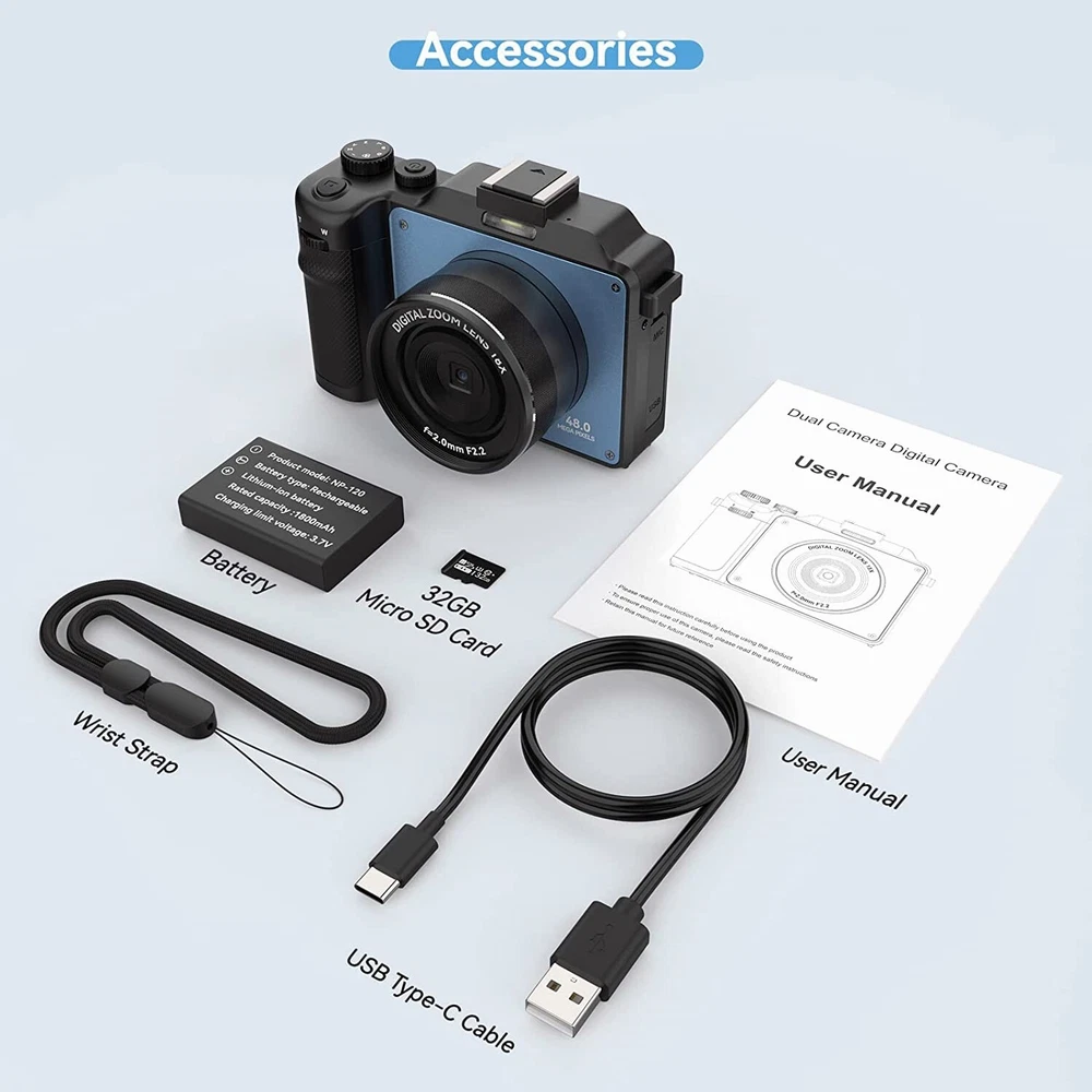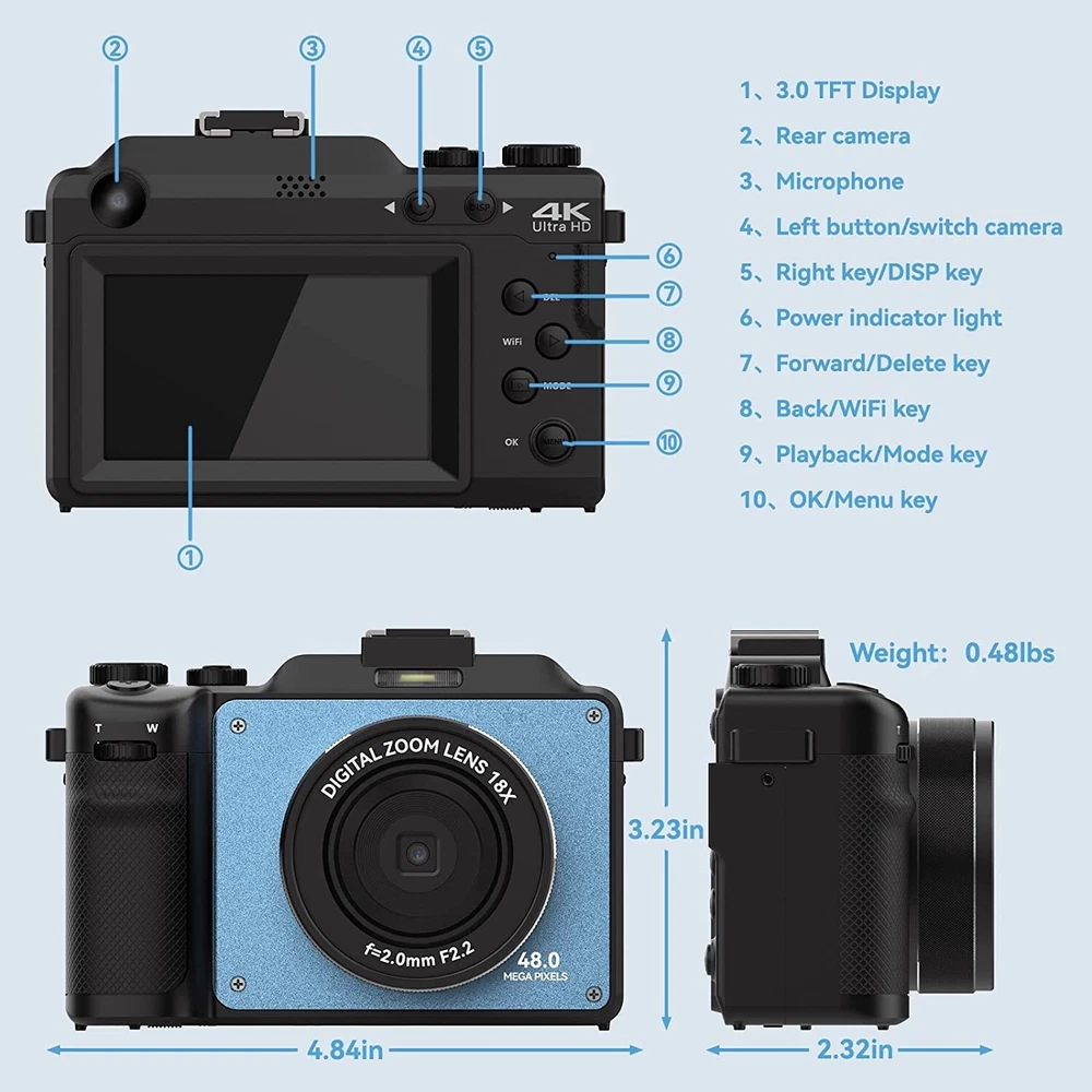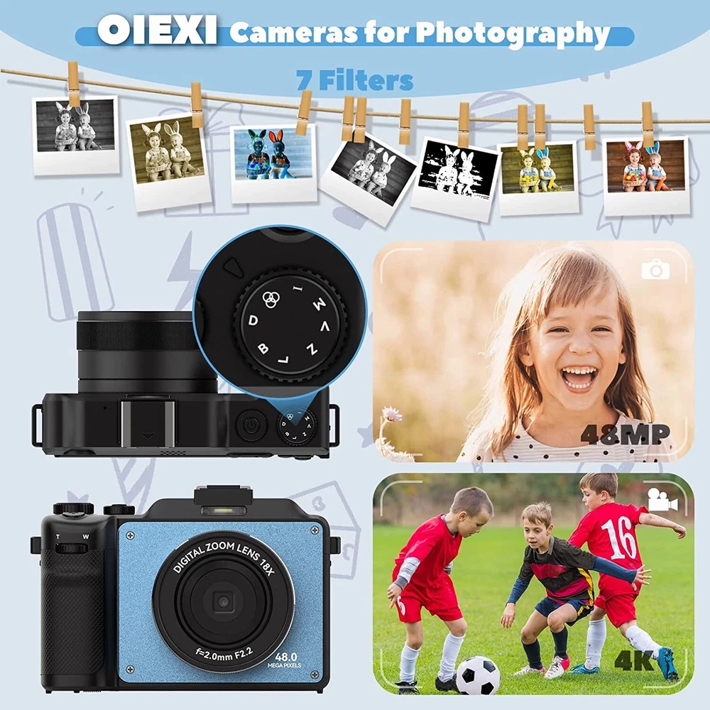 About this item Dual cameras: This cameras for photography with the newest unique design, dual cameras. Switch the front and back cameras at any time, as convenient as you use your phone. Jiugongge design 4k digital camera : With Jiugongge photography composition design, you can use this setting to help improve the composition of your photos. 8 Camera filters: There are 8 camera filters on this 4k camera for photography, and one button to get more personalized pictures. Long battery life: This vlogging camera for youtube comes with a large-capacity battery, and the working time is about 150 minutes. Real Auto Focus: You don't need to press any buttons when shooting, just wait about 2 seconds, and this 4k vlogging camera will automatically focus on the subject. Wifi Function and Upgraded Mic: This digital camera for teens with wifi function and an upgrade mic. You can not only record the smile, but also the most beautiful sound. No Adapter: Considering that everyone has an adapter for their smartphone and to reduce waste, this package does not include the adapter. Product Description OIEXI's Digital Camera For Photography - Flexible Capture Of The Subject Friendly Tips: Please format the memory card through this camera when using the camera for the first time. (Including 32GB TF card) Due to long time transportation, the digital camera battery will be in a low battery state, please charge before use. Charging is complete, the green light goes out. The battery is installed in the camera can not be turned on, the light will not light. Please be careful to keep the camera away from water or other liquids. This camera is not waterproof. The rear camera is covered with a lens protective film, please remove the protective film when using. Portable And Easy To Operate The digital camera weighs only 0.48 pounds, is compact and lightweight, and can be used with a wrist strap that hangs from your hand and is easy to carry anywhere. Important Parameters Image Sensor: CMOS 13-megapixel sensor, up to 48-megapixe Digital Zoom: 18 x digital zoom Aperture/Focal Length: Fixed lens F/2.2, f=2.0mm Focusing Range: 3.93 inches~infinity Sensitivity: AUTO/ISO100/ISO200/ISO400 Photo Resolution: 48MP(9344*5256), 30MP(7296*4104), 24MP(6528*3672), 20MP(6144*3456), 16MP(5376*3024), 12MP(4608*2592), 8MP(3840*2160), 7MPHD(3648*2048), 5MP(3072*1728), 3MP(2304*1296), 2MPHD(1920*1080) Video/Photo Format: AVI/JPG Video Resolution: 4K(3840*2160), 2.7K(2688*1520), FHD(1920*1080), HD(1280*720) Display screen: 3.0 - inch TFT screen Storage Media: External TF card (up to 128G) Battery: one NP-120/1800 mAh lithium-ion battery can work 170 minutes
