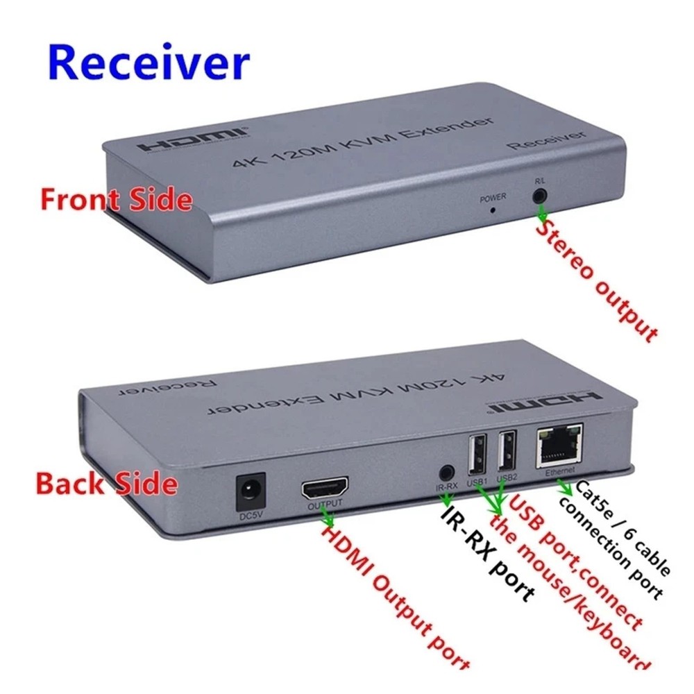 4K 120M HDMI KVM Extender over RJ45 Ethernet Cat5e/6 Cable HDMI USB extender Transmitter Receiver kit Support USB Mouse Keyboard Specifications: Length of CAT5e/CAT6 cable between Rx and TX: 120 meters HDMI Input: 4k 30hz/1080p/720p/576p/576i/480p/480i HDMI Output: 4k 30Hz/1080p/720p/576p/576i/480p/480i Max bandwidth: 340MHz Max baud rate: 3x3.4Gbps Input video signal: 0.5~1.5Volts p-p Output DDC signal: 5Volts p-p (TTL) Input HDMI cable distance: ≤10m AWG26 HDMI standard cable Output HDMI cable distance: ≤10m AWG26 HDMI standard cable TX Max working current: 350mA RX Max working current: 200mA Power Supply: DC5V/1A Operating Temperature range: 0°C to +55℃ Operating Humidity range: 10% to 80%RH (No Condensation) Storage temperature range: -10°C to 70°C Storage temperature range: 5% to 90% RH (No Condensation) Dimension (L x W x H): 163x85x24 (mm) Audio format: Stereo TX Weight: 499g RX Weight: 494g Features: *Support HDMI 1.4/HDCP1.4; *Support local loop-out ; *Support 120m long distance transmission. *Low power consumption, low temperature and high safety; *Both the TX and RX support 3.5MM left and right audio output; *Support IR control; *Support USB mouse and keyboard extension; Package includes: 1x Transmitter 1x Receiver 1x USB cable 1x IR-RX cable 1x IR-TX cable 2x DC 5V/1A selectable Power adapter 1x User manual
