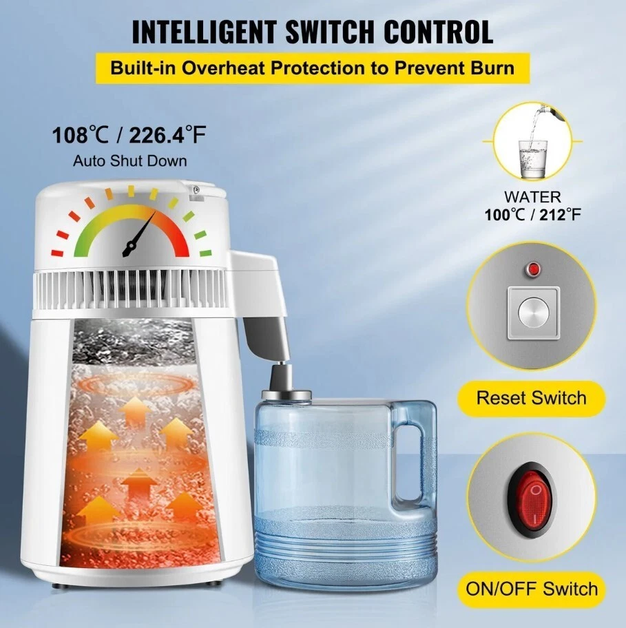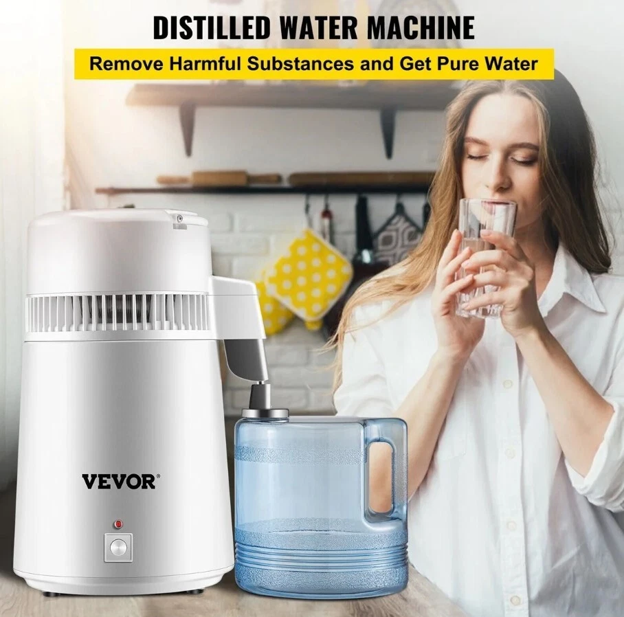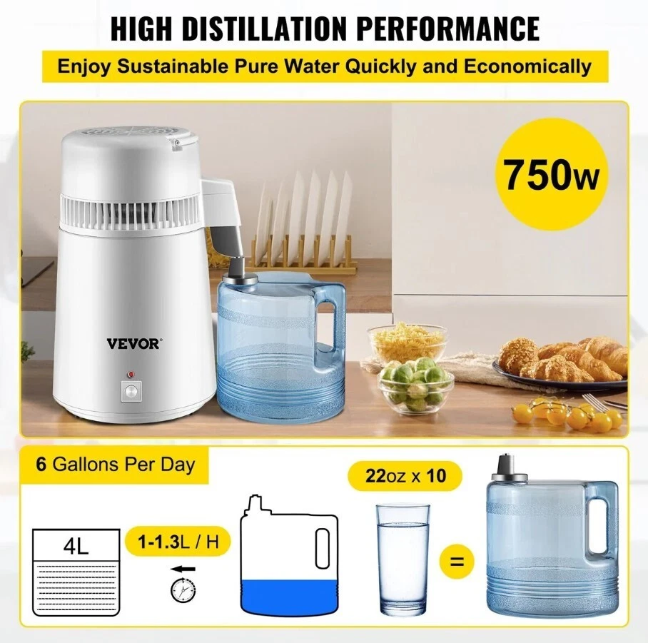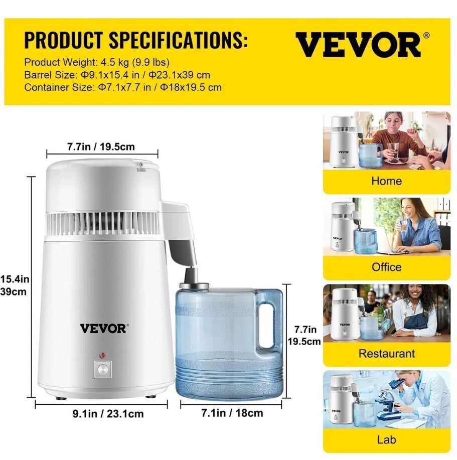 Free eBay listing template designed by dewiso.com VEVOR Pure Water Distiller Purifier Filter 1.1 Gal /4L 750W Fully Upgraded with Handle BPA Free Container Home Use White Specifications for this item Power Input: 110VAC 60Hz Output Power: 750W Inner size: 180x200mm Volume: 4L (1.06 US gal/0.88 UK gal) Distilled Max. Water/per: 1.3 L/H / 0.34 US gal/H / 0.29 UK gal/H Net weight:4Kg Size:290×290×390mm Package size:300×300×500mm Features and further details FOOD-GRADE QUALITY - 100% good-grade material. 304 stainless steel inner tank/Inner cap/Condensing coil/water outlet/water inlet, BPA-free plastic container, and aluminum fan blades. Sanitary and easy cleaning. USER-FRIENDLY OPERATION - Effectively removes contaminants for purest water! The unit will automatically shut off when the temperature reaches 115°C (239°F). A simple button for starting, no need to plug or unplug while controlling. POWERFUL PERFORMANCE - 750W powerful machine with sufficient inner container volume of 4L (1.1 US gal/0.88 UK gal). The heating elements make distillation speed over a quarter gallon per hour, distill up to 6 gallons per day. Equipped with overheat protection and dry burning-resistant protection functions. CONSIDERATE DESIGN - Easy assembly and clean-out, no need to purchase and replace dirty filter cartridges. With a portable handle on the top for easy carry. Both distillers and containers have large openings for easy access and cleaning. HOME & COMMERCIAL US - The water distiller removes most tap water impurities, ideal for distilling water, alcohol and so on. Perfect for labs, hospitals, dental clinics, offices, homes, travel, etc. Fast Heat Dissipation - Unlike plastic fan blades, our countertop water distiller is changed to aluminum fan blades to improve heat dissipation. The exhaust cap is also changed from plastic to 304 stainless steel, improving the heat dissipation capability. User-friendly Details - The upgraded home water distiller machine has a unique portable handle on the top, easy to carry. The water container has a large opening and an ergonomic handle for easy access and cleaning. We also provide free carbon packs and fruit acid cleaners without your additional purchase. Contact us We can be contacted at any time through eBay messages if you have any questions, comments or product requests. We will respond to you within 24 hours and do our best to help you out! We encourage our customers to contact us with any questions or concerns! We'd like to be sure you are completely satisfied with your purchase. Payment We accept Paypal, Master Card etc... Shipping We offer FREE shipping on all orders!Please allow 4-7 business days for the package to arrive, We use a selection of shipping services such as UPS, FedEx, USPS etc. We only ship to the lower 48 states, no APO/FPO addresses or PO Boxes allowed. We will provide an online tracking number to you once the item has been shipped. It may take a few business days for our automated system to process the tracking number onto eBay. However, this will not affect the shipping times. Disclaimer We take our reputation seriously. If you have any questions or concerns, please contact us and we will respond back to your message within 24 hours. Hopefully we' ll be your best choice!