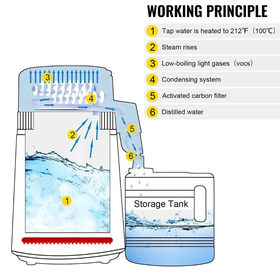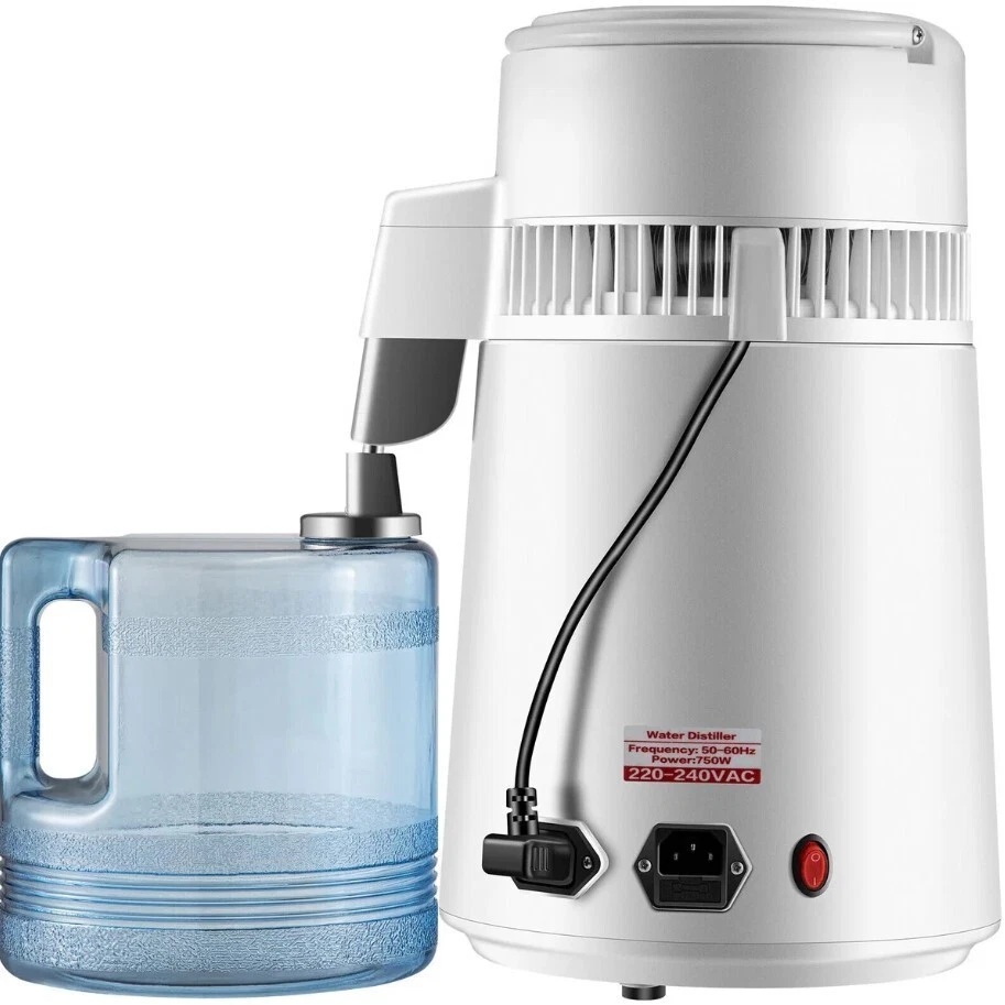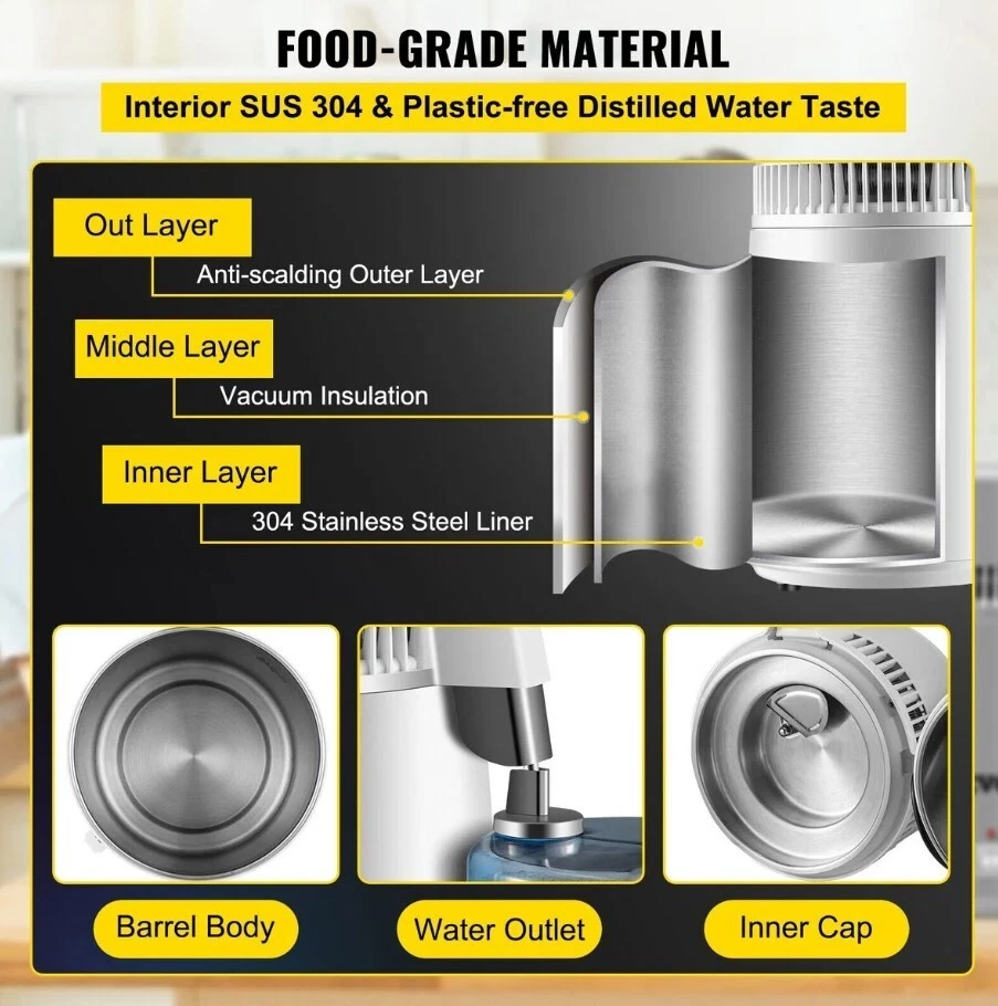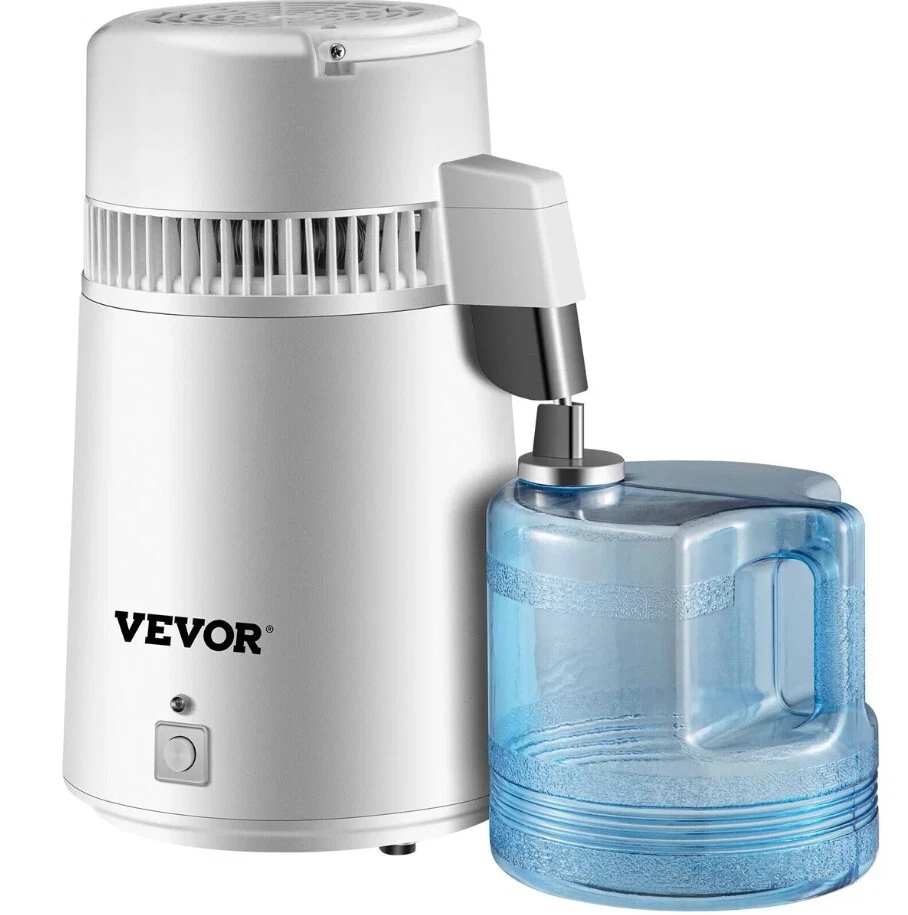 Free eBay listing template designed by dewiso.com VEVOR Pure Water Distiller Purifier Filter 1.1 Gal /4L 750W Fully Upgraded with Handle BPA Free Container Home Use White Specifications for this item Power Input: 110VAC 60Hz Output Power: 750W Inner size: 180x200mm Volume: 4L (1.06 US gal/0.88 UK gal) Distilled Max. Water/per: 1.3 L/H / 0.34 US gal/H / 0.29 UK gal/H Net weight:4Kg Size:290×290×390mm Package size:300×300×500mm Features and further details FOOD-GRADE QUALITY - 100% good-grade material. 304 stainless steel inner tank/Inner cap/Condensing coil/water outlet/water inlet, BPA-free plastic container, and aluminum fan blades. Sanitary and easy cleaning. USER-FRIENDLY OPERATION - Effectively removes contaminants for purest water! The unit will automatically shut off when the temperature reaches 115°C (239°F). A simple button for starting, no need to plug or unplug while controlling. POWERFUL PERFORMANCE - 750W powerful machine with sufficient inner container volume of 4L (1.1 US gal/0.88 UK gal). The heating elements make distillation speed over a quarter gallon per hour, distill up to 6 gallons per day. Equipped with overheat protection and dry burning-resistant protection functions. CONSIDERATE DESIGN - Easy assembly and clean-out, no need to purchase and replace dirty filter cartridges. With a portable handle on the top for easy carry. Both distillers and containers have large openings for easy access and cleaning. HOME & COMMERCIAL US - The water distiller removes most tap water impurities, ideal for distilling water, alcohol and so on. Perfect for labs, hospitals, dental clinics, offices, homes, travel, etc. Fast Heat Dissipation - Unlike plastic fan blades, our countertop water distiller is changed to aluminum fan blades to improve heat dissipation. The exhaust cap is also changed from plastic to 304 stainless steel, improving the heat dissipation capability. User-friendly Details - The upgraded home water distiller machine has a unique portable handle on the top, easy to carry. The water container has a large opening and an ergonomic handle for easy access and cleaning. We also provide free carbon packs and fruit acid cleaners without your additional purchase. Contact us We can be contacted at any time through eBay messages if you have any questions, comments or product requests. We will respond to you within 24 hours and do our best to help you out! We encourage our customers to contact us with any questions or concerns! We'd like to be sure you are completely satisfied with your purchase. Payment We accept Paypal, Master Card etc... Shipping We offer FREE shipping on all orders!Please allow 4-7 business days for the package to arrive, We use a selection of shipping services such as UPS, FedEx, USPS etc. We only ship to the lower 48 states, no APO/FPO addresses or PO Boxes allowed. We will provide an online tracking number to you once the item has been shipped. It may take a few business days for our automated system to process the tracking number onto eBay. However, this will not affect the shipping times. Disclaimer We take our reputation seriously. If you have any questions or concerns, please contact us and we will respond back to your message within 24 hours. Hopefully we' ll be your best choice!
